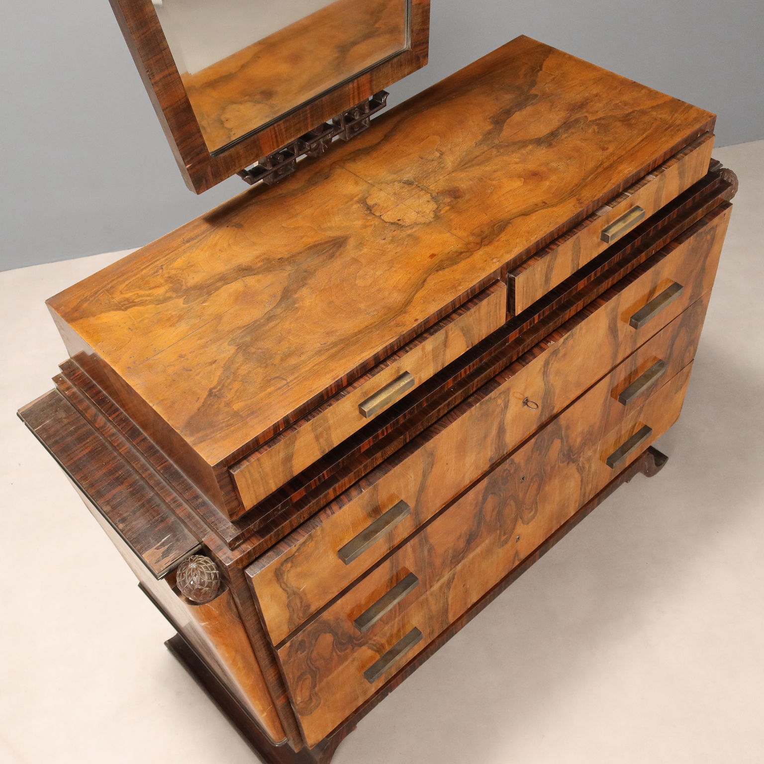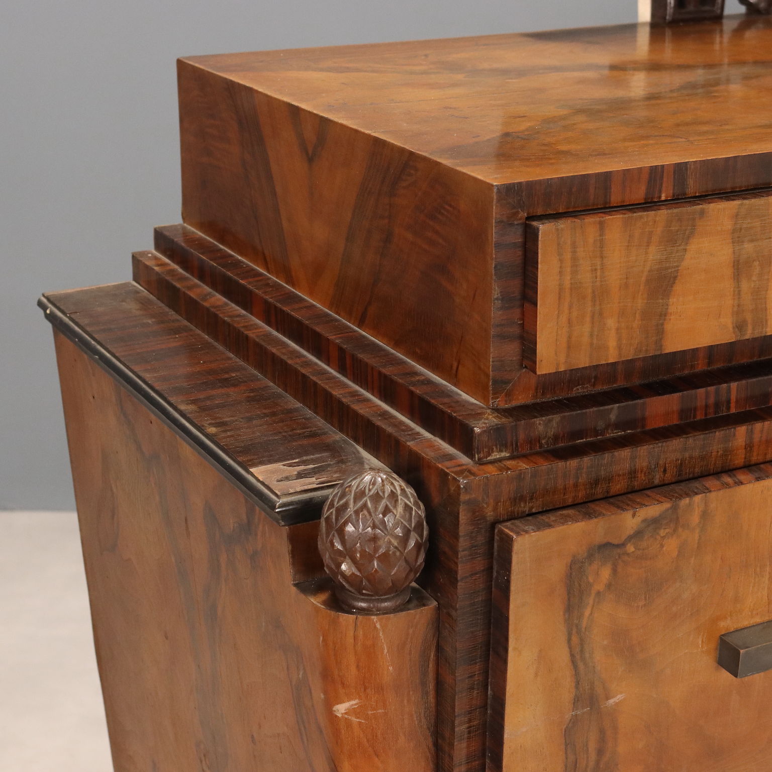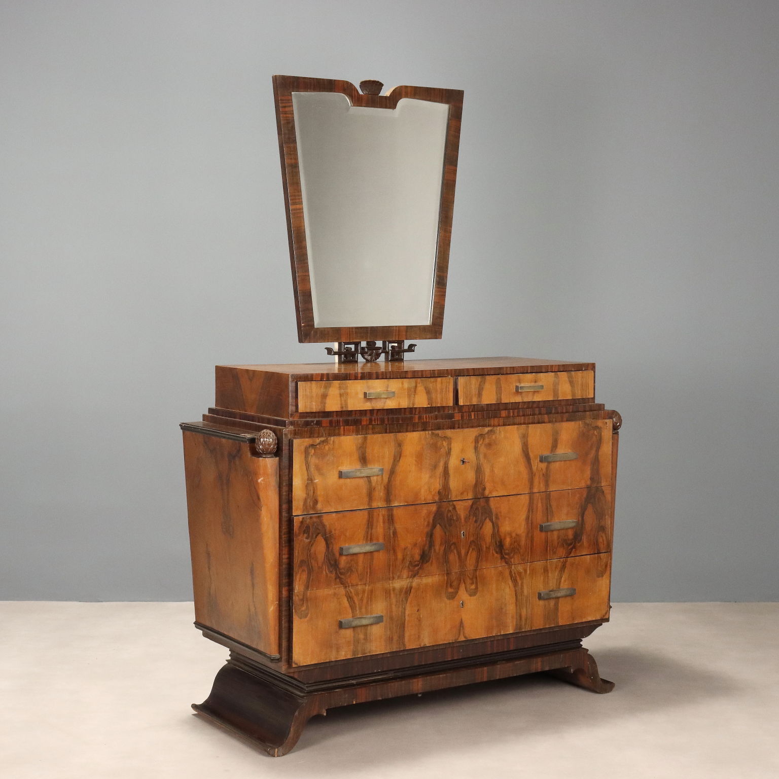 Comò Art Decò con specchio, impiallacciatura in piuma di noce e palissandro. Fronte a tre cassetti, più due piccoli sotto piano, montanti arrotondati culminanti con pigne. Specchio bisellato, maniglie in metallo brunito, mancanze. Italia, prima metà XX Secolo.