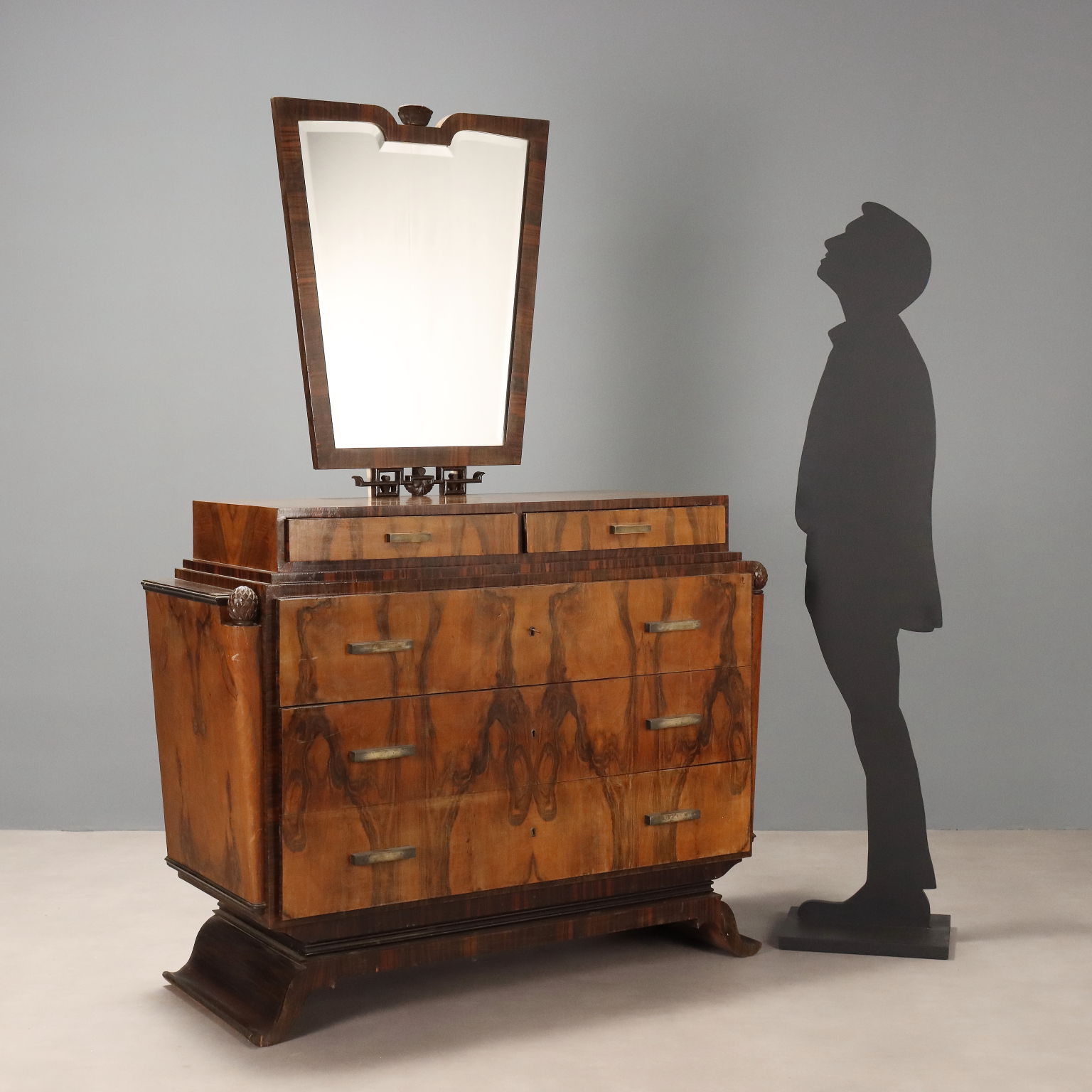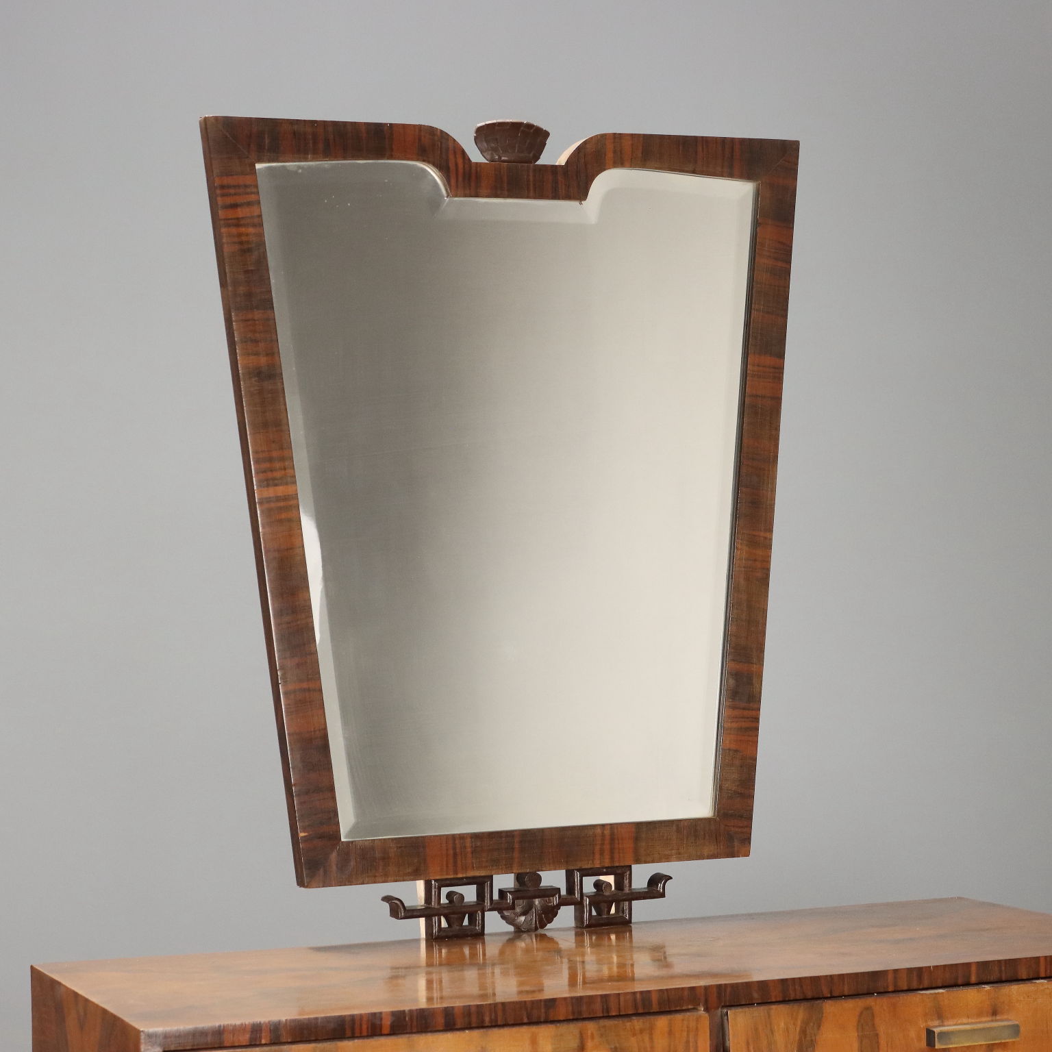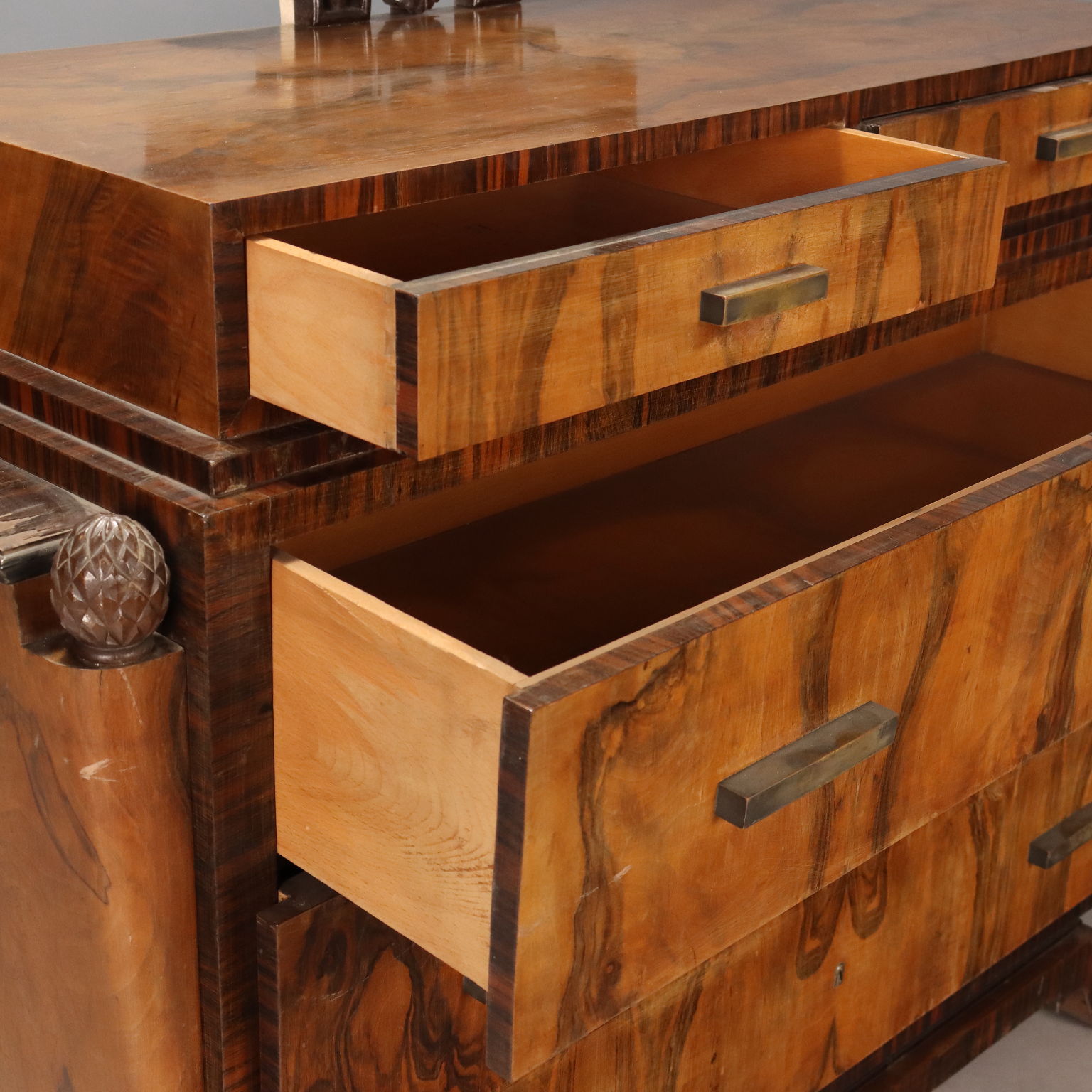 Comò Art Decò con specchio, impiallacciatura in piuma di noce e palissandro. Fronte a tre cassetti, più due piccoli sotto piano, montanti arrotondati culminanti con pigne. Specchio bisellato, maniglie in metallo brunito, mancanze. Italia, prima metà XX Secolo.