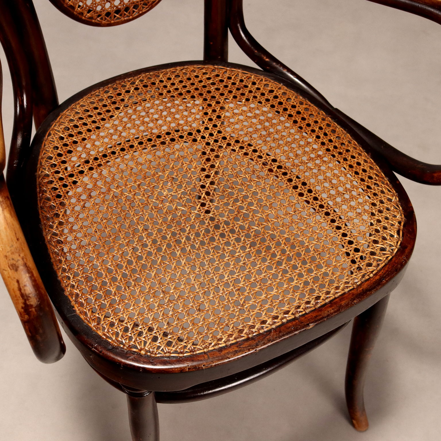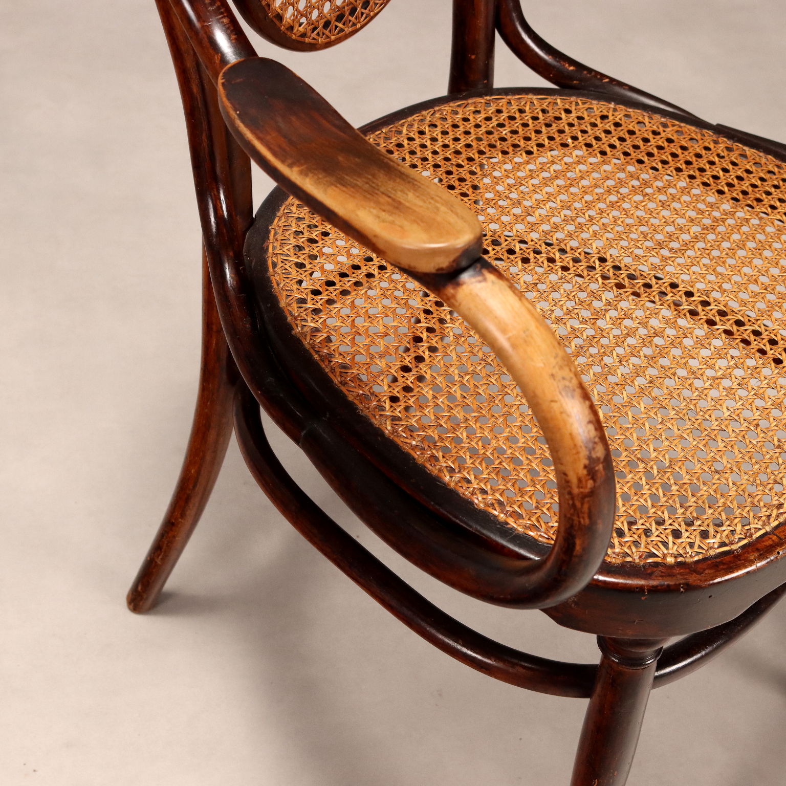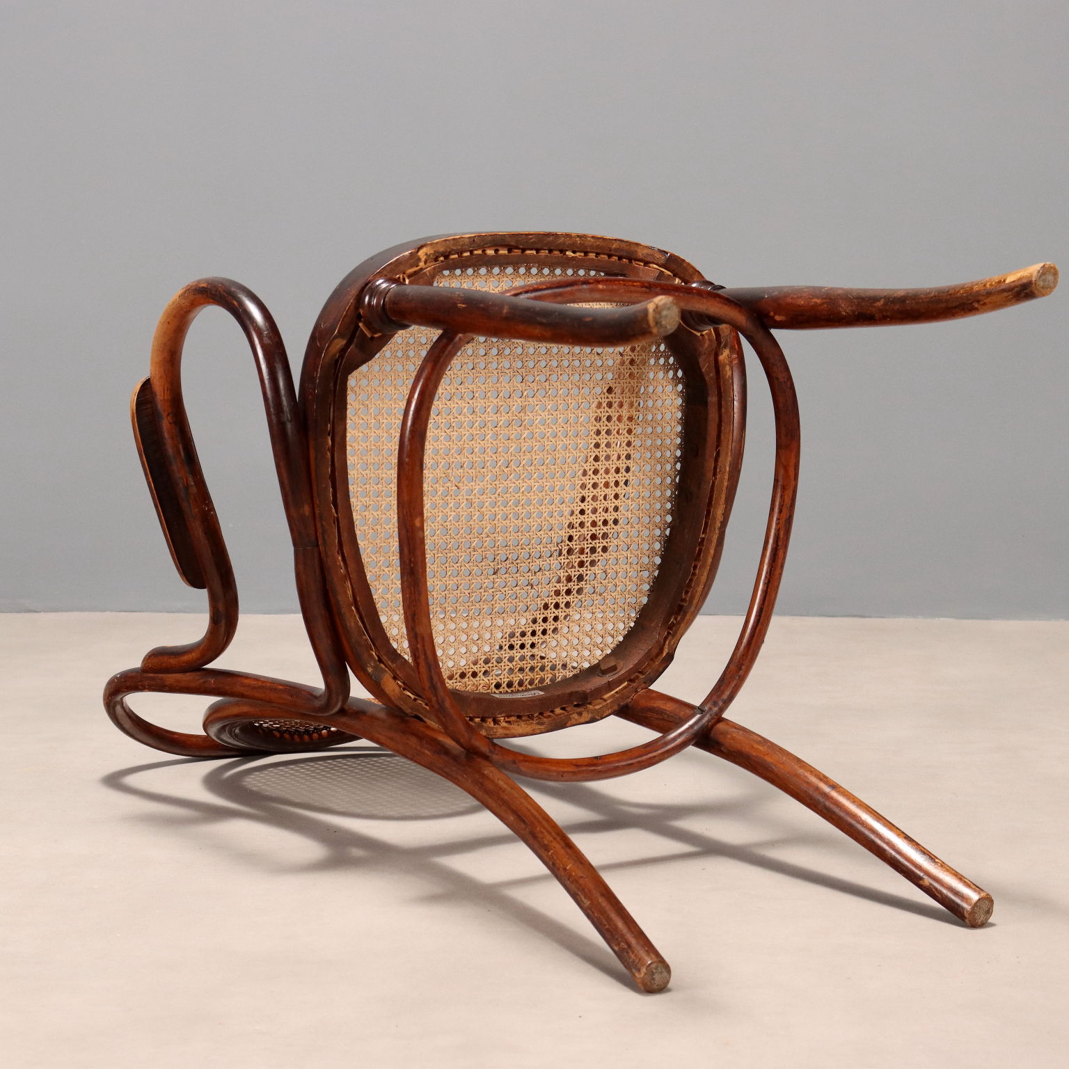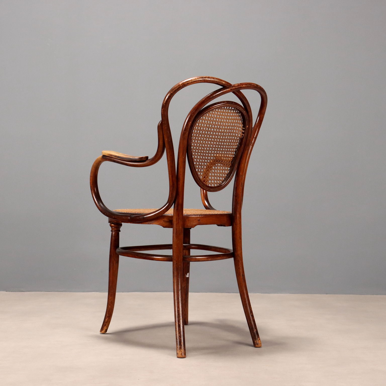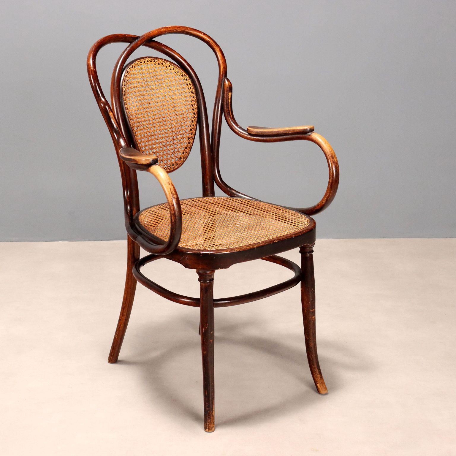 Poltroncina in faggio curvato tinto noce, Jacob & Josef Kohn. Seduta e schienale incannucciati, leggermente sfondato nello schienale. Austria, fine XIX Secolo.