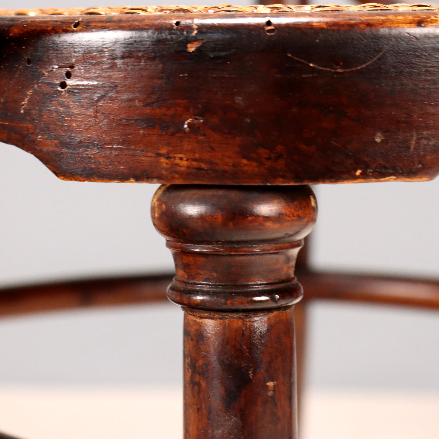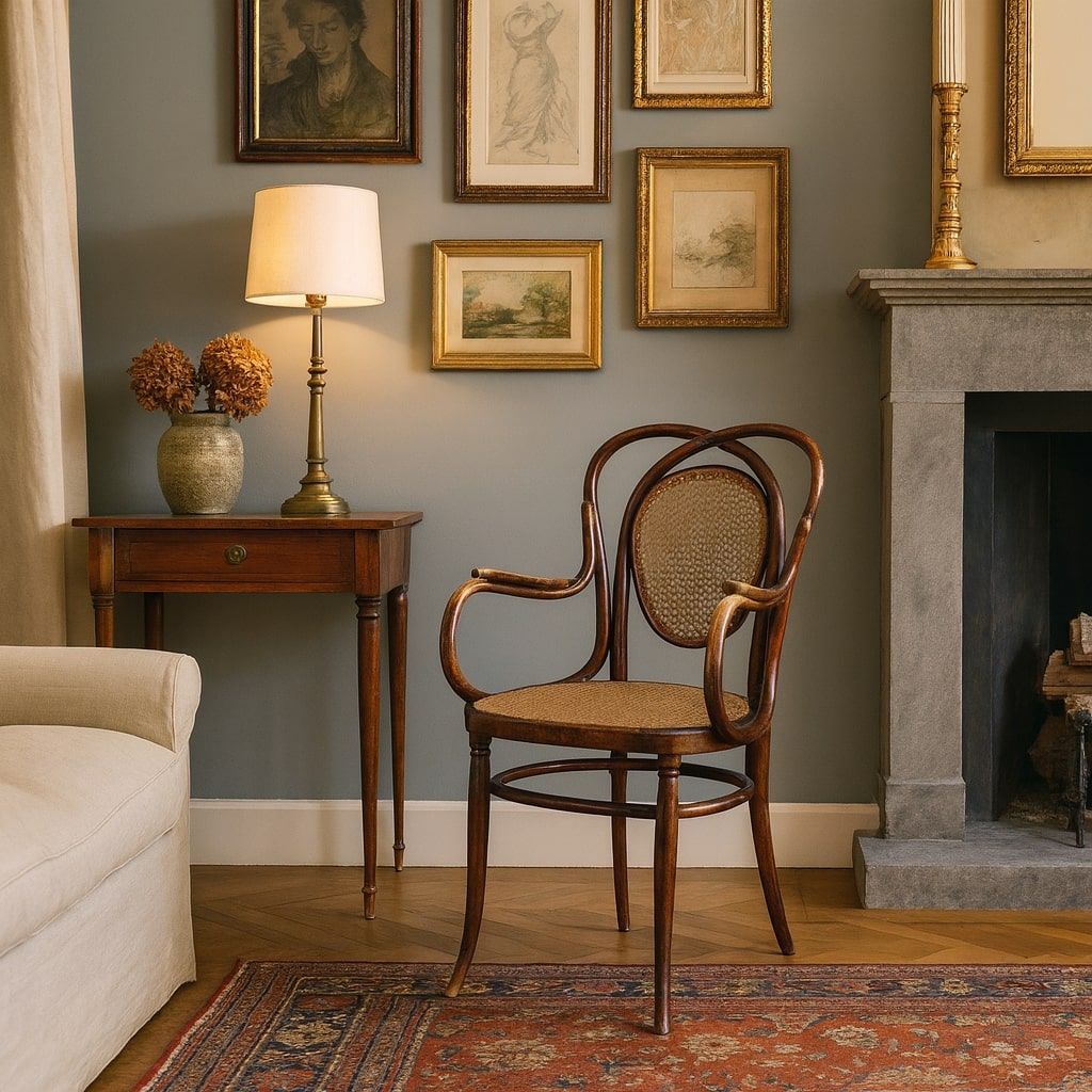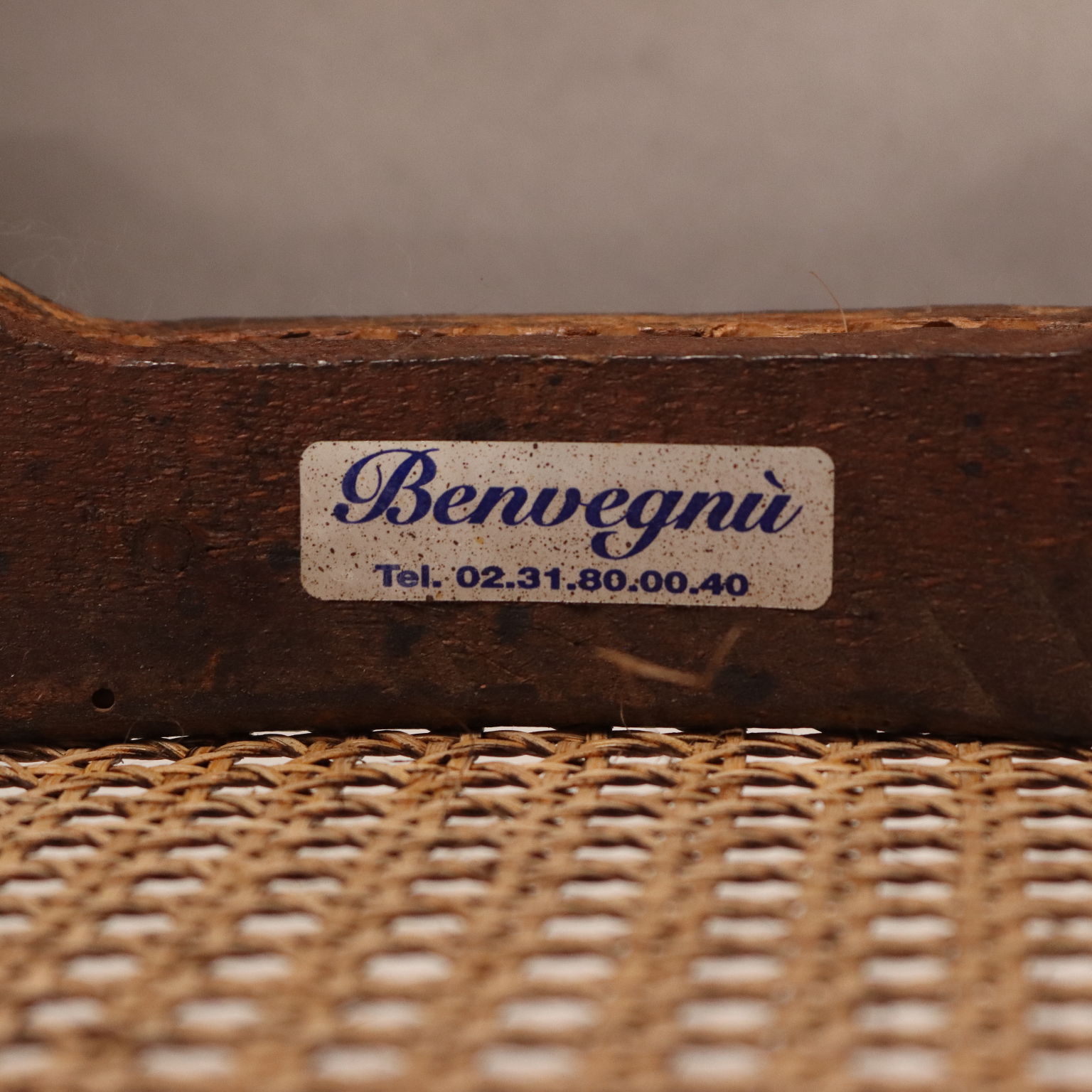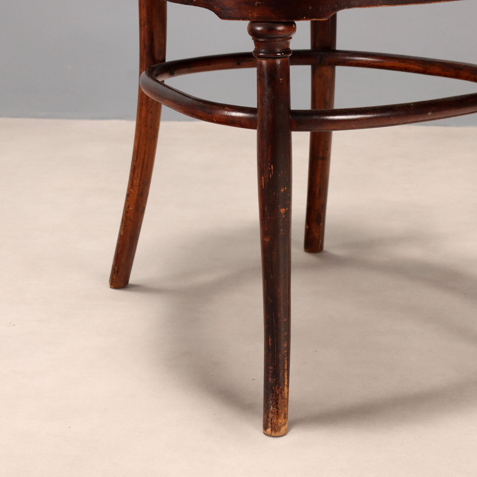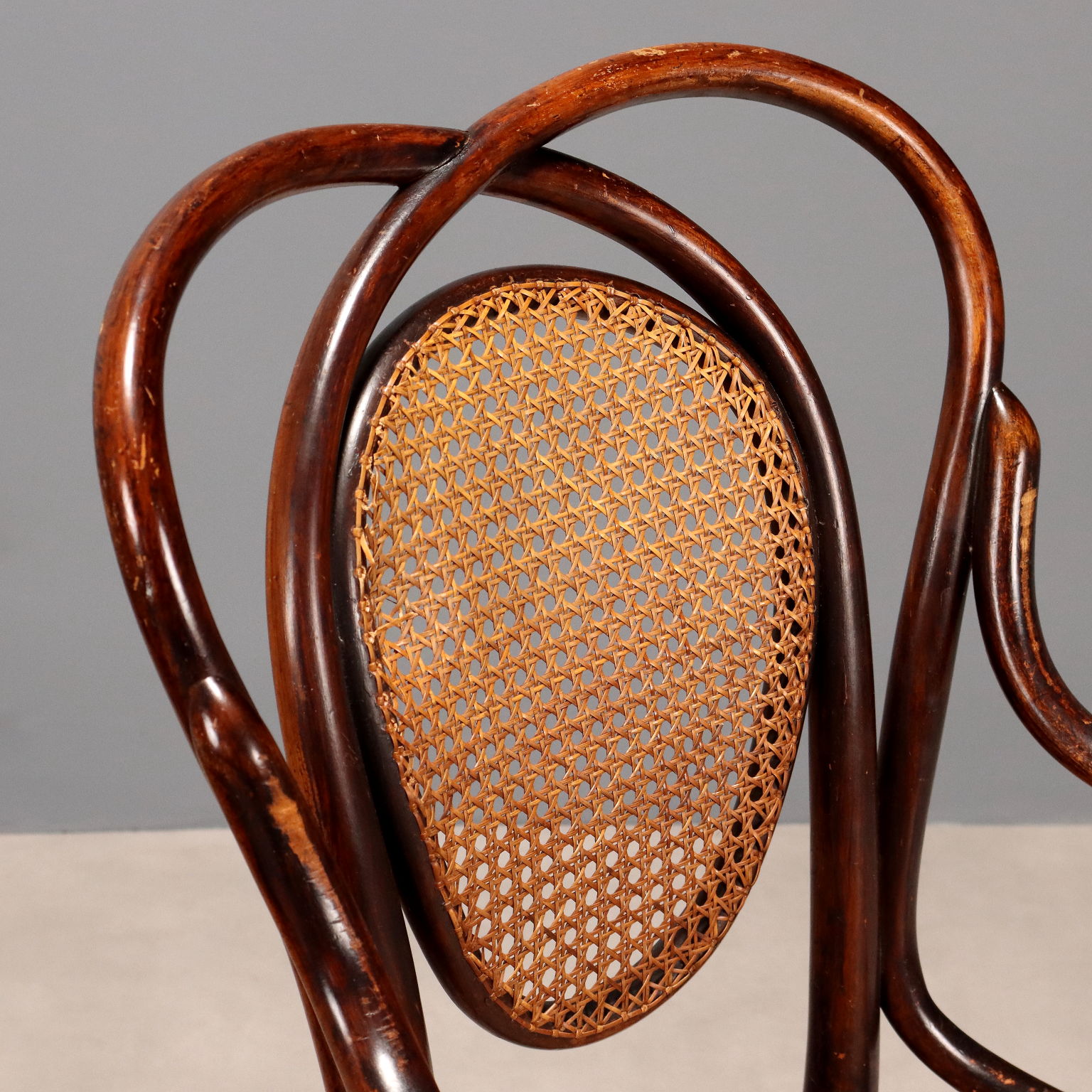 Poltroncina in faggio curvato tinto noce, Jacob & Josef Kohn. Seduta e schienale incannucciati, leggermente sfondato nello schienale. Austria, fine XIX Secolo.