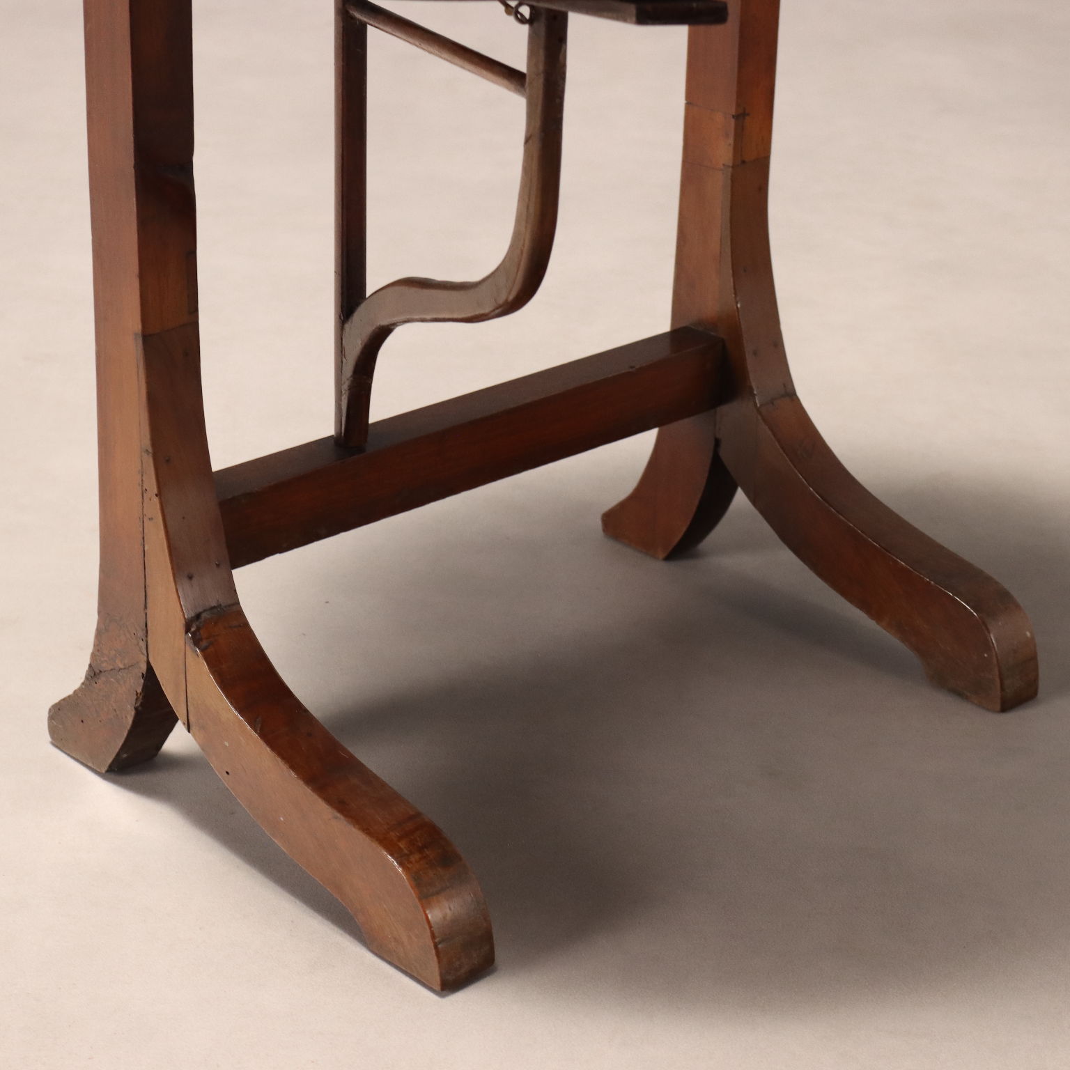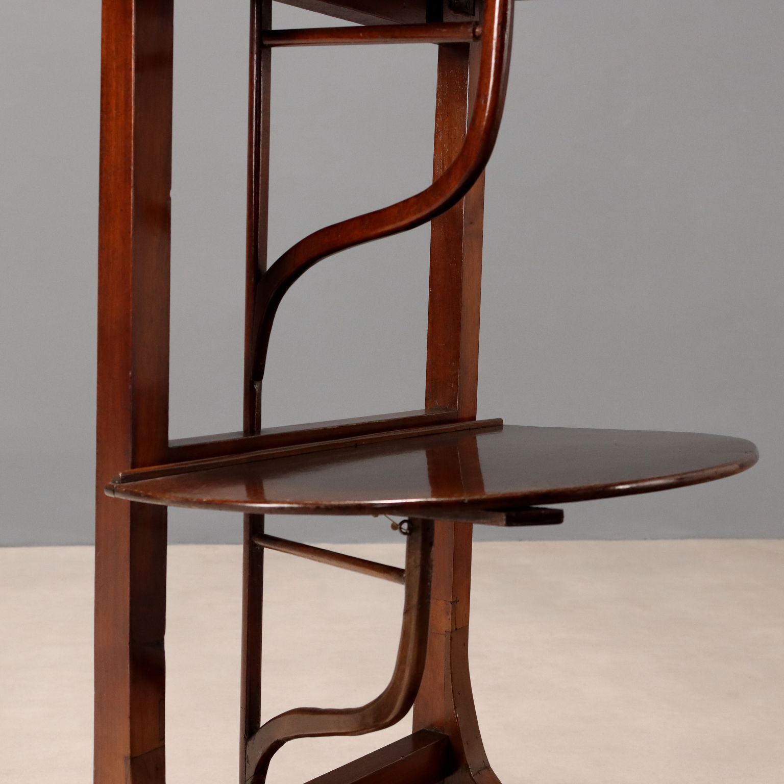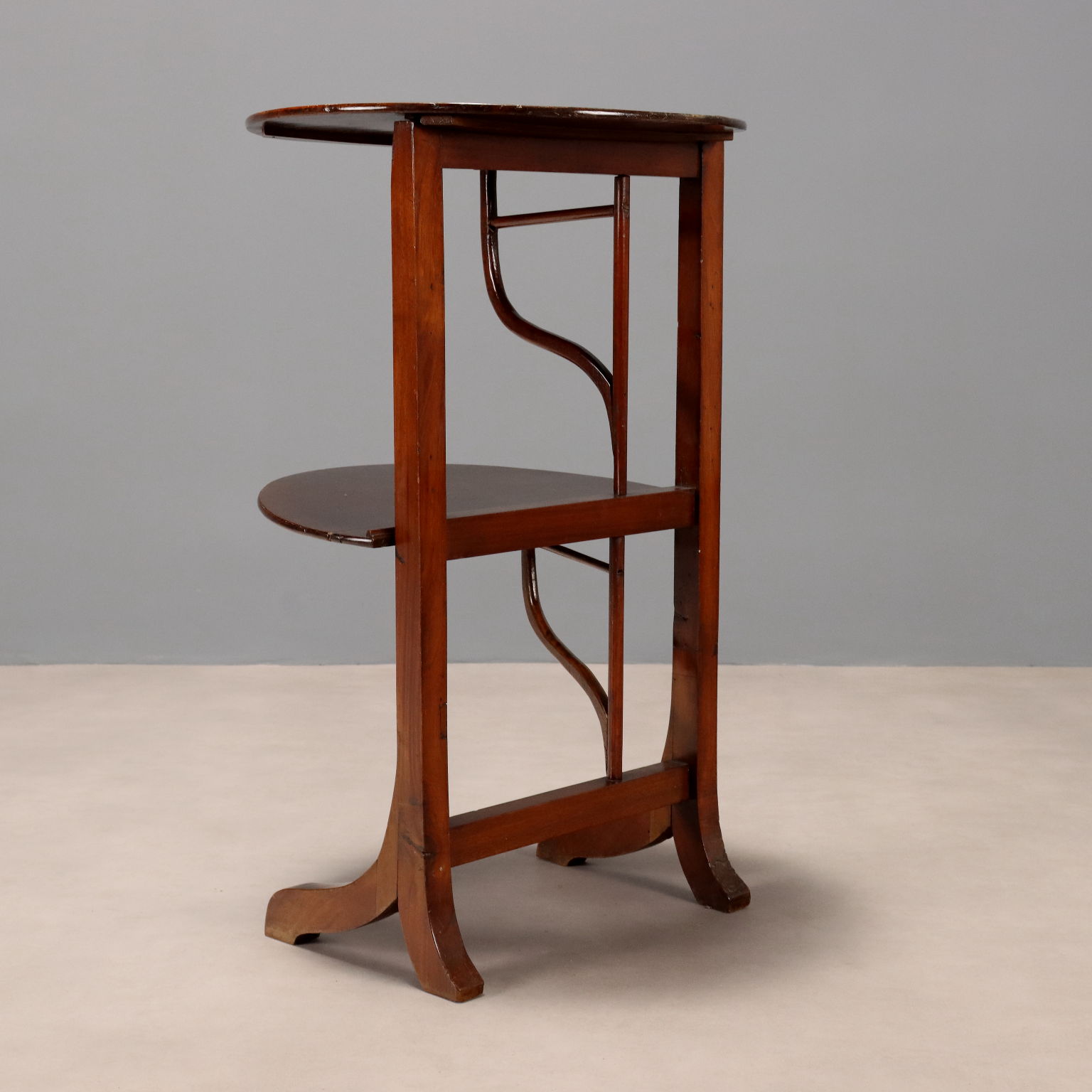 Piccolo etagere in noce, piani a ribalta, il primo rotondo e il sottostante a semicerchio, sorretti da gambe laterali poggianti su piedi mossi. Italia, XIX Secolo.