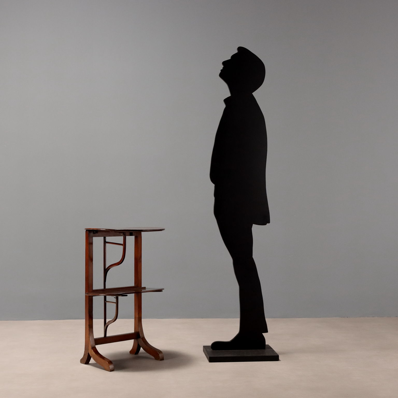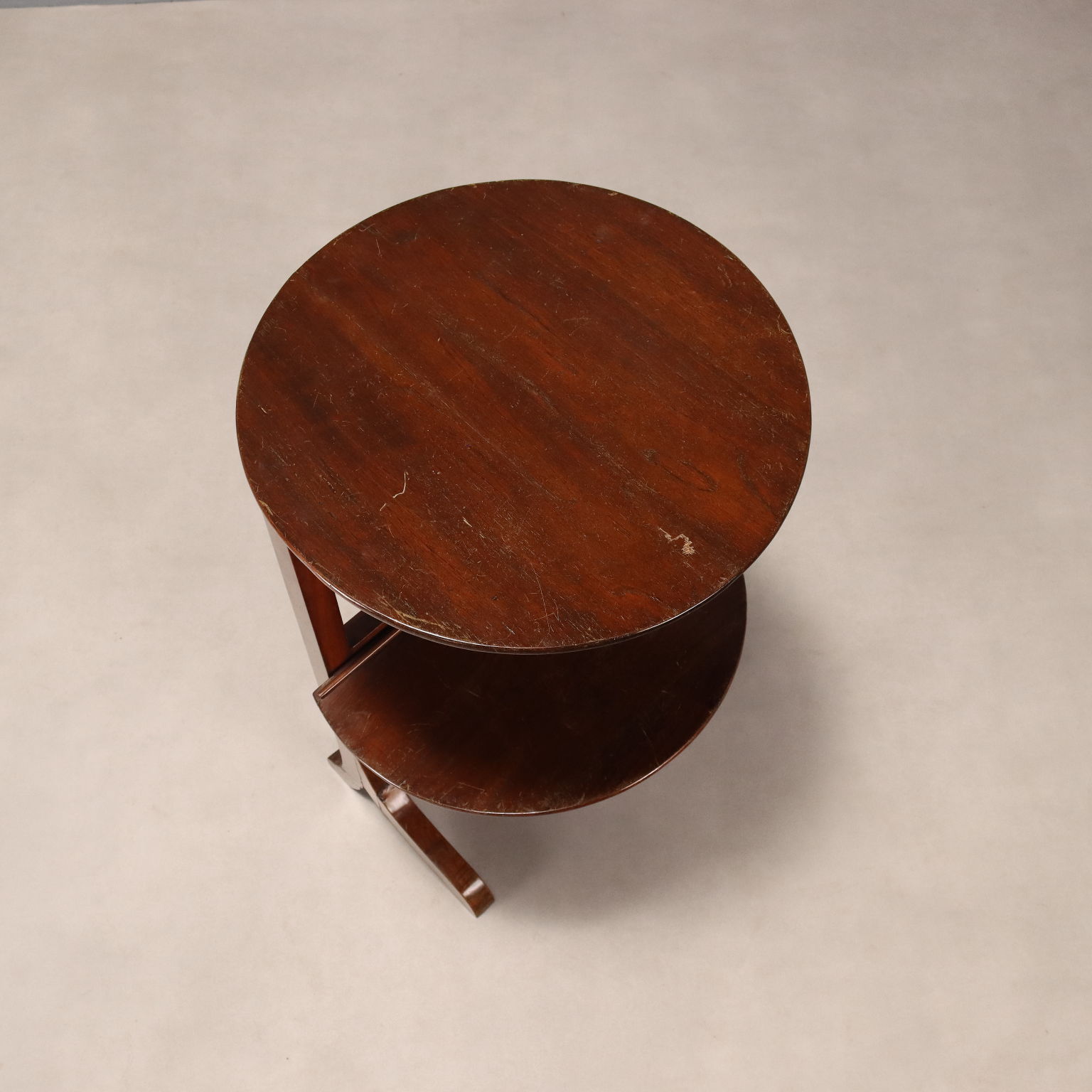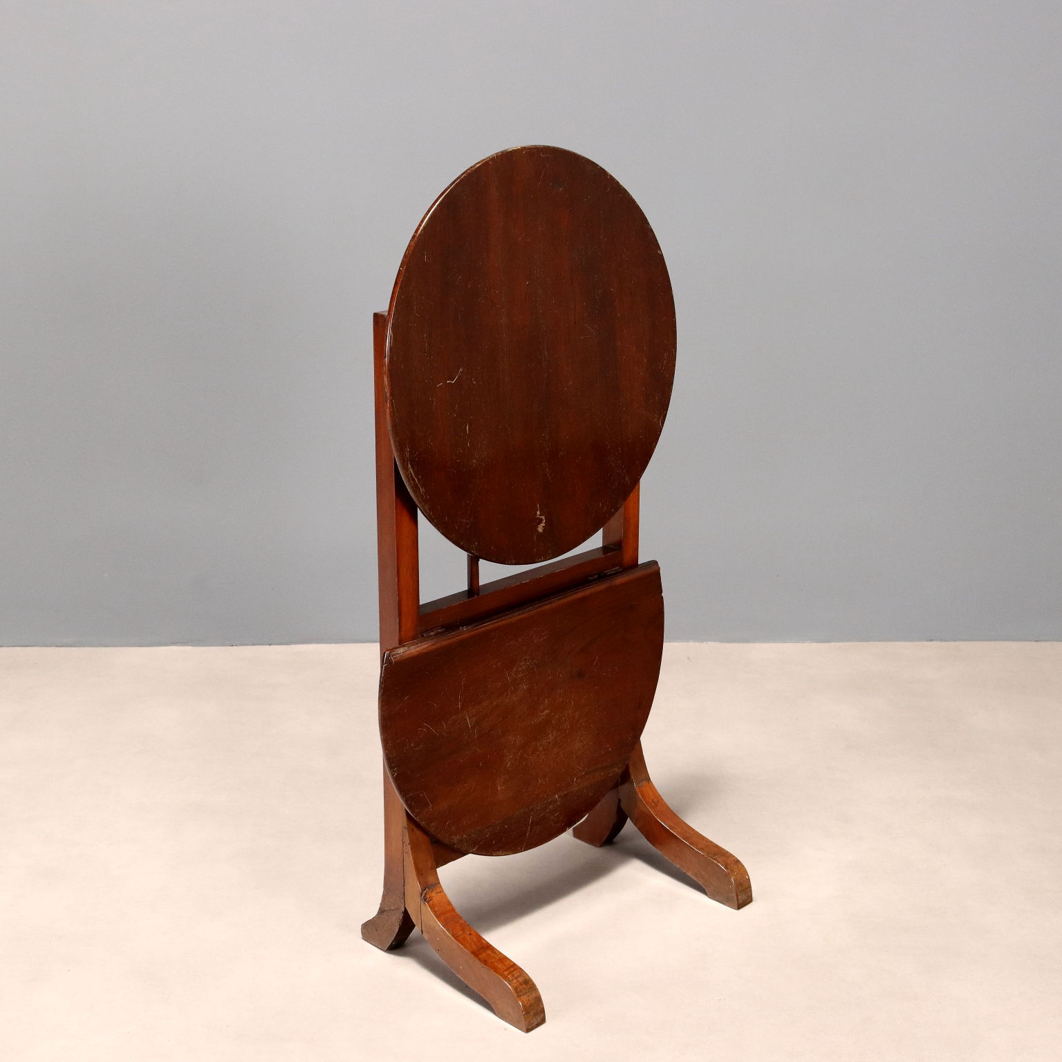 Piccolo etagere in noce, piani a ribalta, il primo rotondo e il sottostante a semicerchio, sorretti da gambe laterali poggianti su piedi mossi. Italia, XIX Secolo.