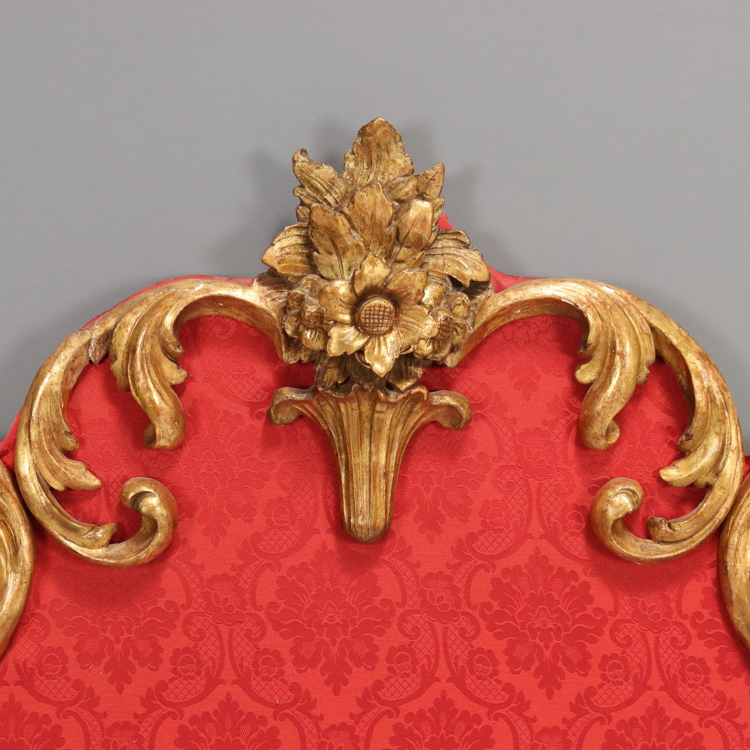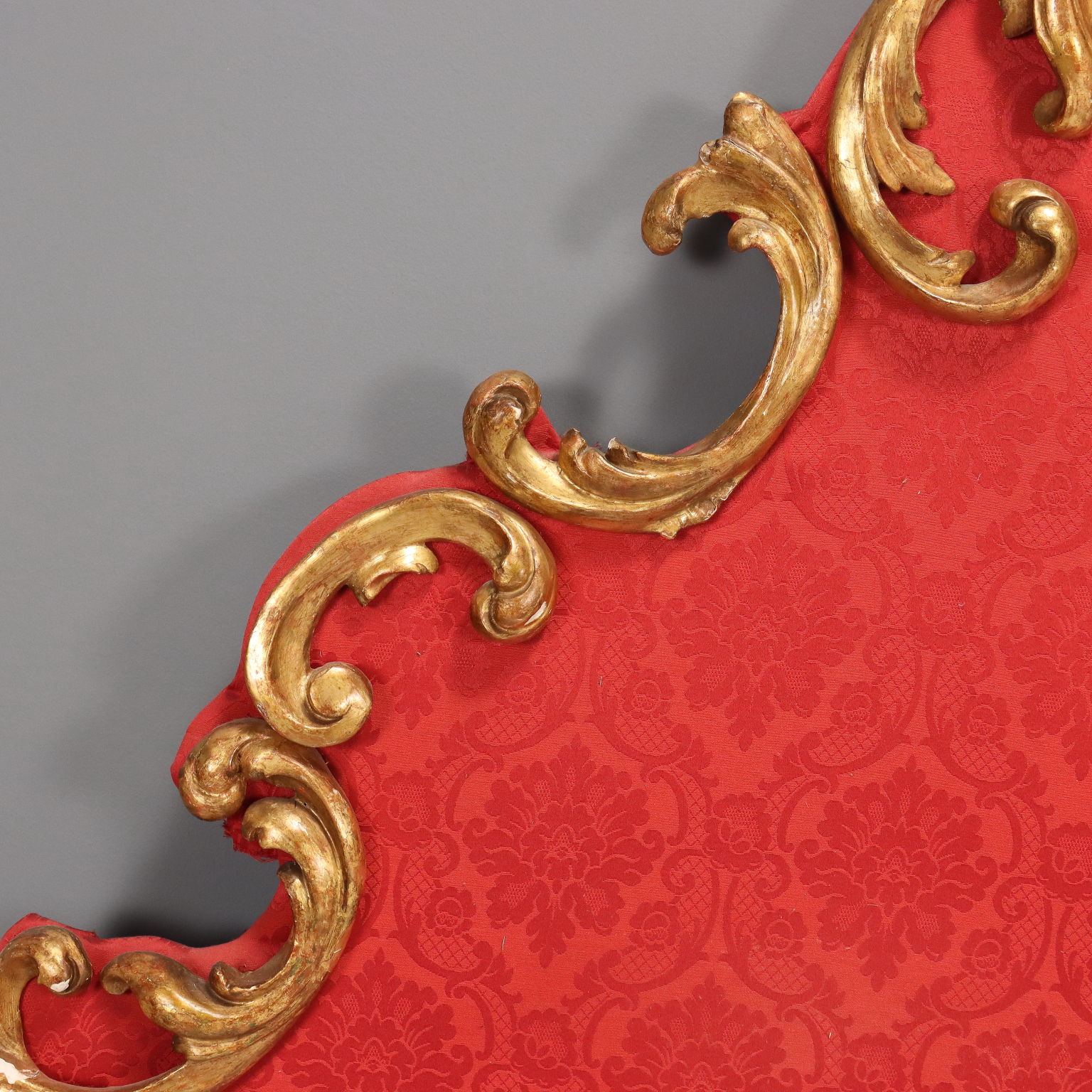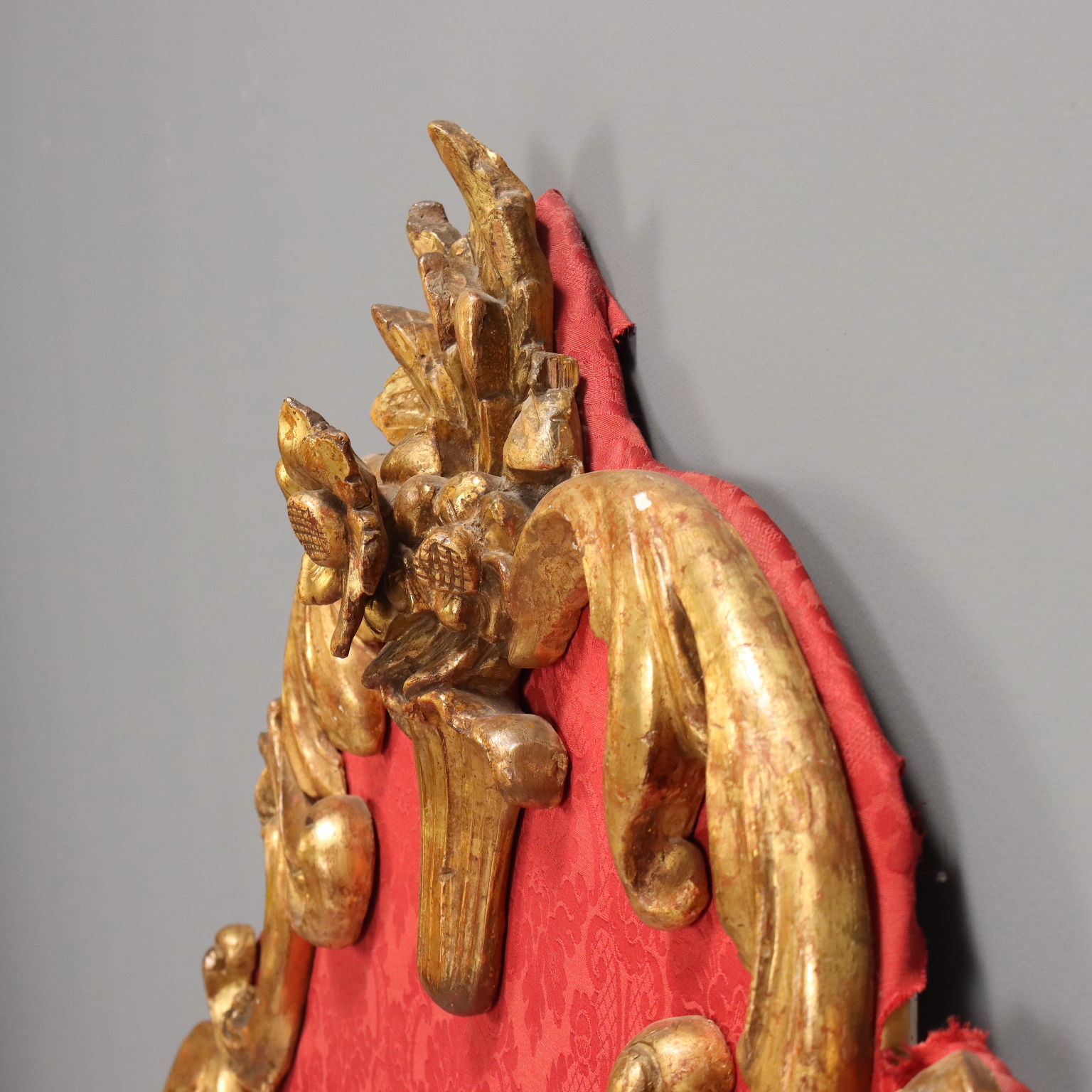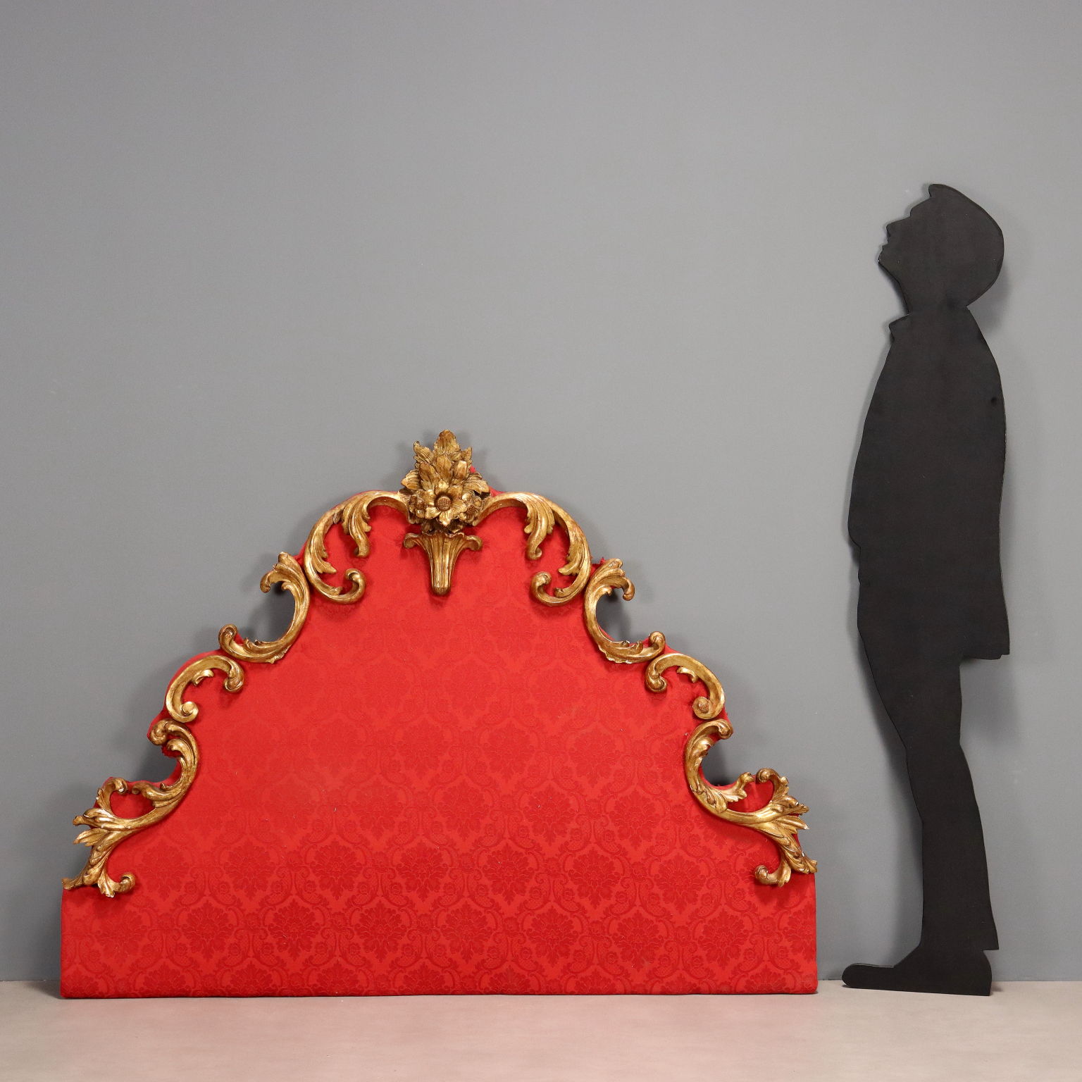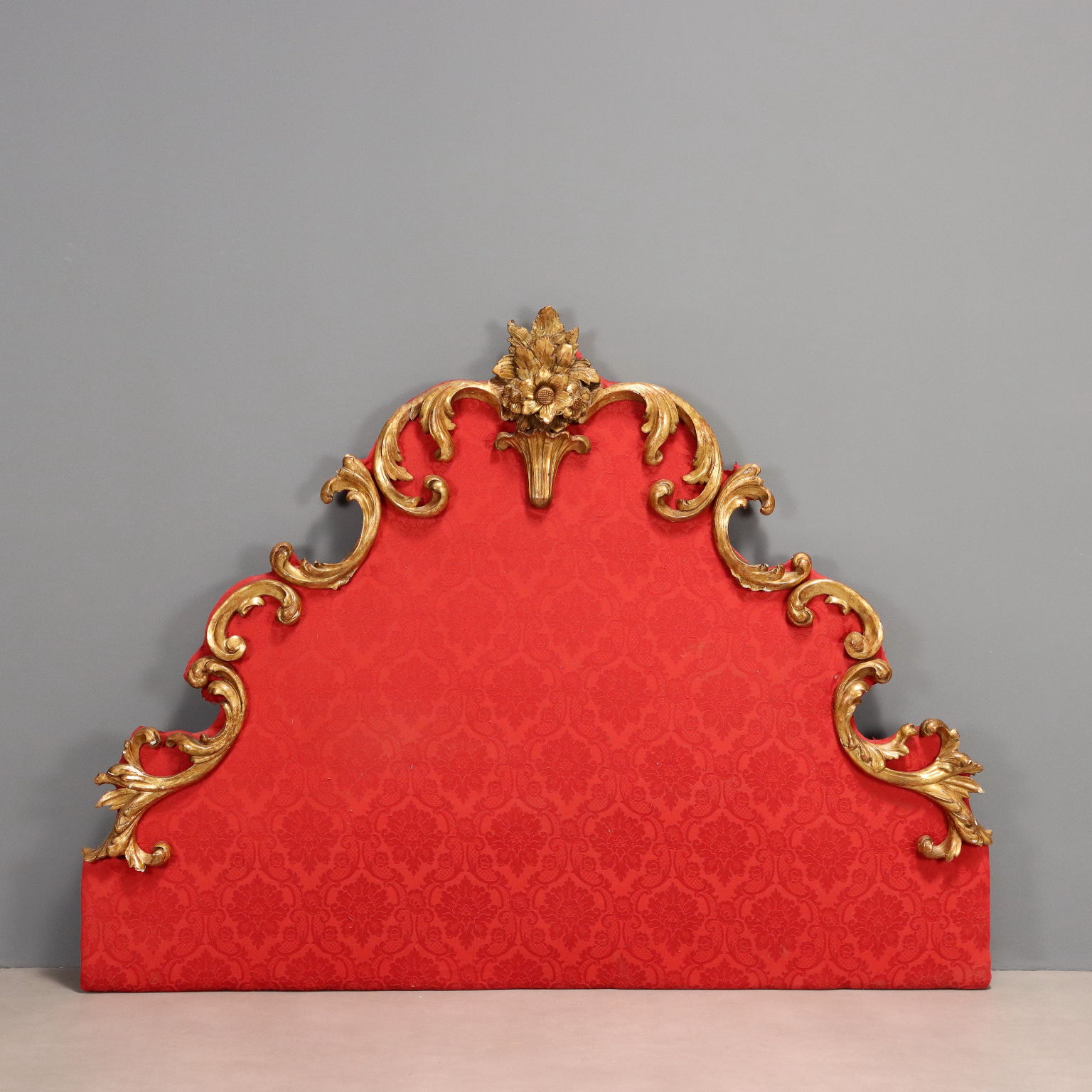 Testata di letto composta da pannello in legno rivestito in tessuto, applicazioni in legno dorato e intagliato a volute e riccioli, vaso di fiori nella cimasa. Italia, XIX Secolo.