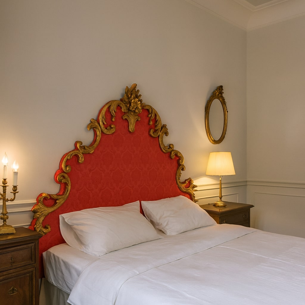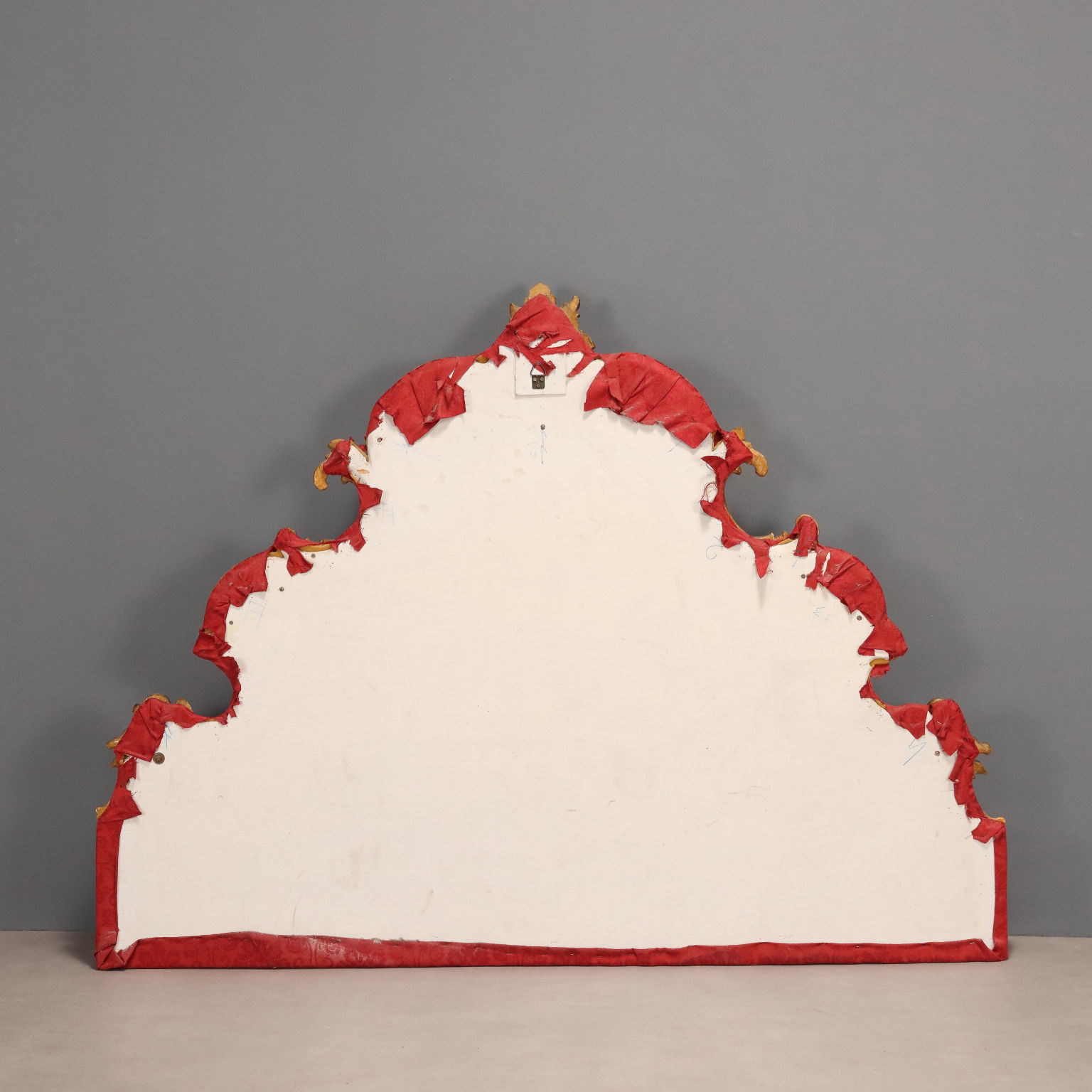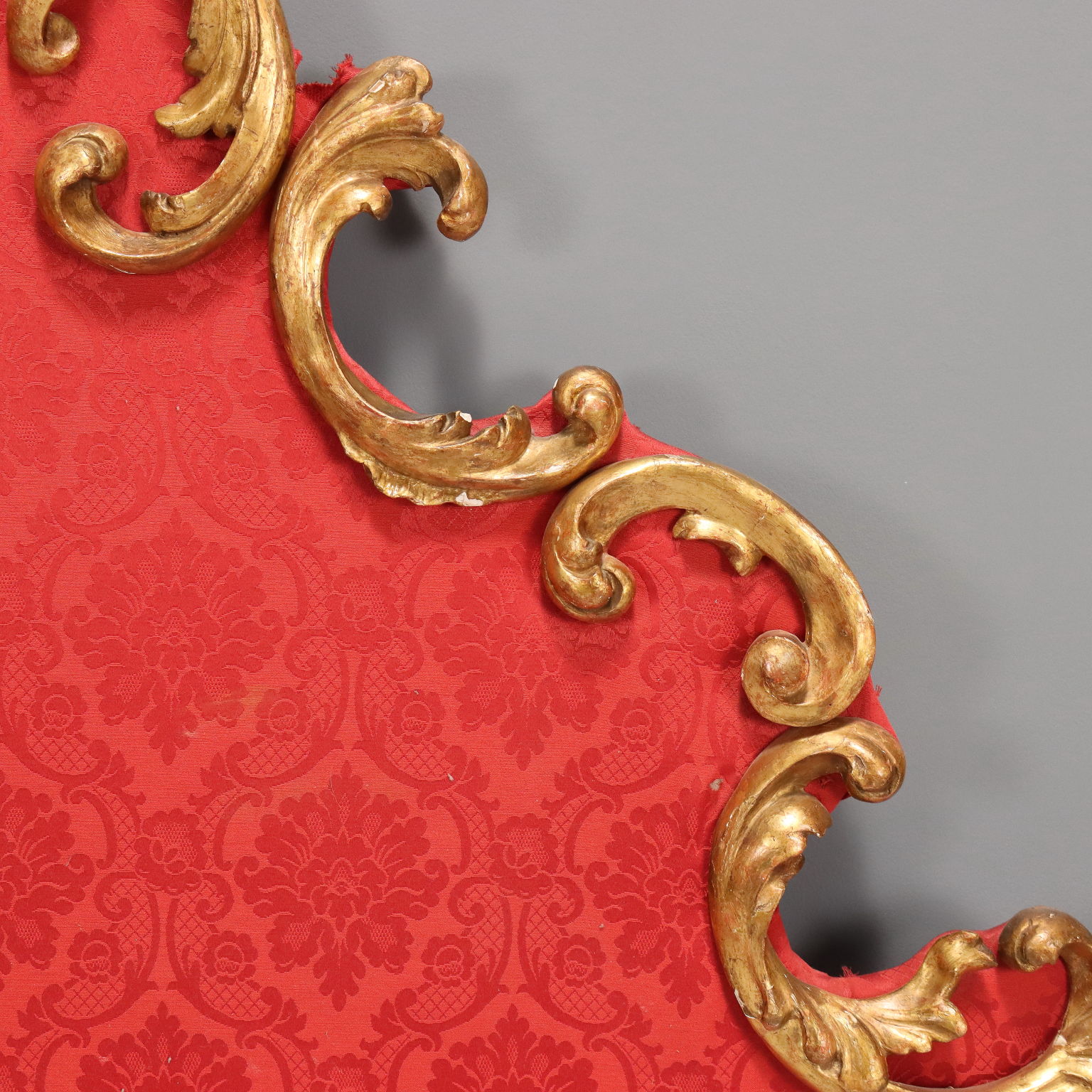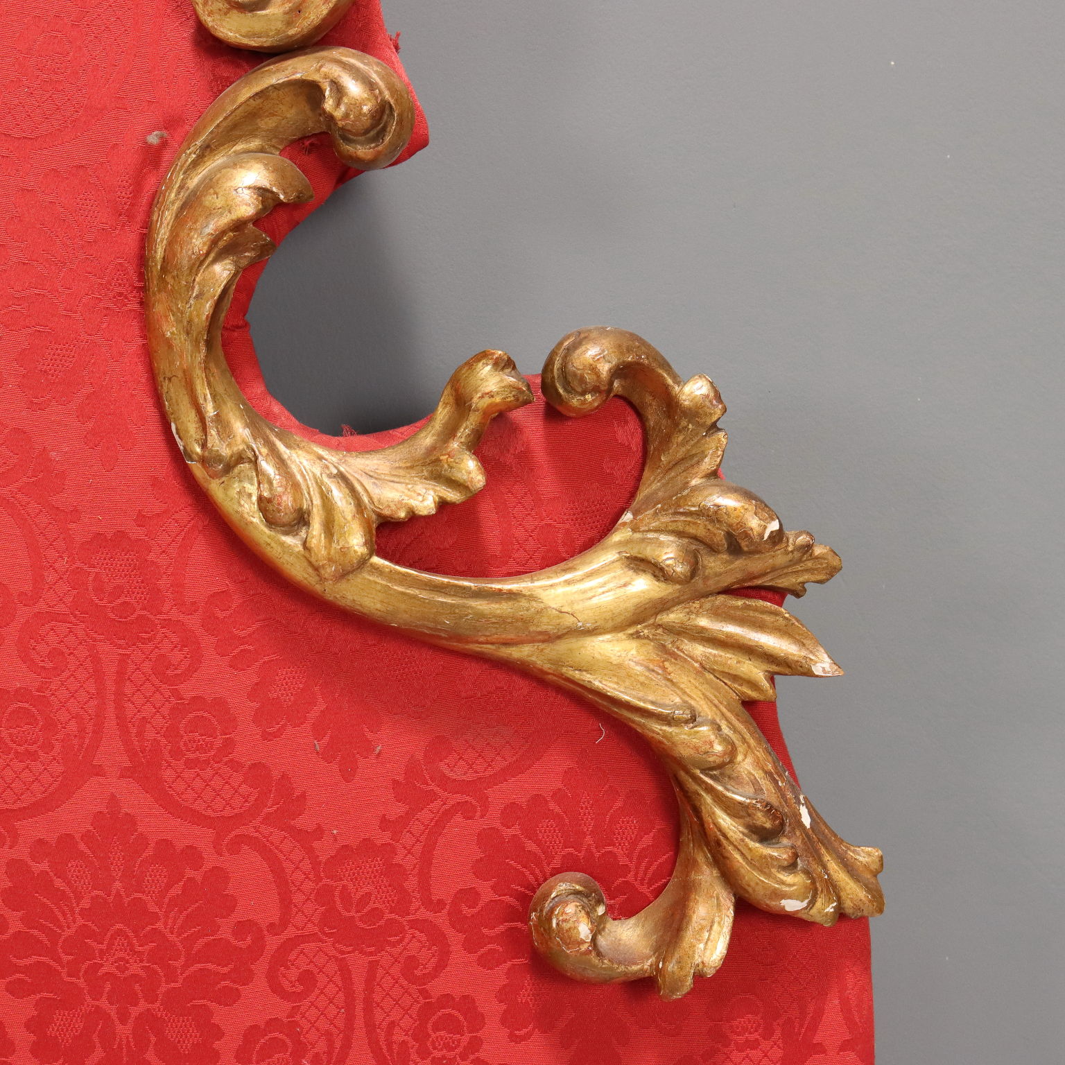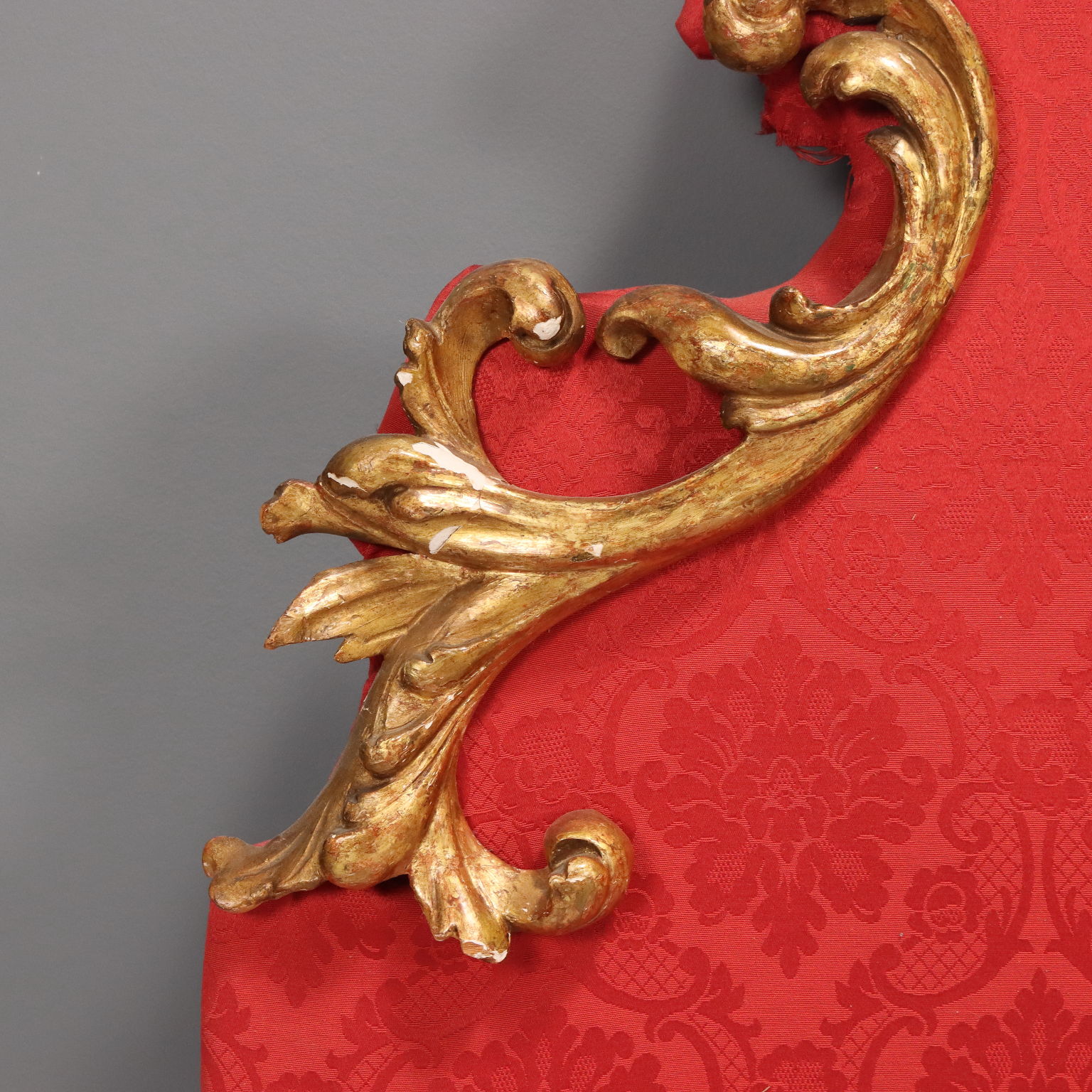 Testata di letto composta da pannello in legno rivestito in tessuto, applicazioni in legno dorato e intagliato a volute e riccioli, vaso di fiori nella cimasa. Italia, XIX Secolo.