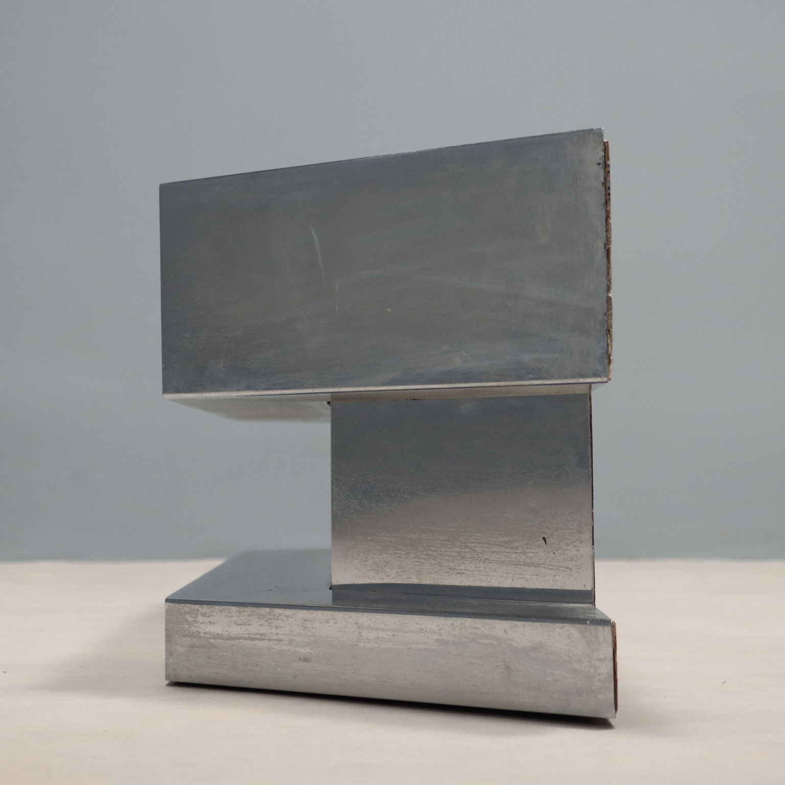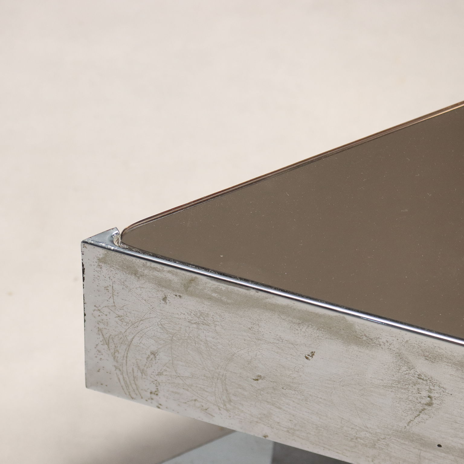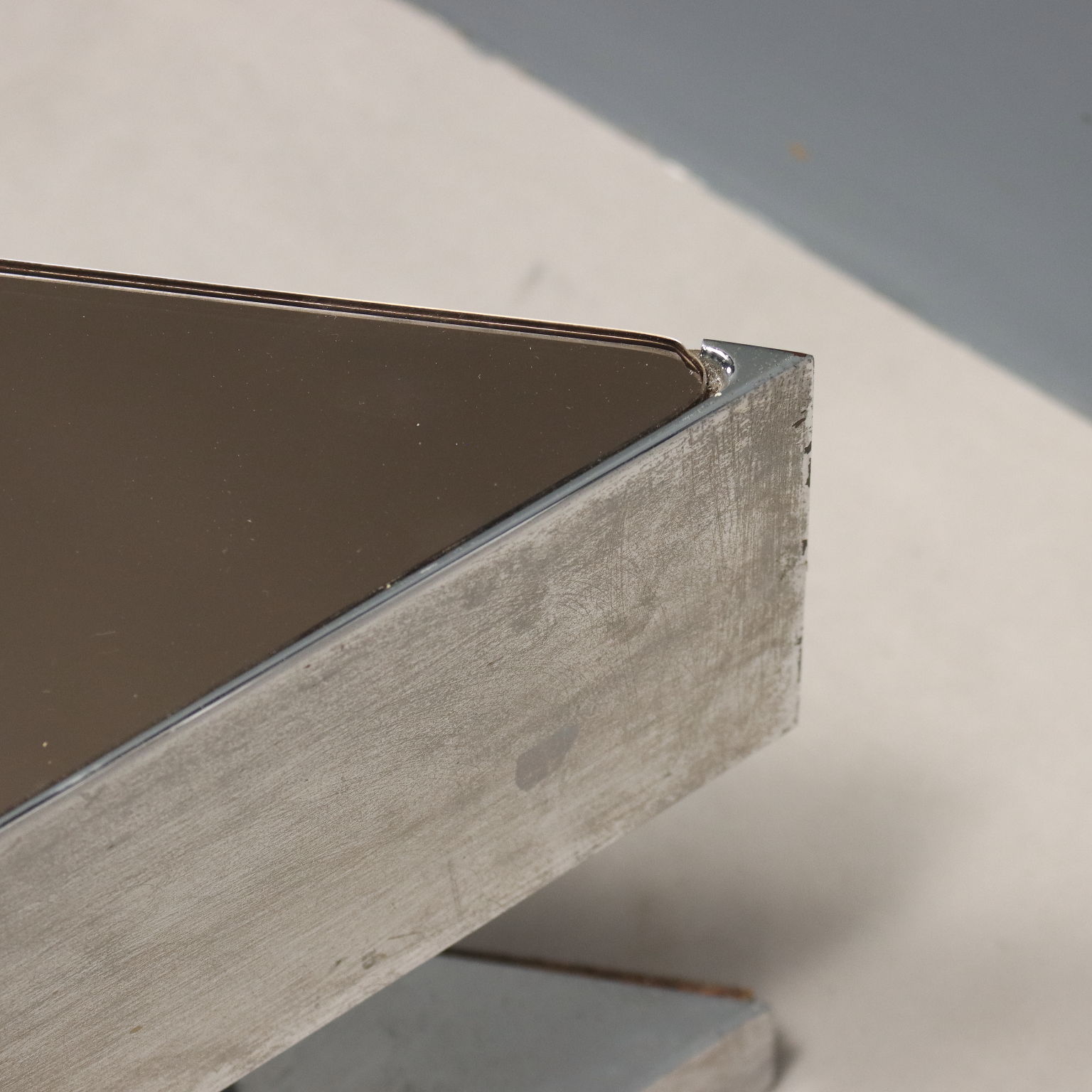 Arredo vintage di forma trapezoidale realizzato in metallo e vetro nero retrotrattato.