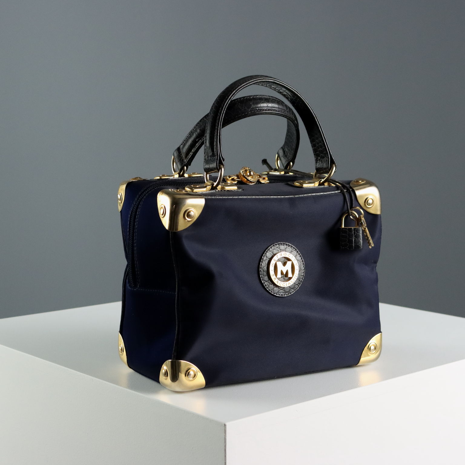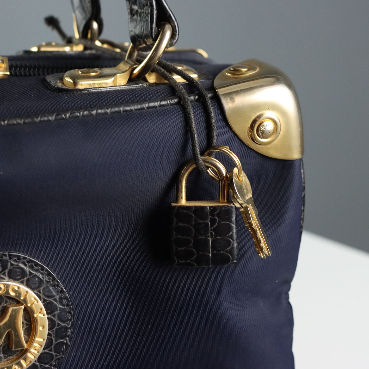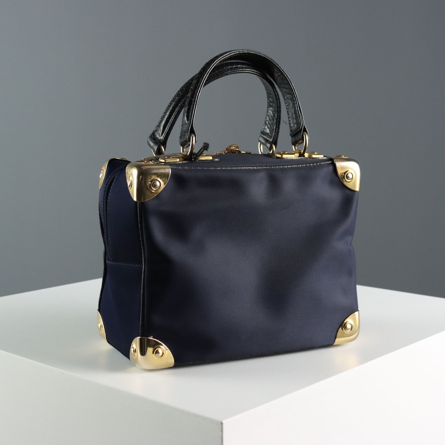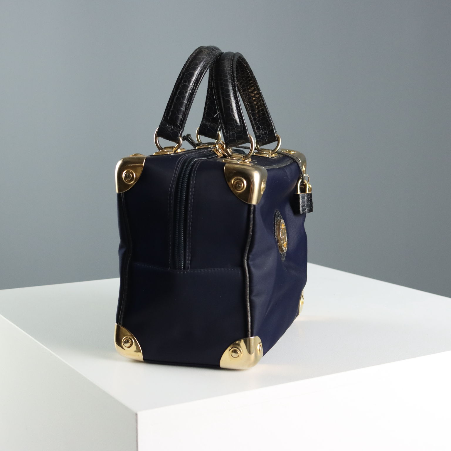 Borsa a mano modello bauletto semirigido, in tessuto blu con profili e manici in pelle effetto rettile. Dettagli in metallo dorato. Chiusura con cerniera e lucchetto con chiavi. Interno in pelle con tasca e targhetta con codice progressivo. L'articolo è in buone condizioni generali, presenta solamente, come da foto, una lieve piegatura.