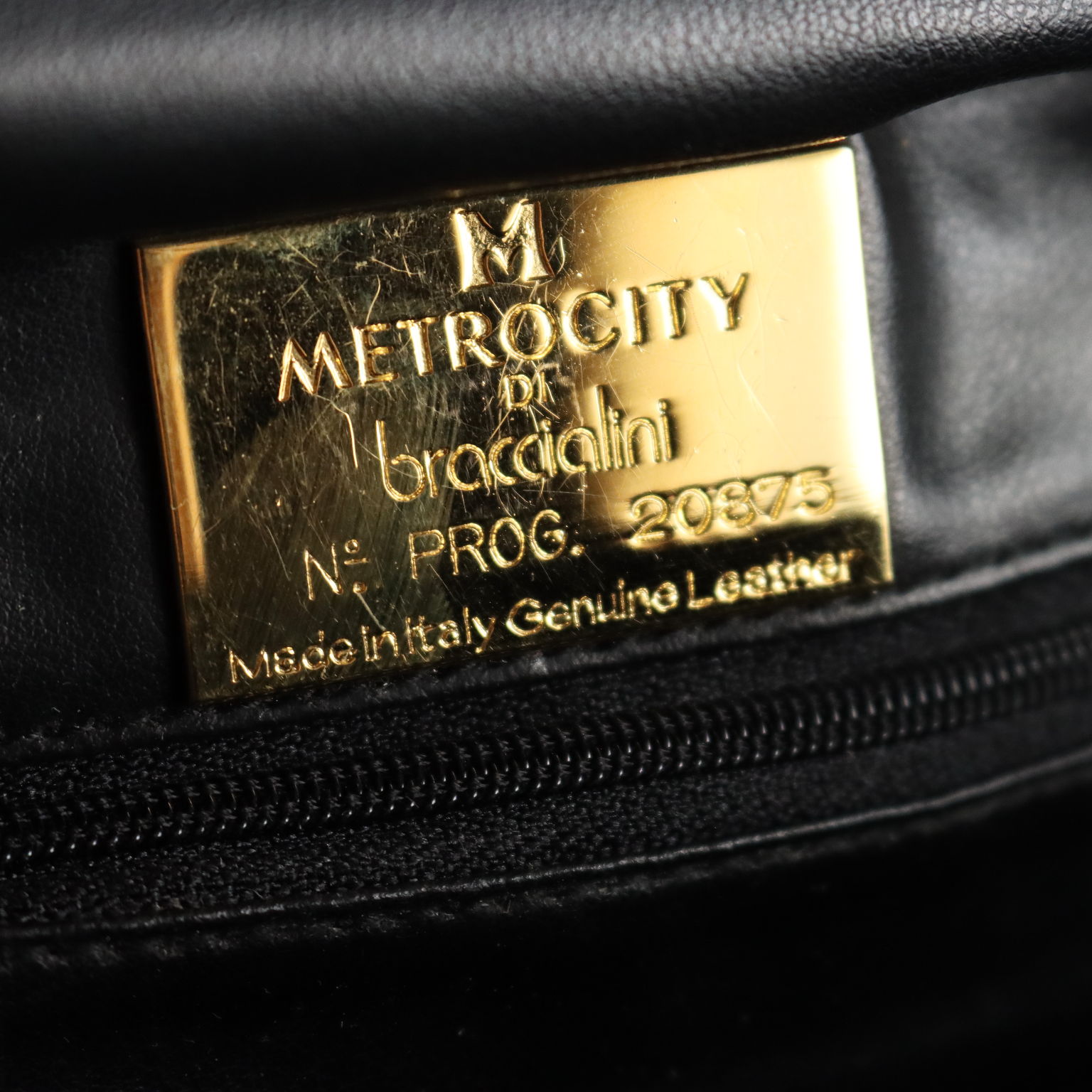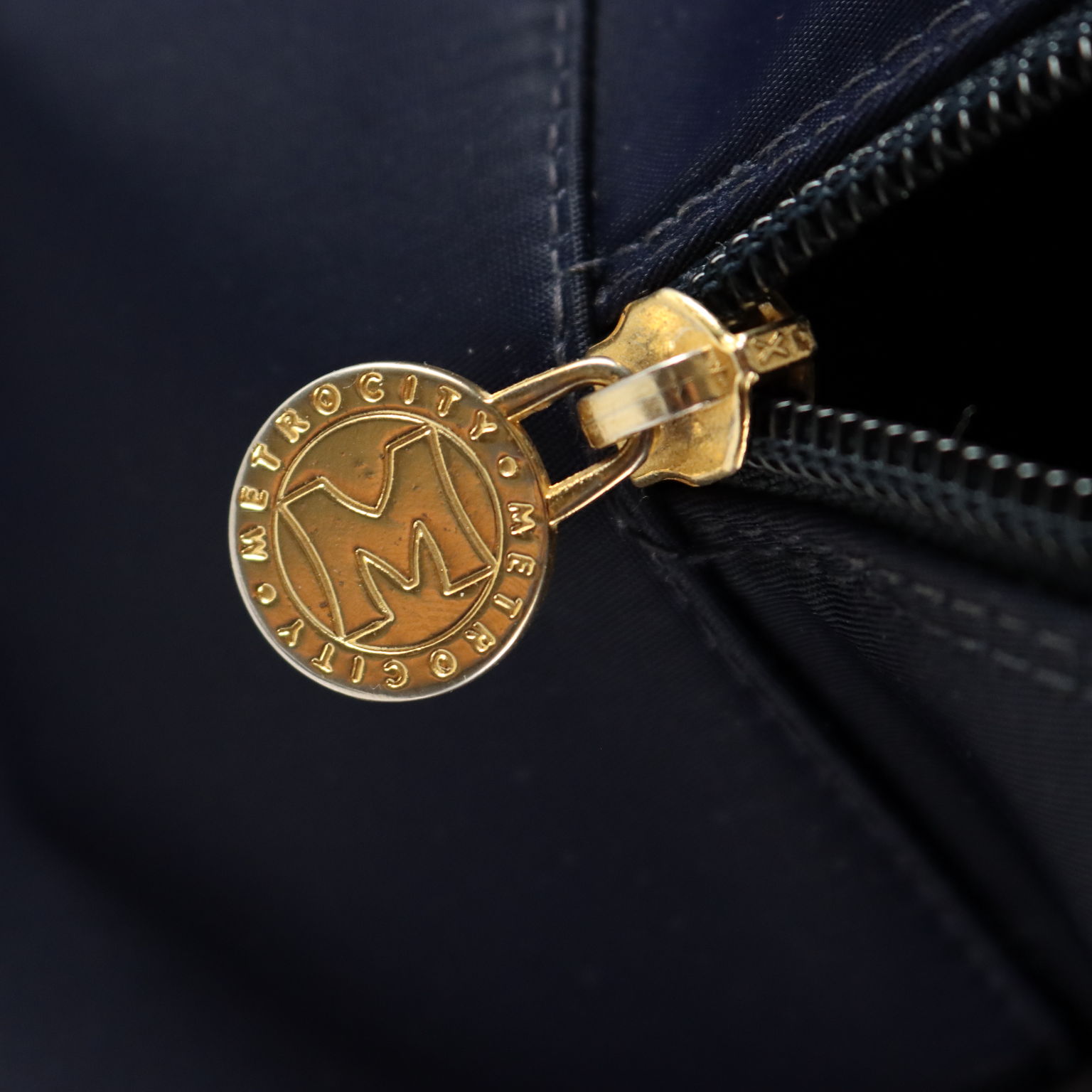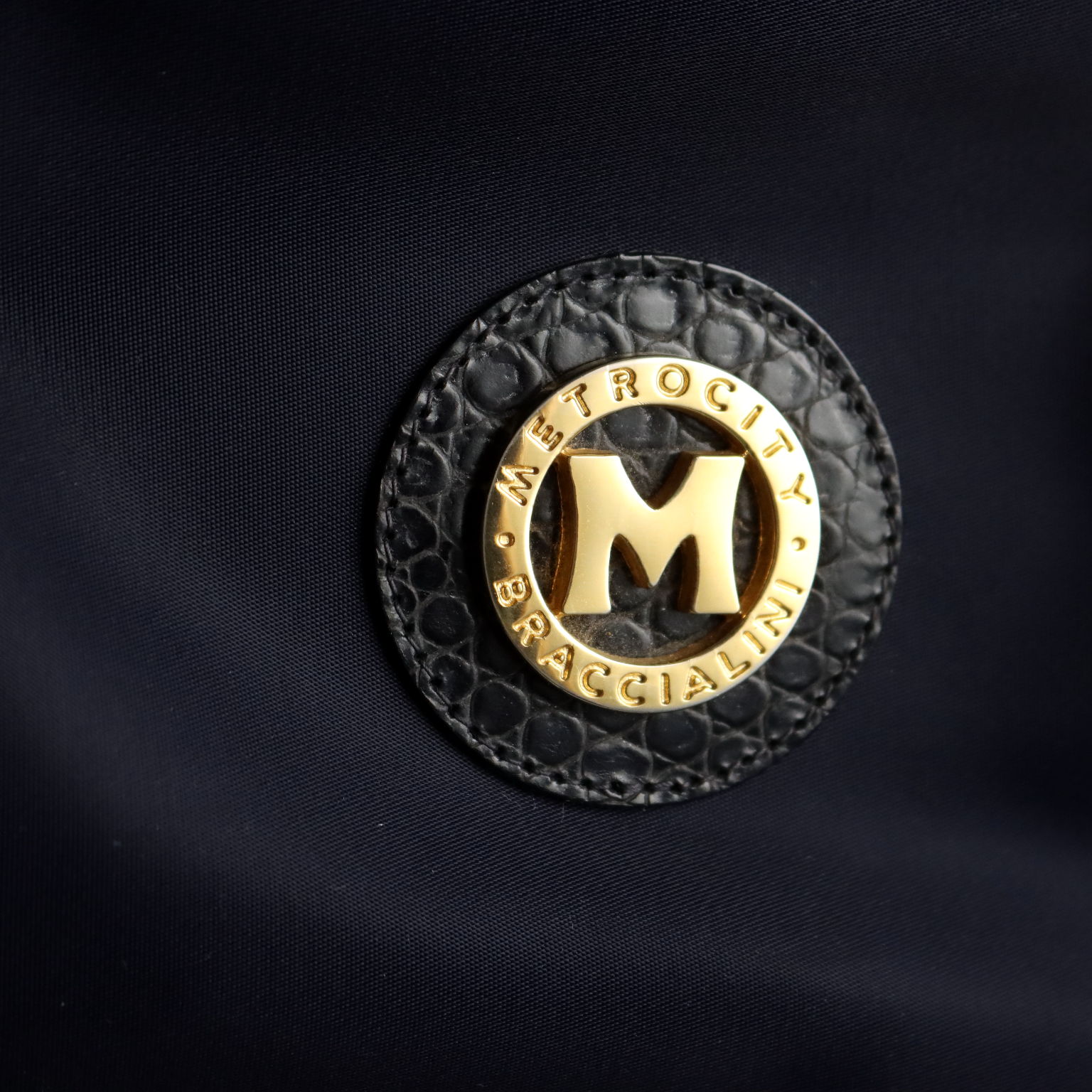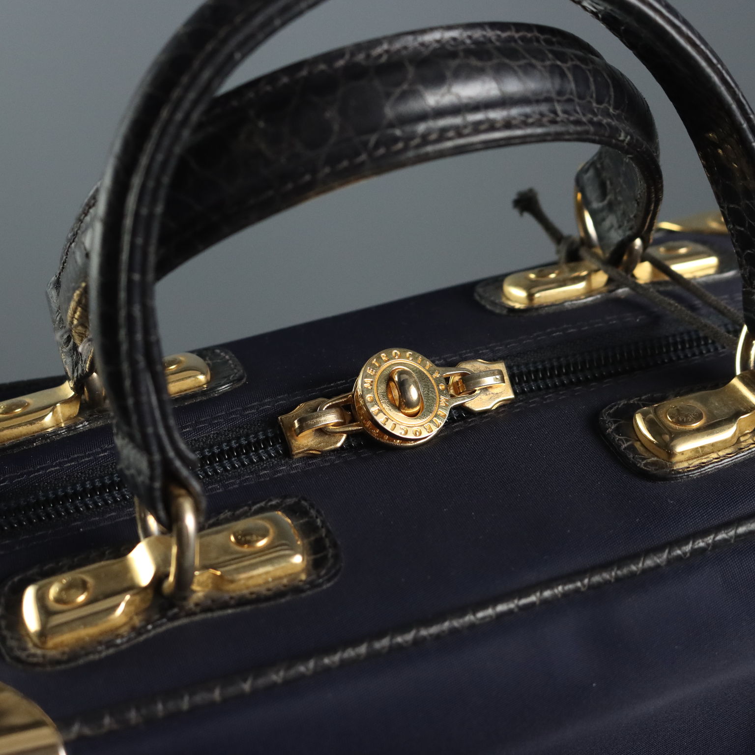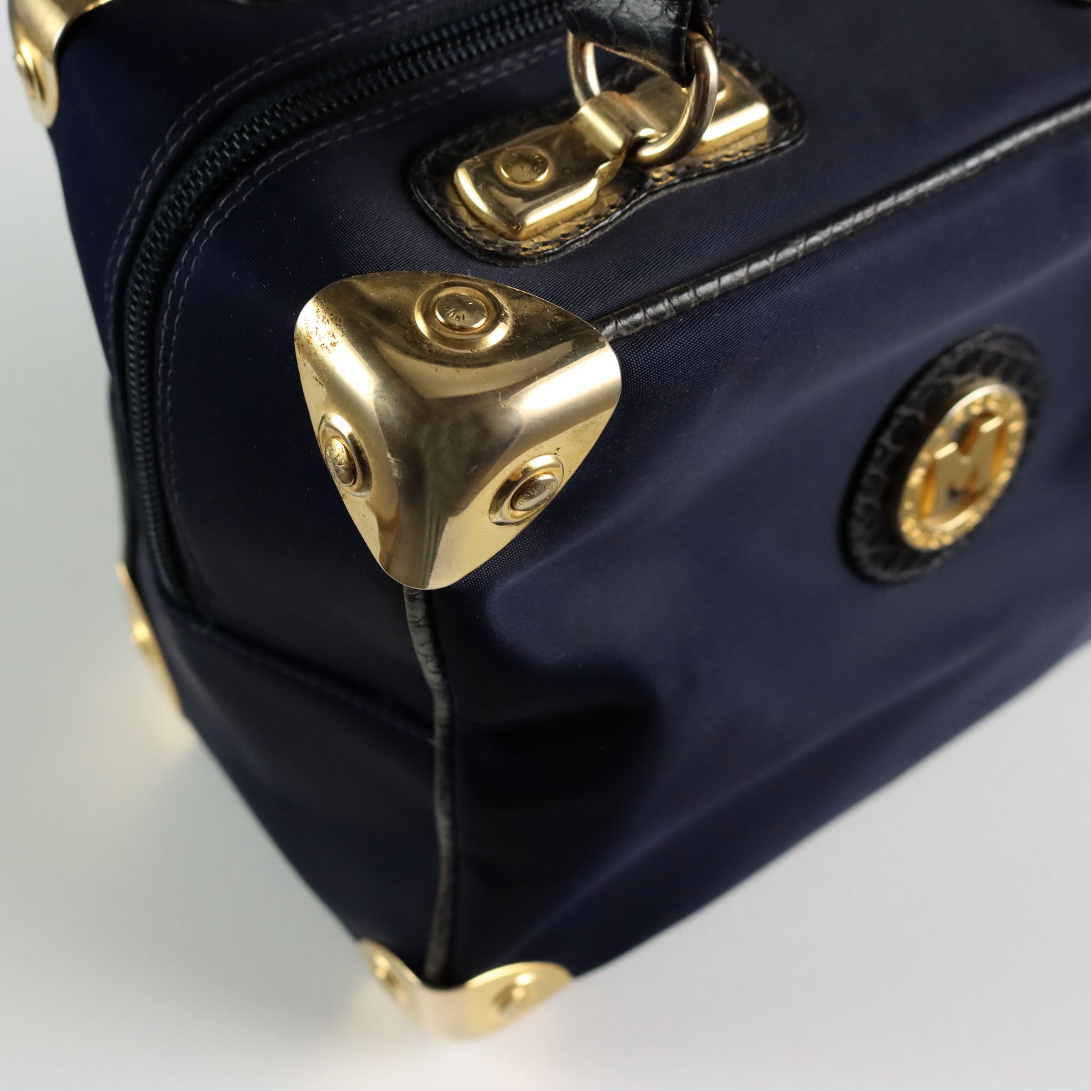 Borsa a mano modello bauletto semirigido, in tessuto blu con profili e manici in pelle effetto rettile. Dettagli in metallo dorato. Chiusura con cerniera e lucchetto con chiavi. Interno in pelle con tasca e targhetta con codice progressivo. L'articolo è in buone condizioni generali, presenta solamente, come da foto, una lieve piegatura.