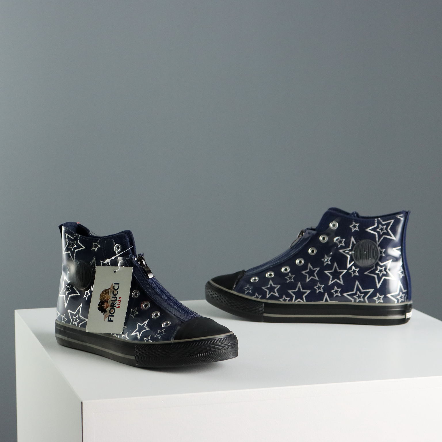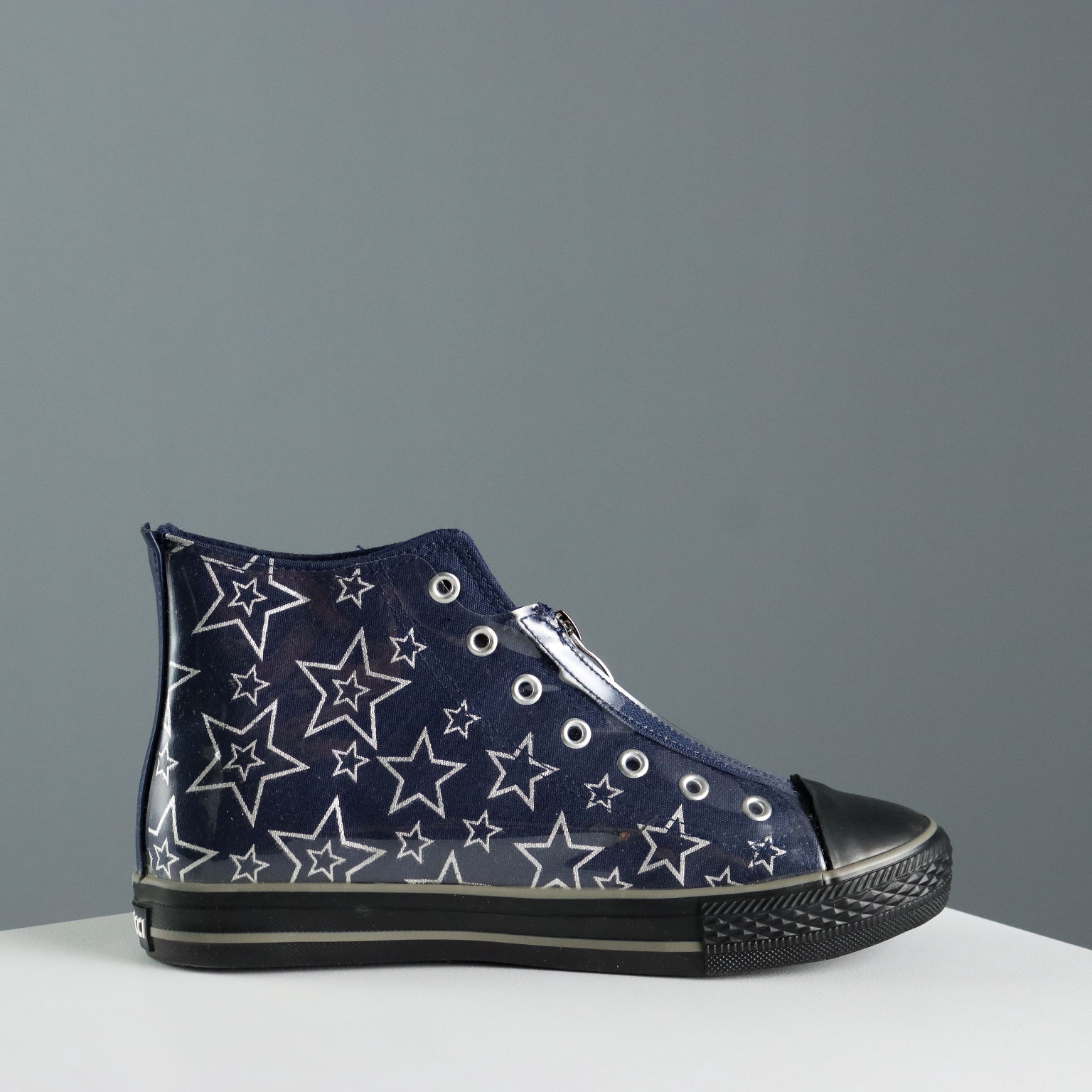 Sneakers in tessuto blu con stelle argento, rivestite in PVC trasparente. Cerniera frontale.