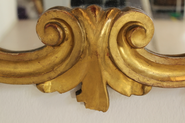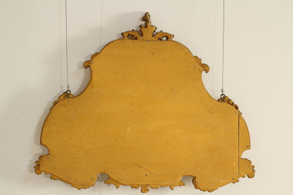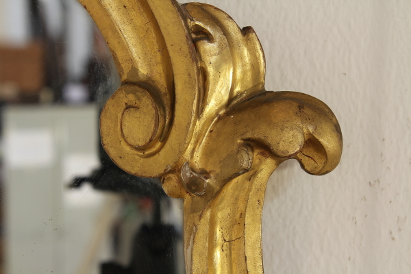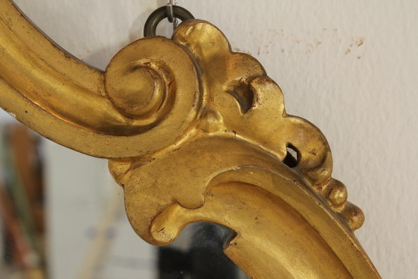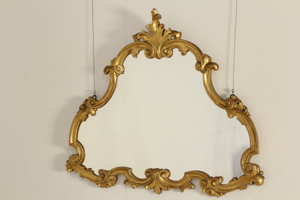 Specchiera mistilinea intagliata a volute contrapposte con riccioli e dorata a foglia.