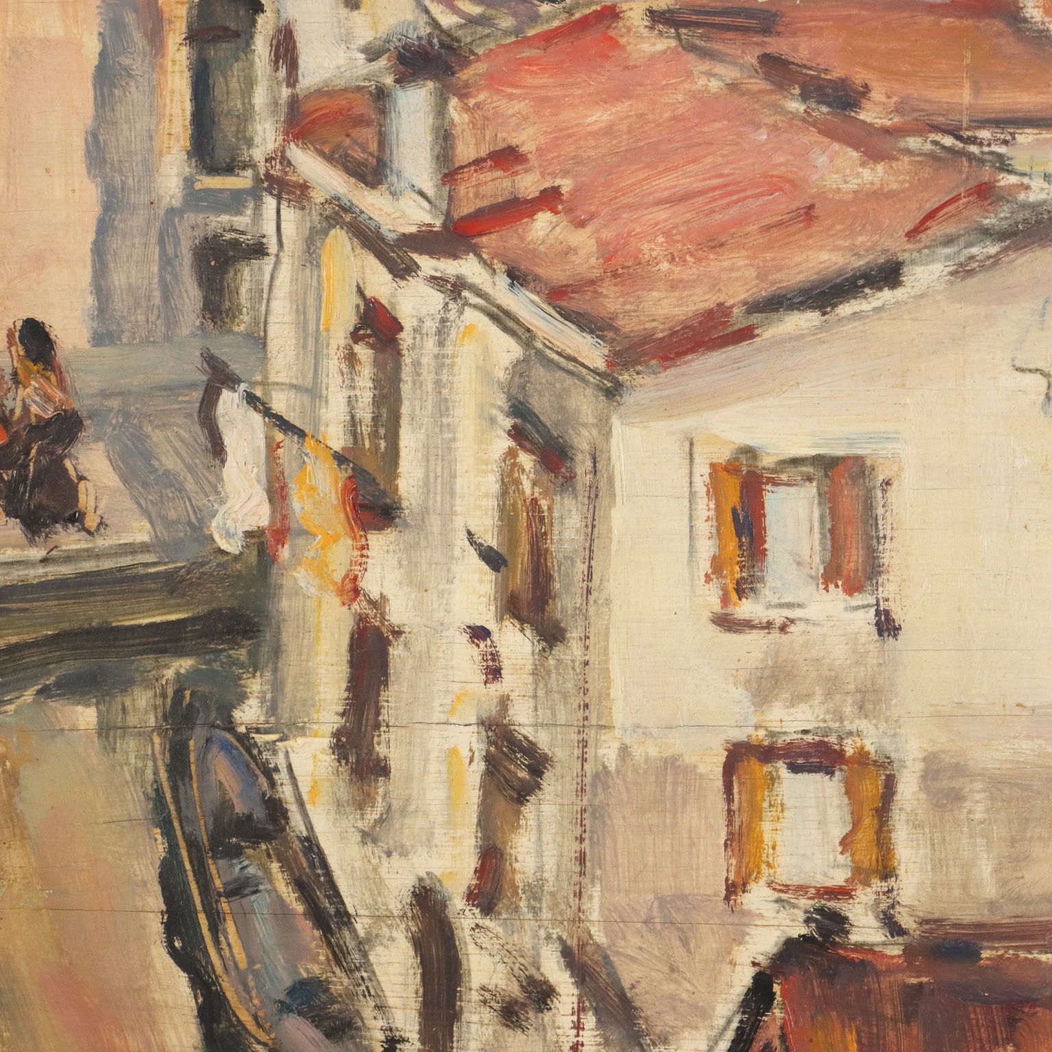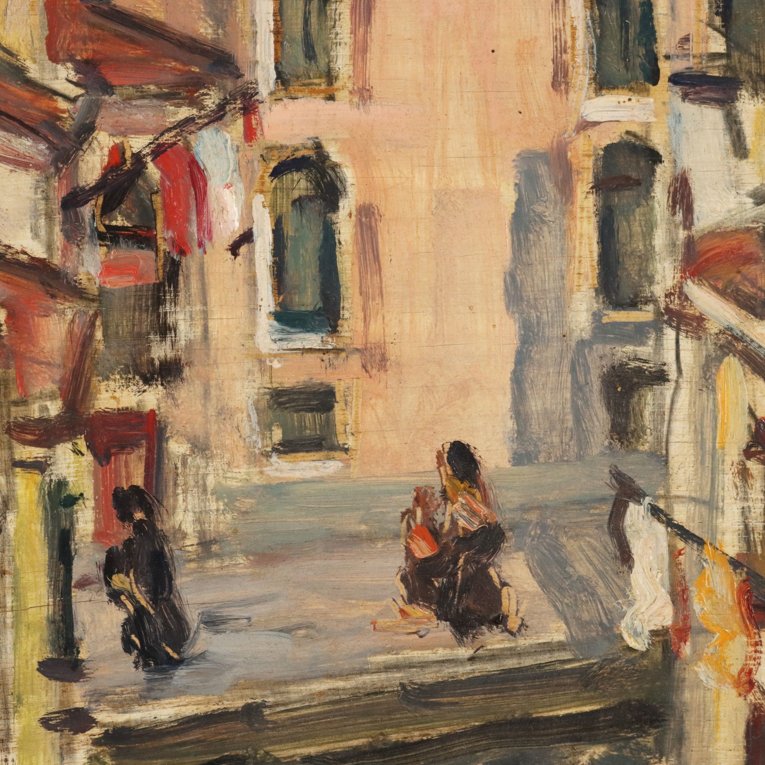 Olio su compensato. Firmato e datato in basso a destra. Al retro il titolo dell' opera. Rino Villa è noto come uno degli iniziatori (assieme a Seibezzi, Da Venezia, Ravenna, Bergamini, Mori, Dalla Zorza, ecc.) del rinnovamento in chiave impressionista della pittura veneziana. Si affermò prevalentemente come paesaggista, proponendo soprattutto diversi scorci di Venezia, dominati dal grigio dei suoi cieli lagunari. L'opera è presentata in cornice.