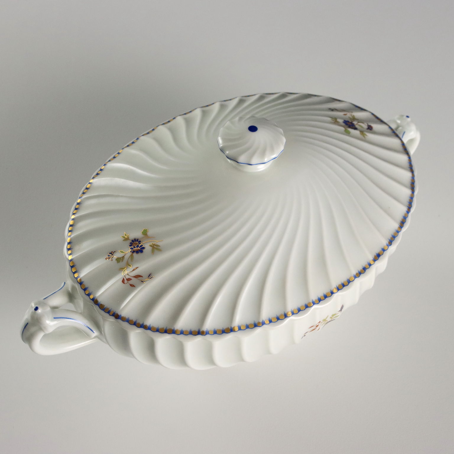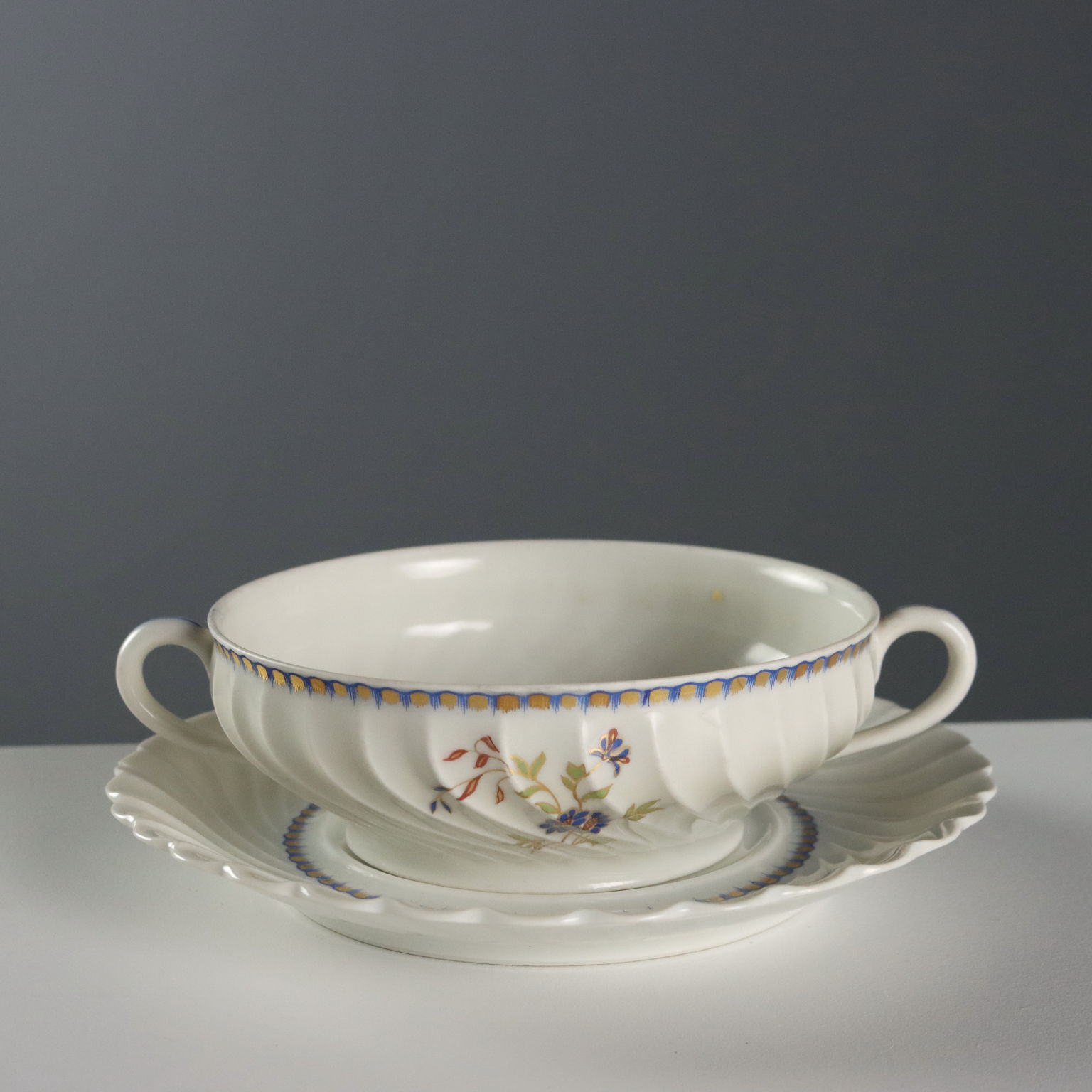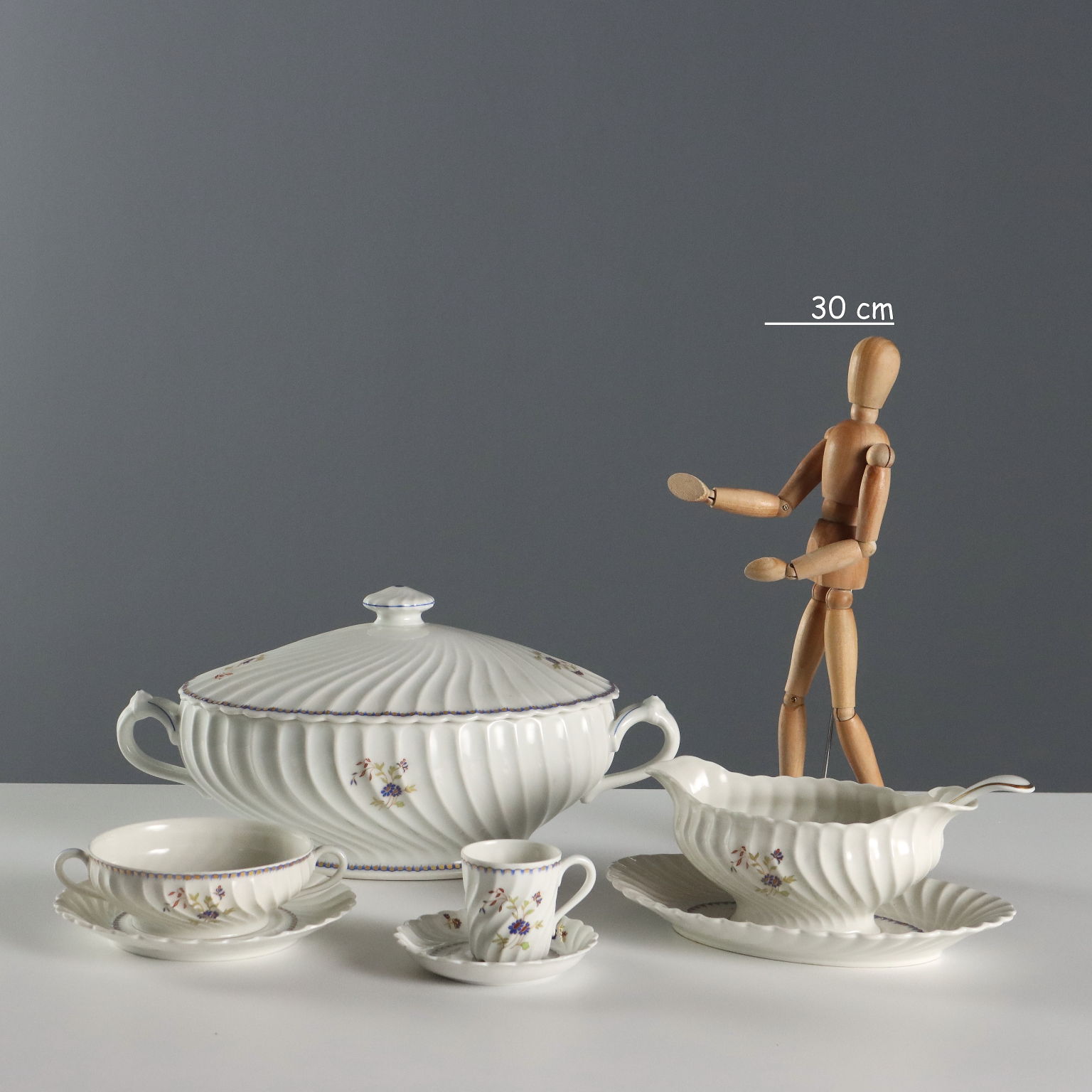 Servizio di piatti in porcellana con decoro policromo a greche e mazzolini di fiori. Il servizio è composto da una zuppiera, una salsiera, 5 piatti a servire ovali e uno tondo, 10 fondine, 24 piatti piani, 22 piatti da frutta, 12 tazze da consommè con piattino e servizio da caffè per 6 persone. Marchio della manifattura sotto la base.