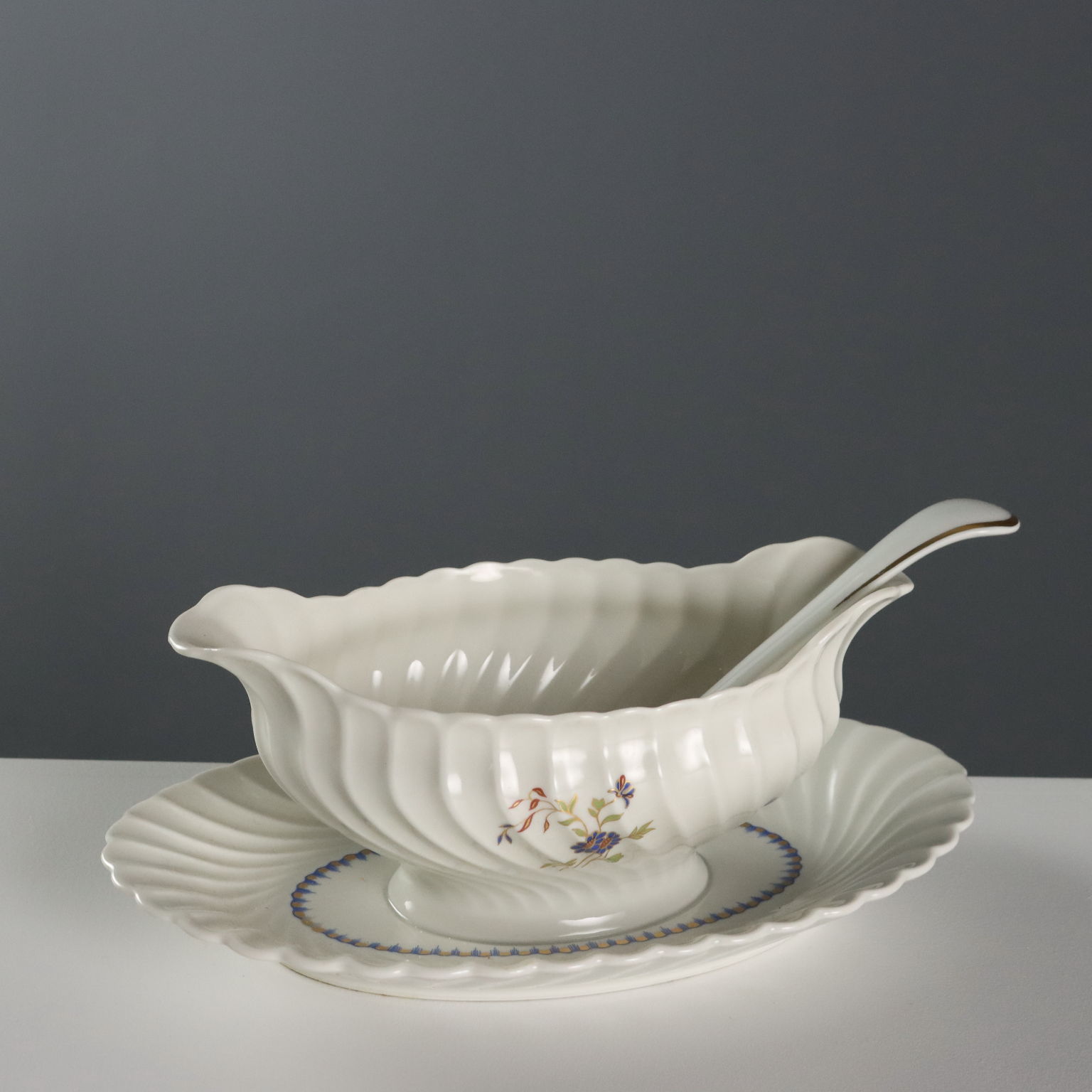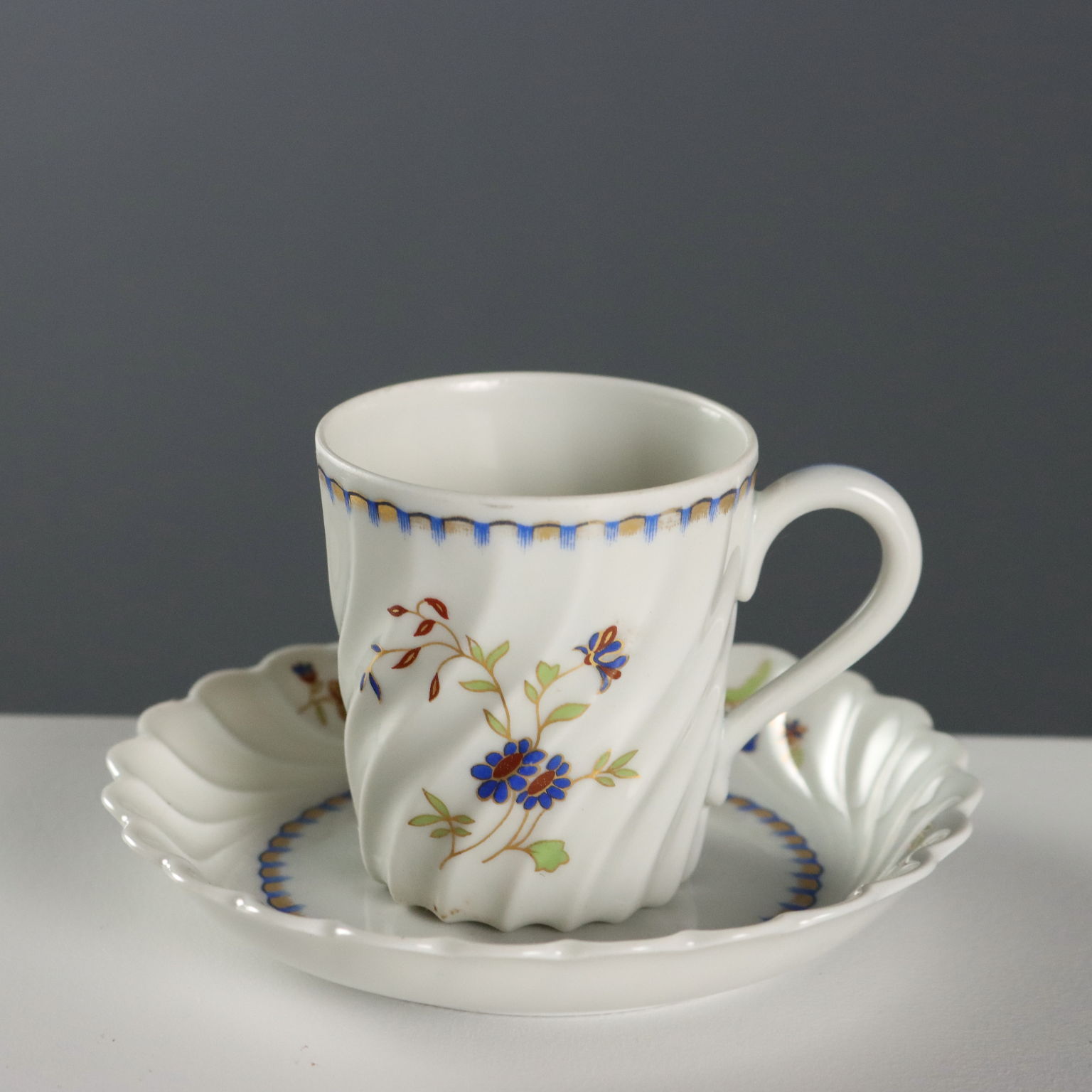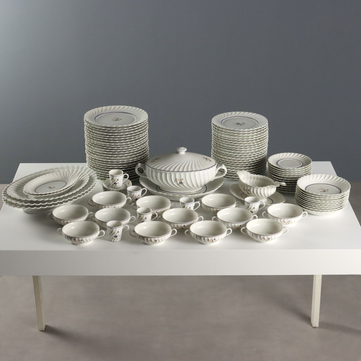 Servizio di piatti in porcellana con decoro policromo a greche e mazzolini di fiori. Il servizio è composto da una zuppiera, una salsiera, 5 piatti a servire ovali e uno tondo, 10 fondine, 24 piatti piani, 22 piatti da frutta, 12 tazze da consommè con piattino e servizio da caffè per 6 persone. Marchio della manifattura sotto la base.