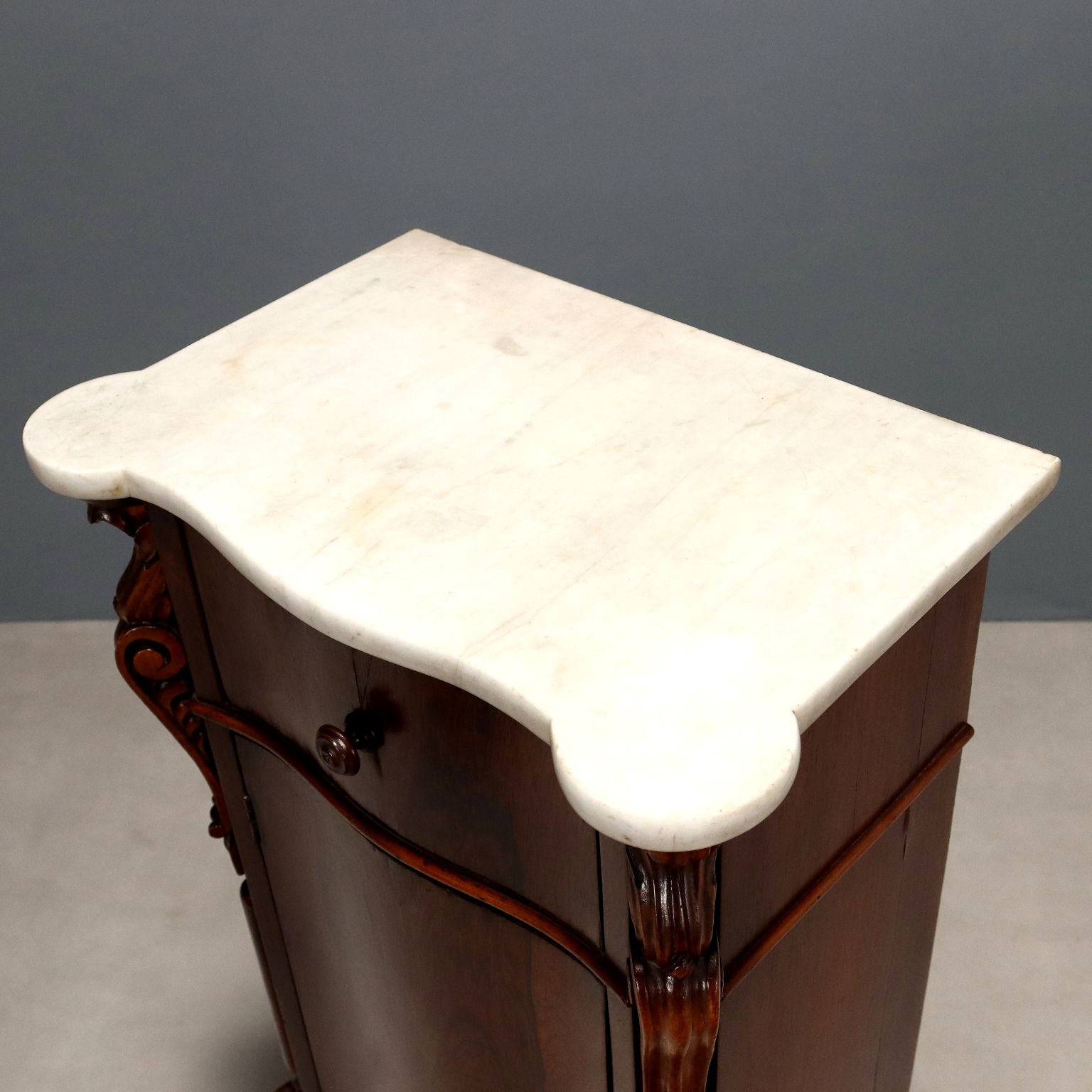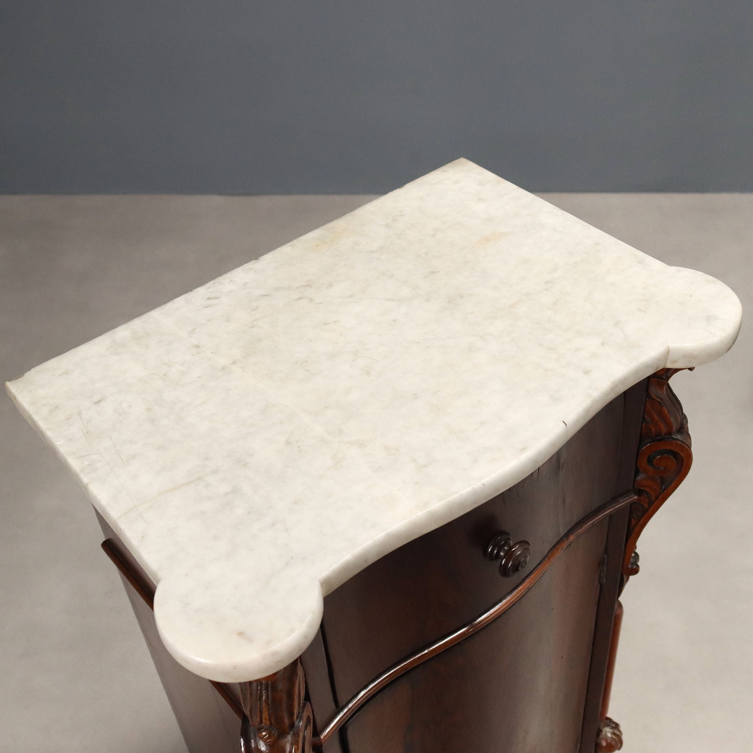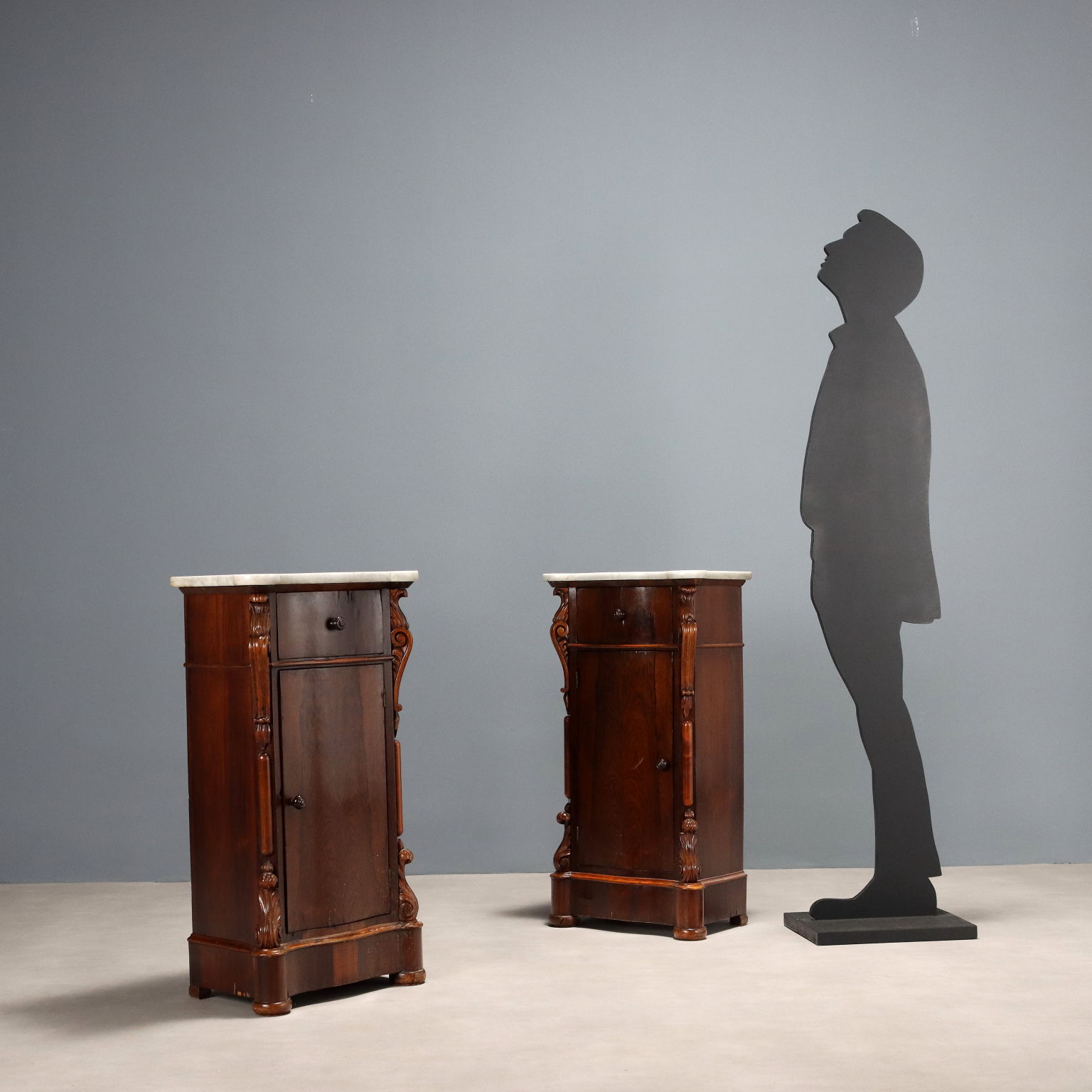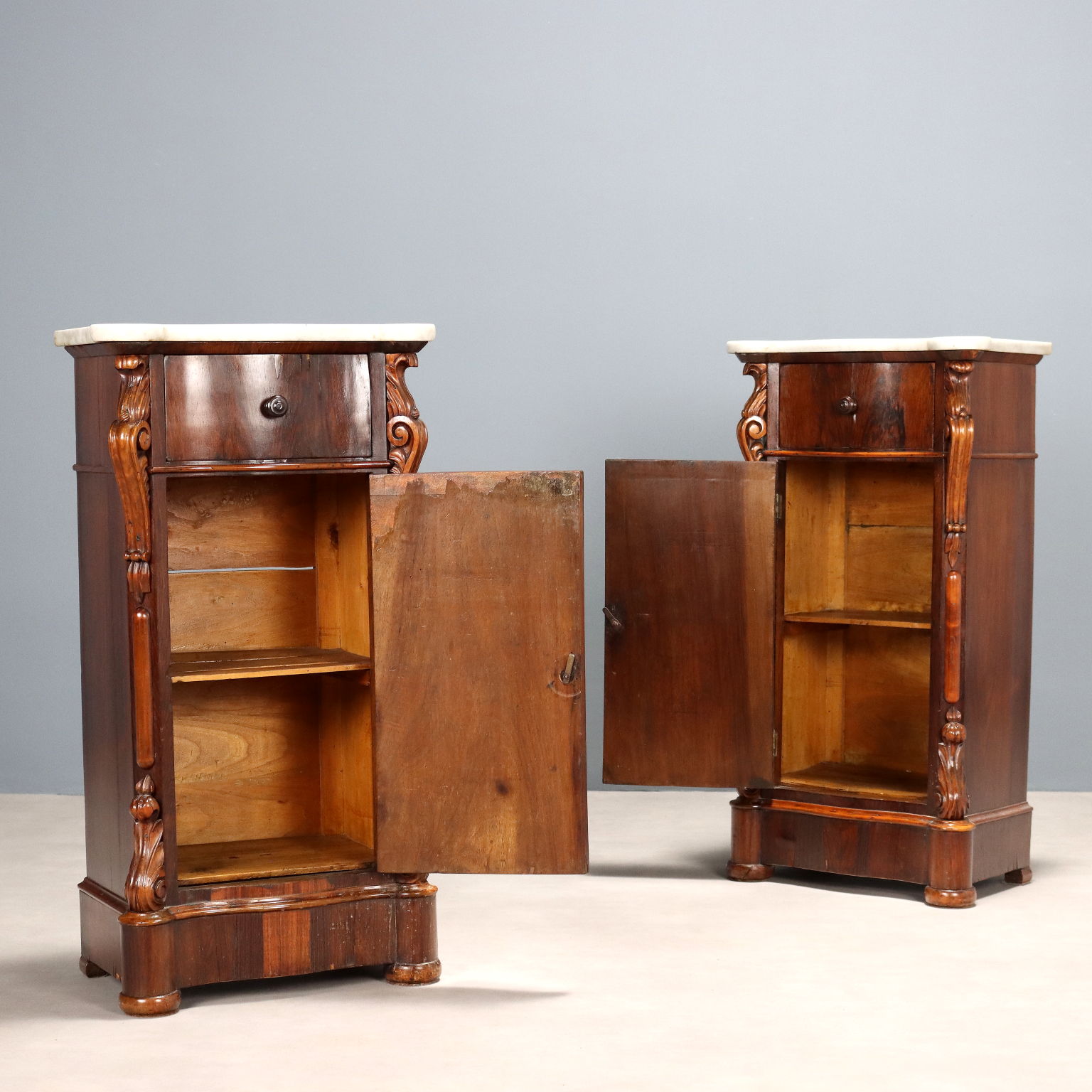 Descrizione Coppia di comodini Luigi Filippo impiallacciati in bois de rose. Fronte mosso con cassetto nella fascia sotto piano e anta centrale, montanti intagliati a volute e riccioli. Piano in marmo bianco. Regno delle due Sicilie, terzo quarto XIX Secolo.