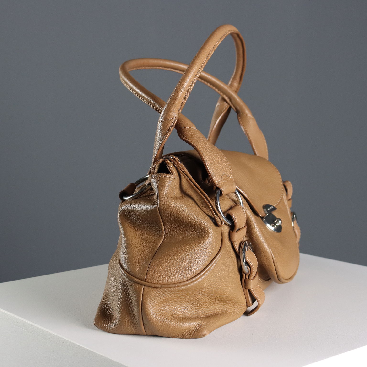 Borsa a spalla realizzata in morbida pelle martellata, in tonalità cammello, con chiusura con patta e cerniera. Presenta due tasche esterne, una frontale e una posteriore. L'interno è foderato e dotato di una tasca con cerniera. L'articolo presenta lievissimi segni sul pellame, dati dal normale utilizzo.