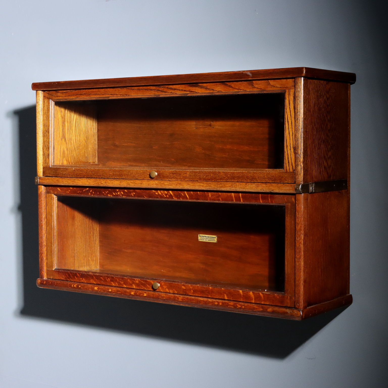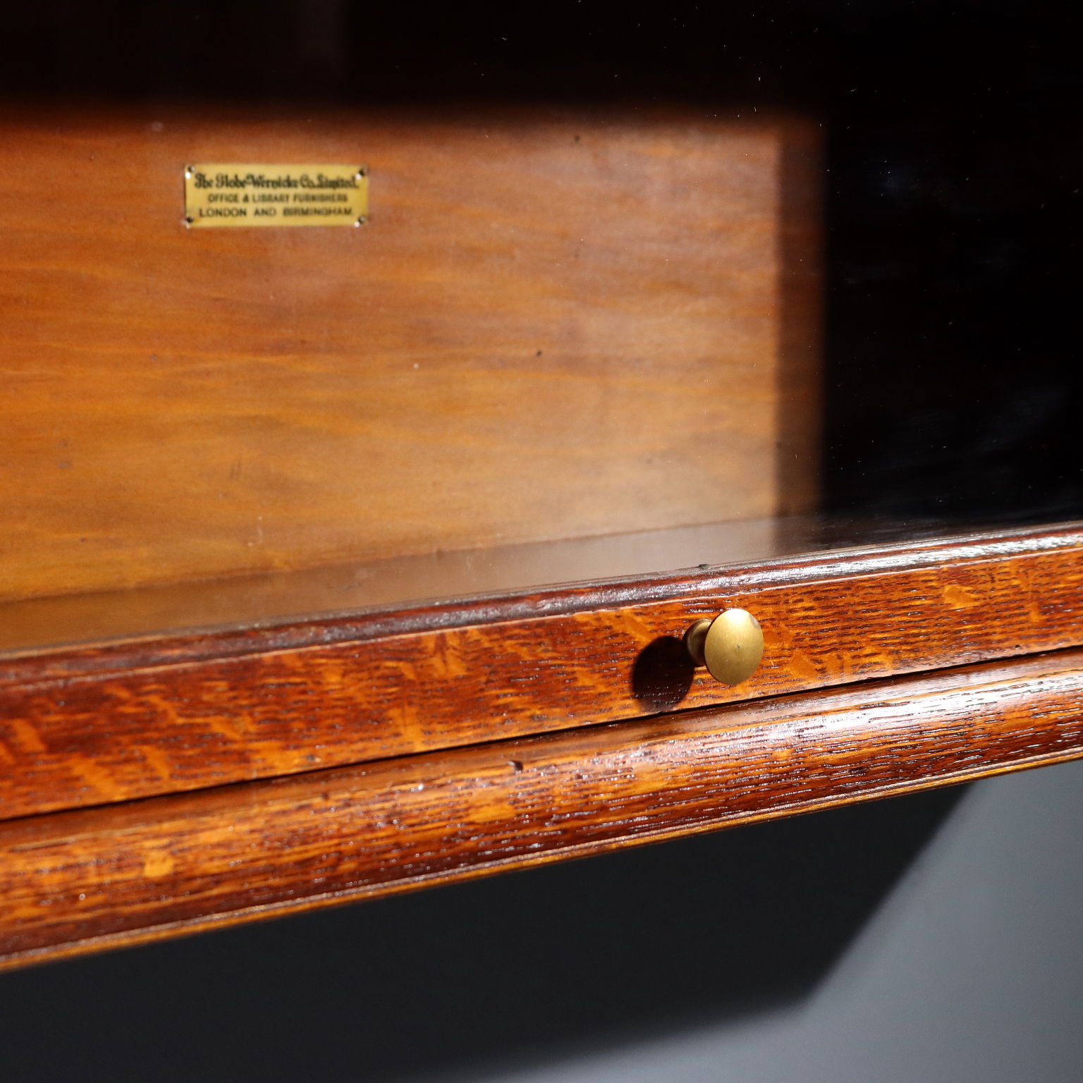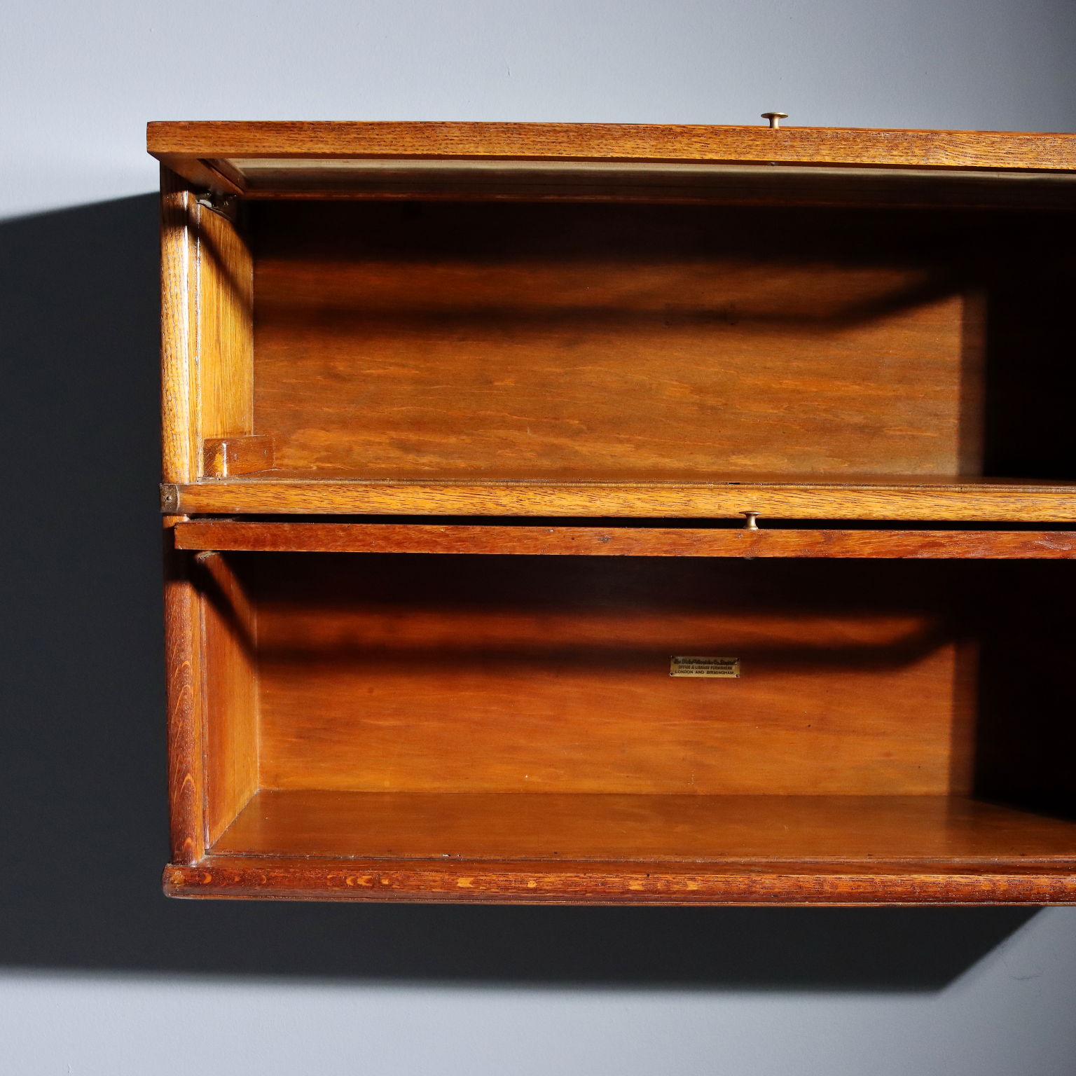 Pensile a libreria in rovere, fronte a due ante con vetro a ribalta e scomparsa, dettagli in lamierino. Produzione “The GLOBE-WERNICKE Co. Limited”, London and Birmingham. Inghilterra, fine XIX Secolo.