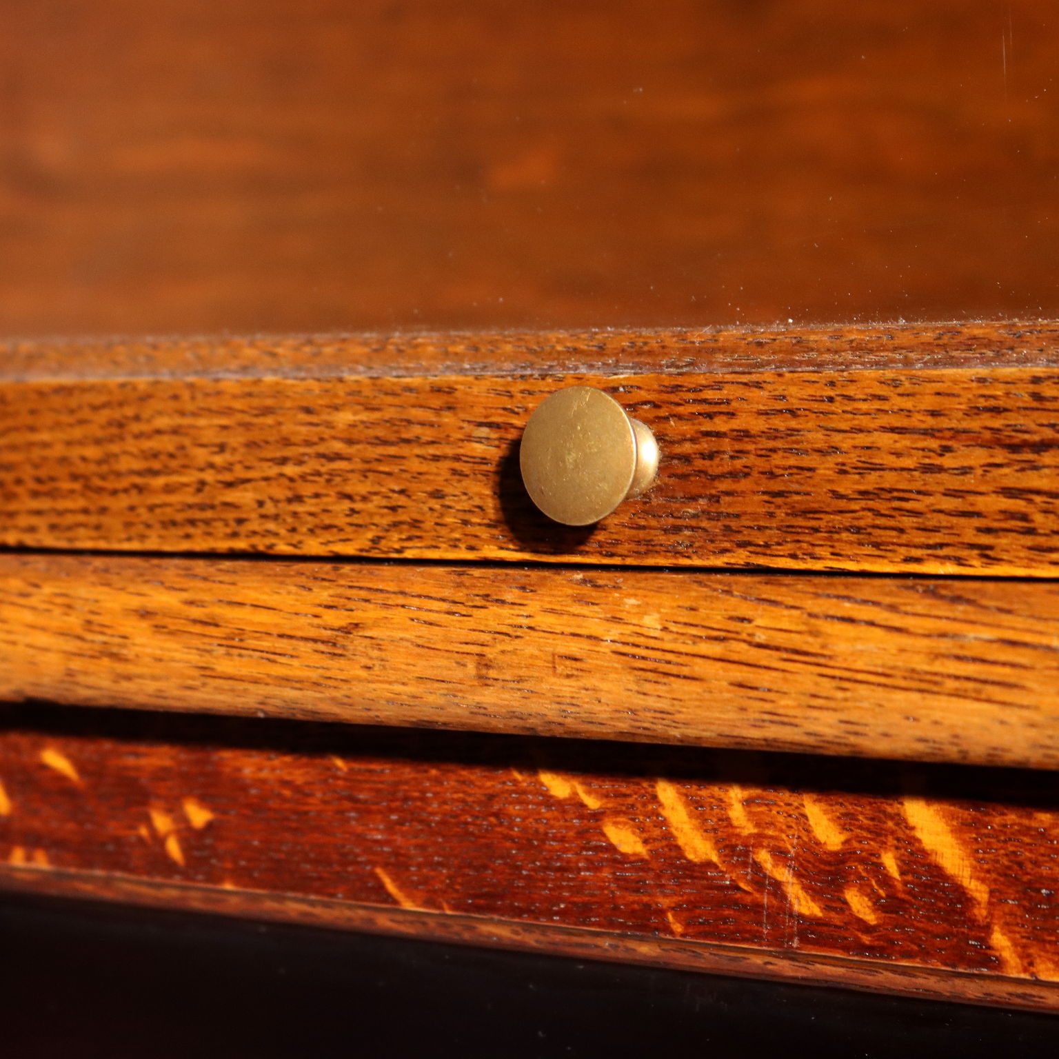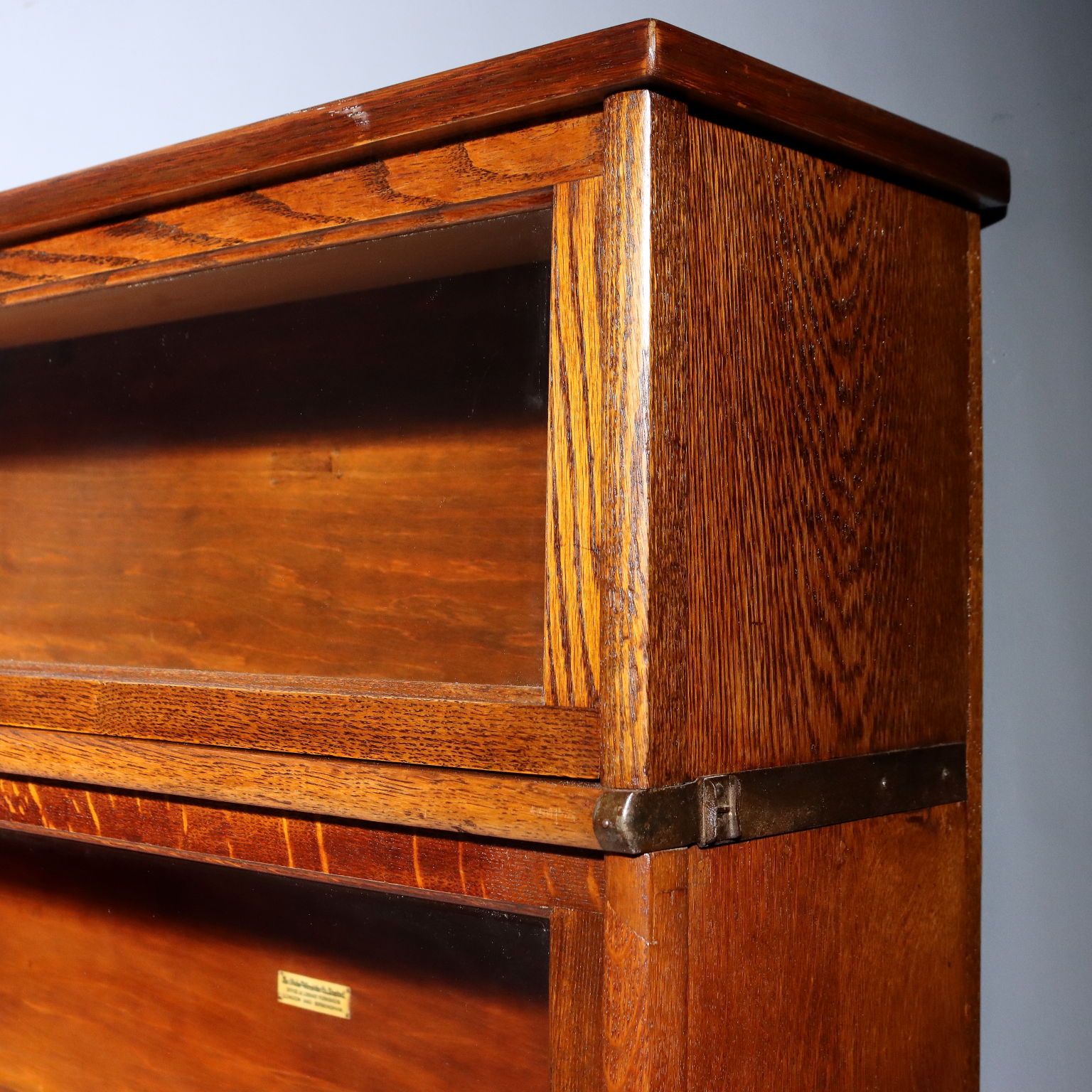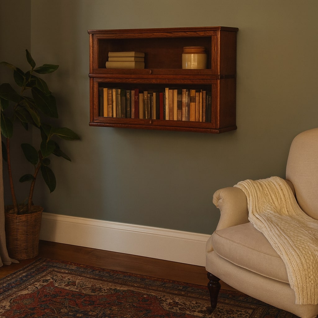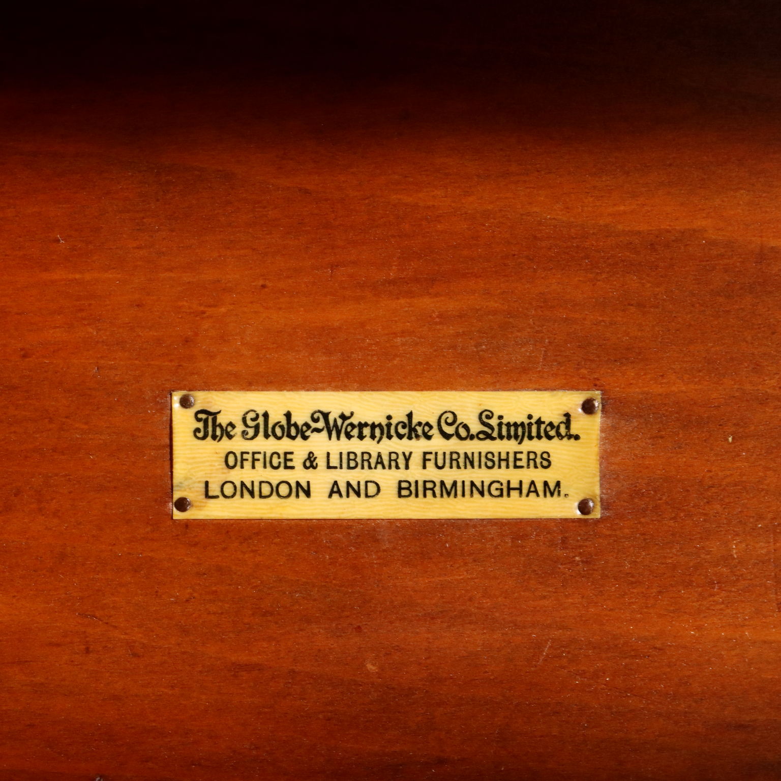 Pensile a libreria in rovere, fronte a due ante con vetro a ribalta e scomparsa, dettagli in lamierino. Produzione “The GLOBE-WERNICKE Co. Limited”, London and Birmingham. Inghilterra, fine XIX Secolo.