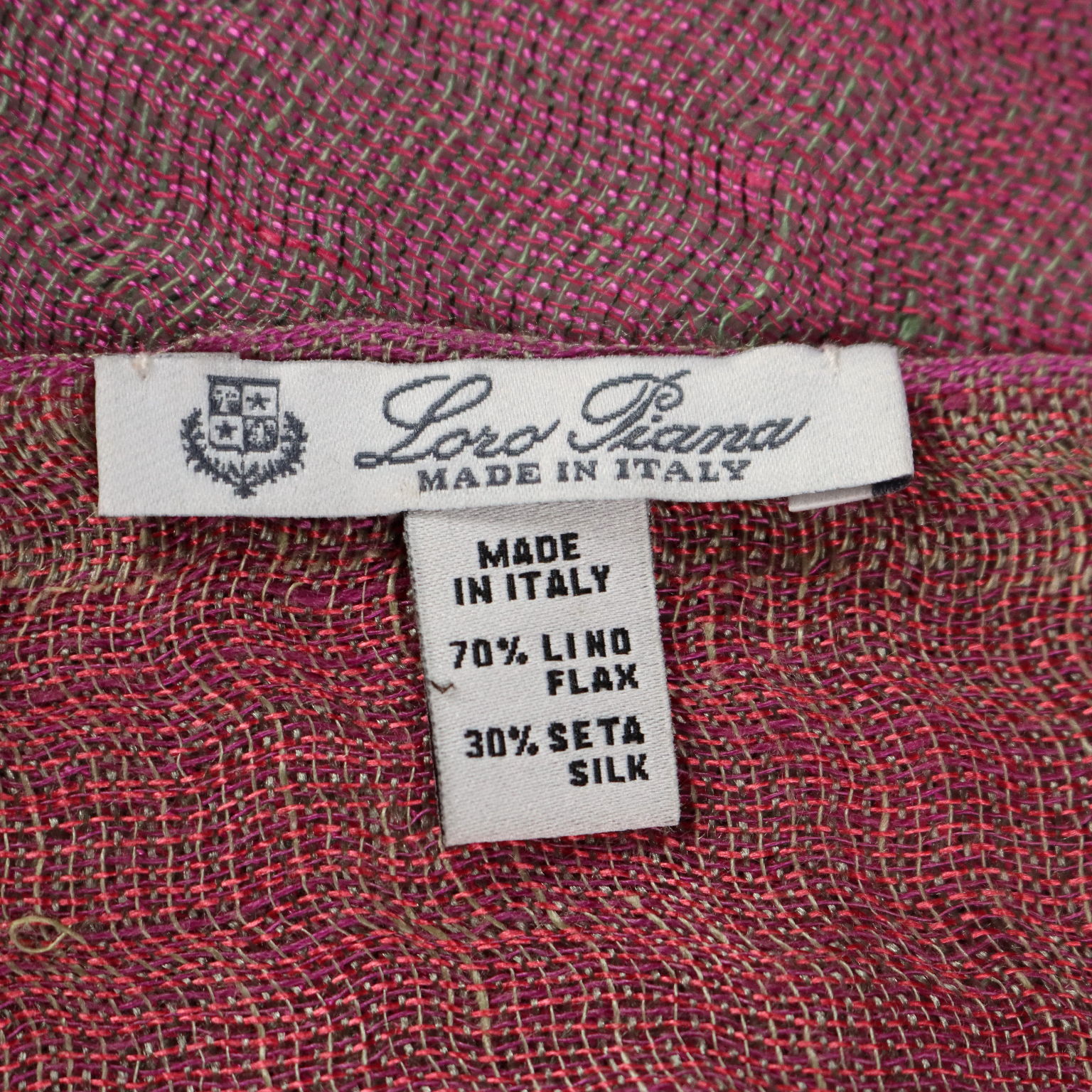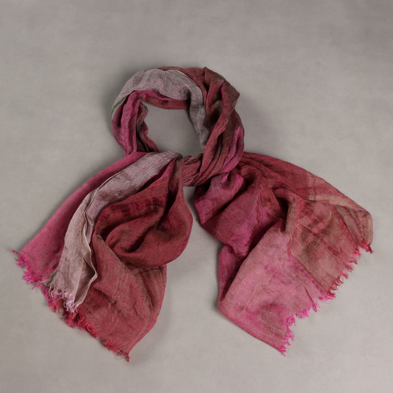 Foulard in misto lino e seta sui toni del rosa, fucsia e verde. L'articolo presenta alcune imperfezioni nel filato, data la delicatezza e la trama del tessuto, ciò però non ne compromette l'utilizzo.