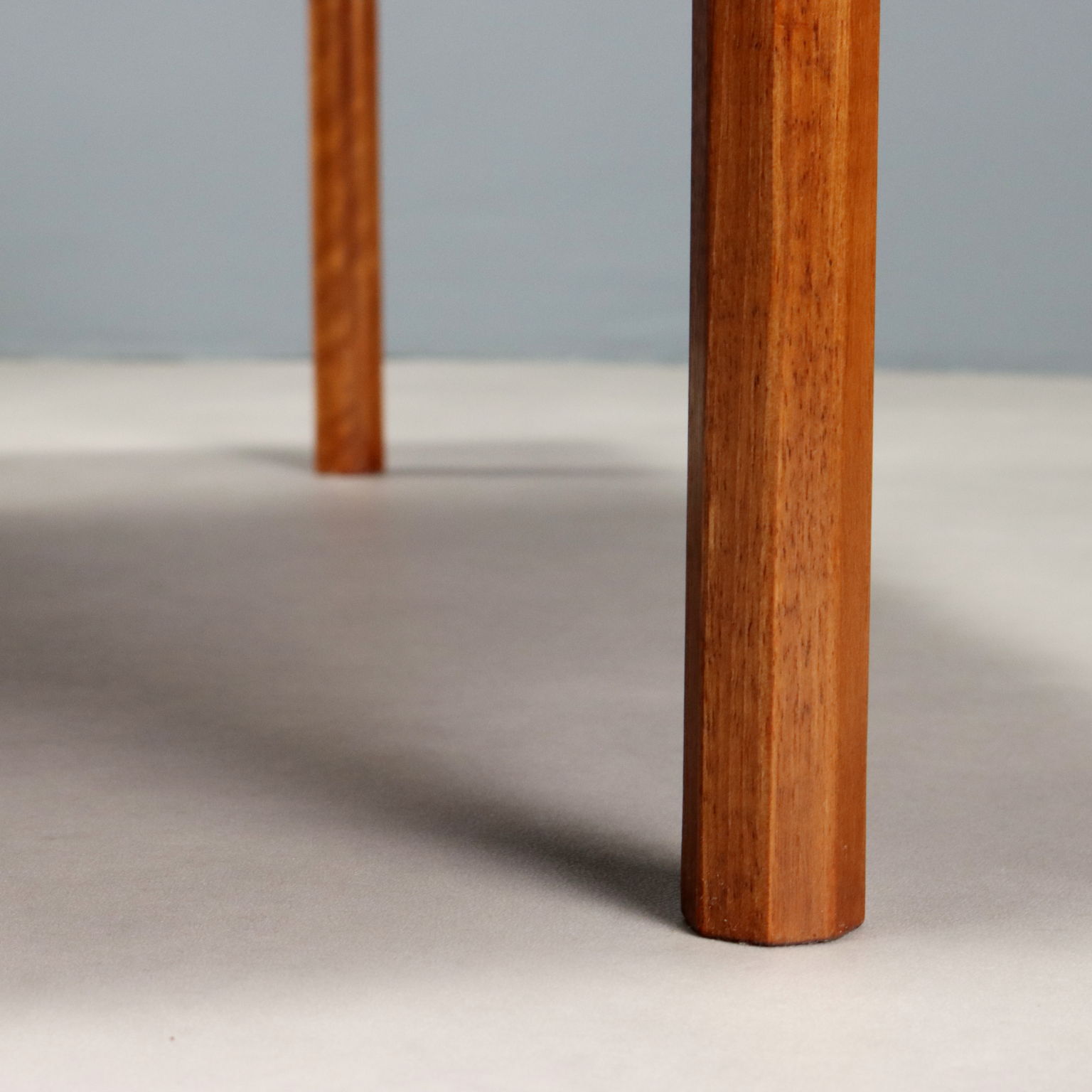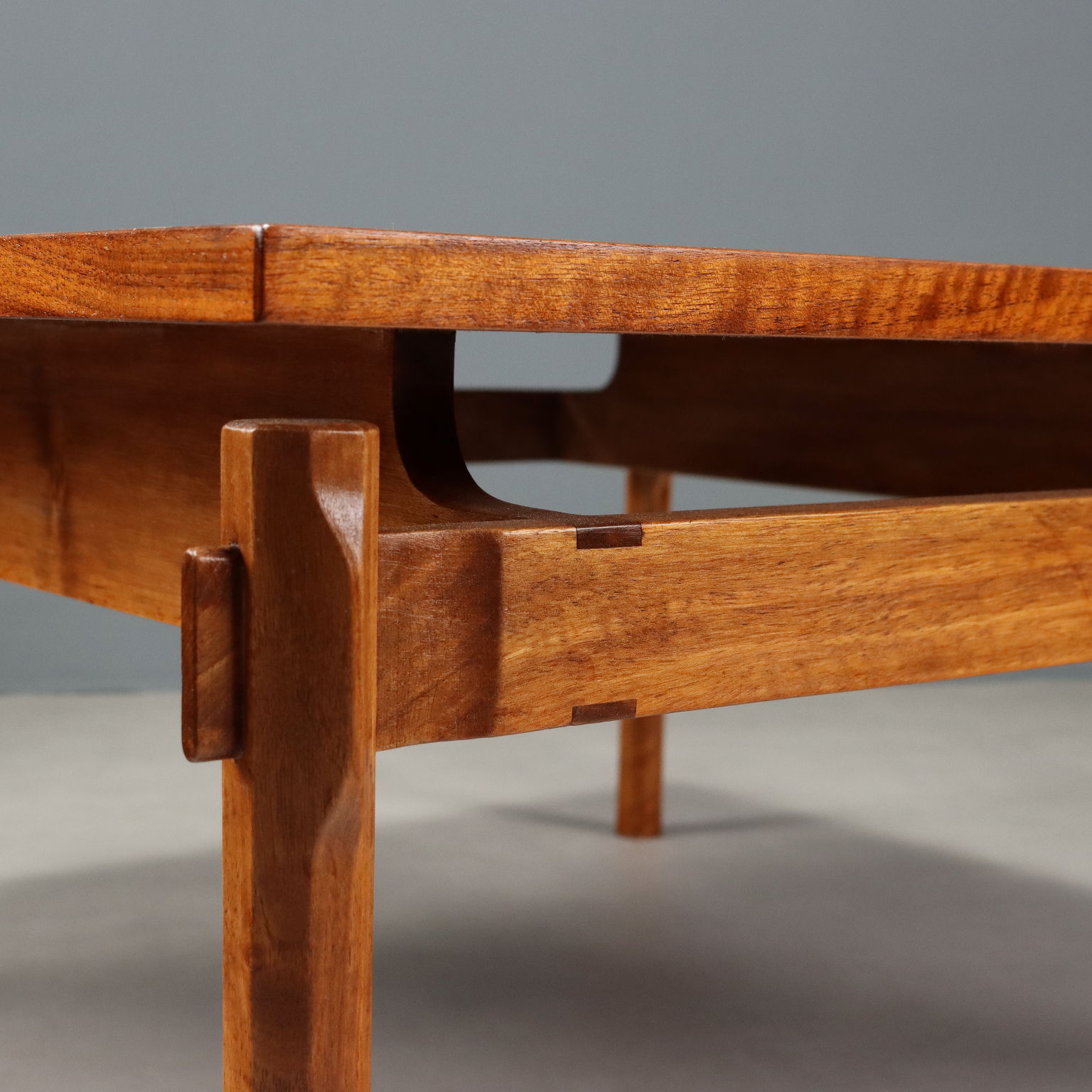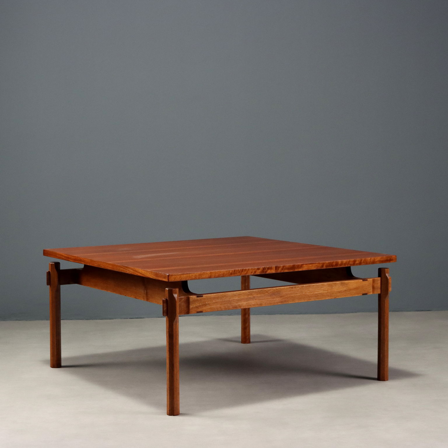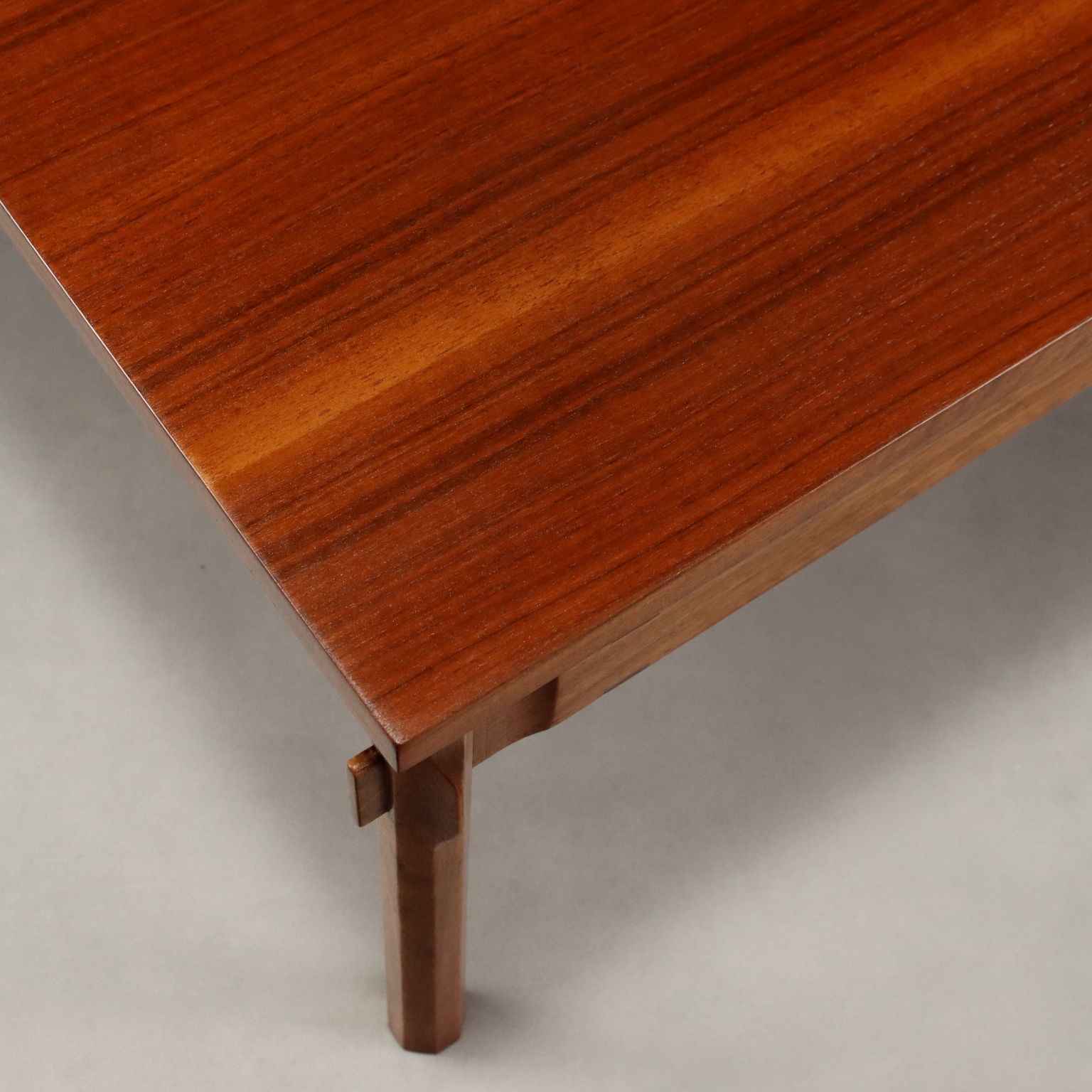 Tavolino vintage da centro realizzato in legno di teak con gambe a sezione ottagonale, intagliate per consentire l'incastro delle traverse, due delle quali sono innalzate e sostengono il piano quadrato. Restaurato nei nostri laboratori. Condizioni molto buone.