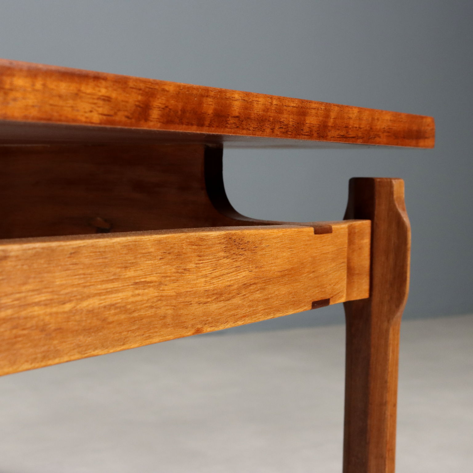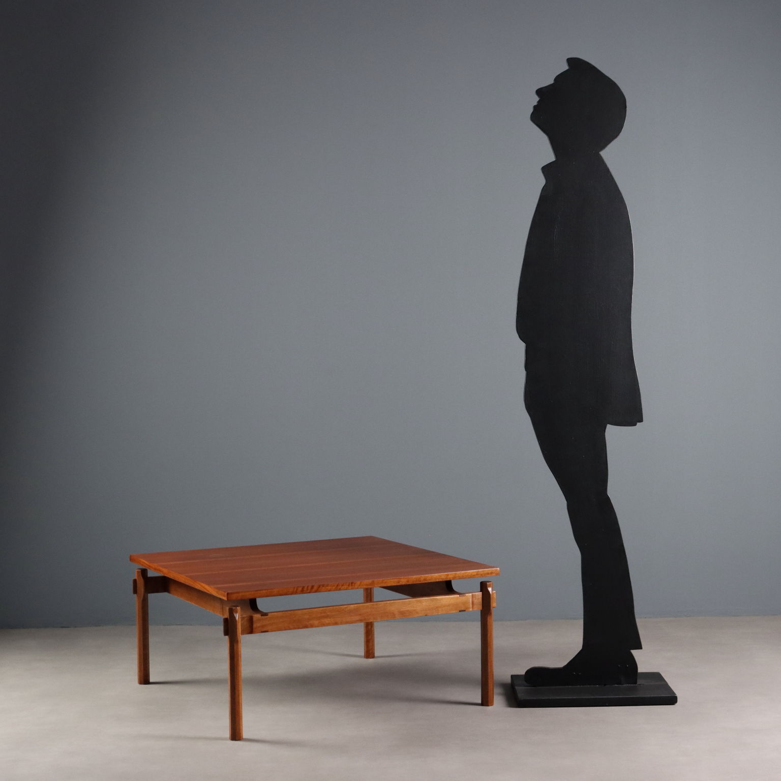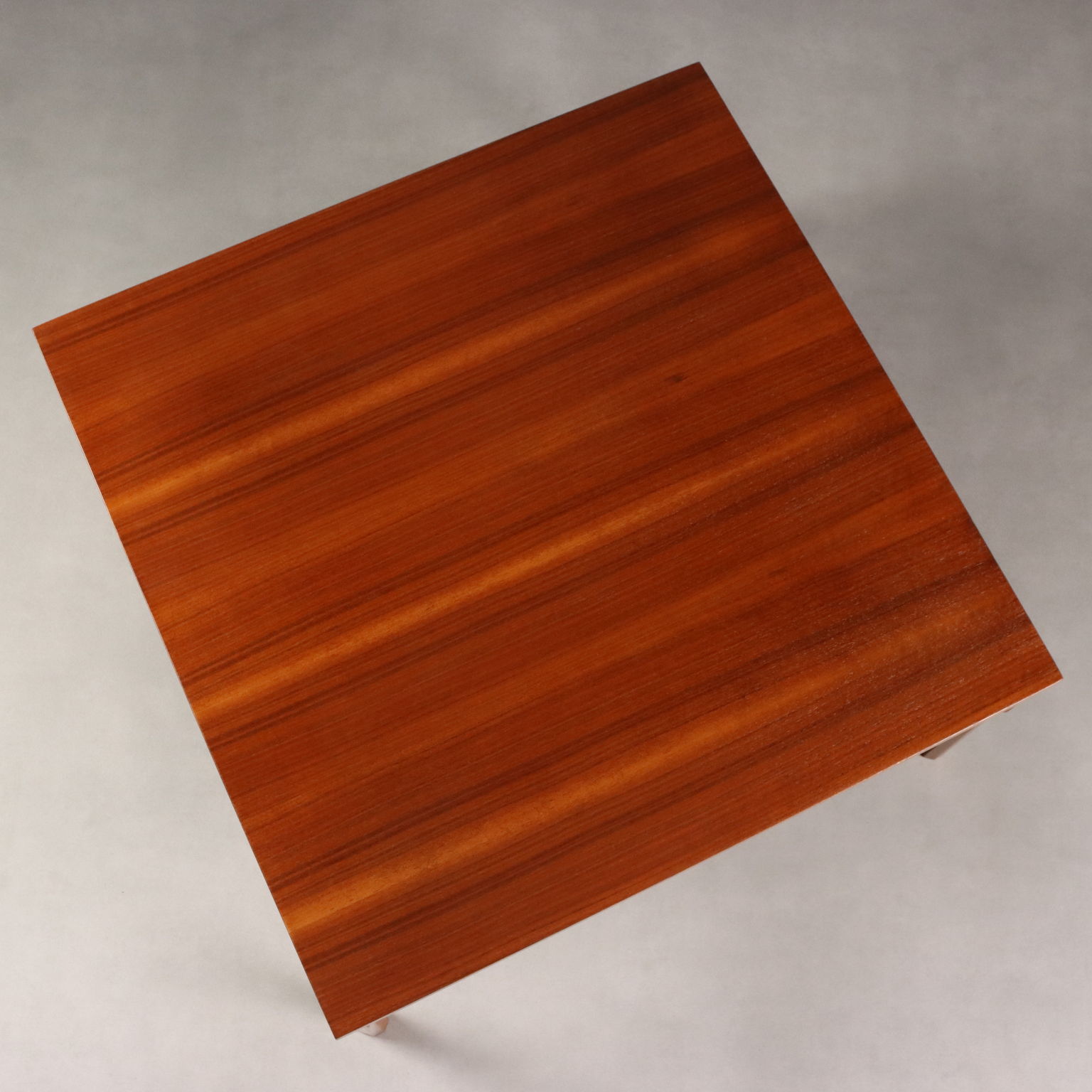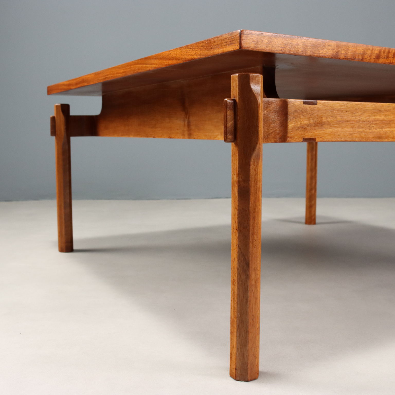 Tavolino vintage da centro realizzato in legno di teak con gambe a sezione ottagonale, intagliate per consentire l'incastro delle traverse, due delle quali sono innalzate e sostengono il piano quadrato. Restaurato nei nostri laboratori. Condizioni molto buone.