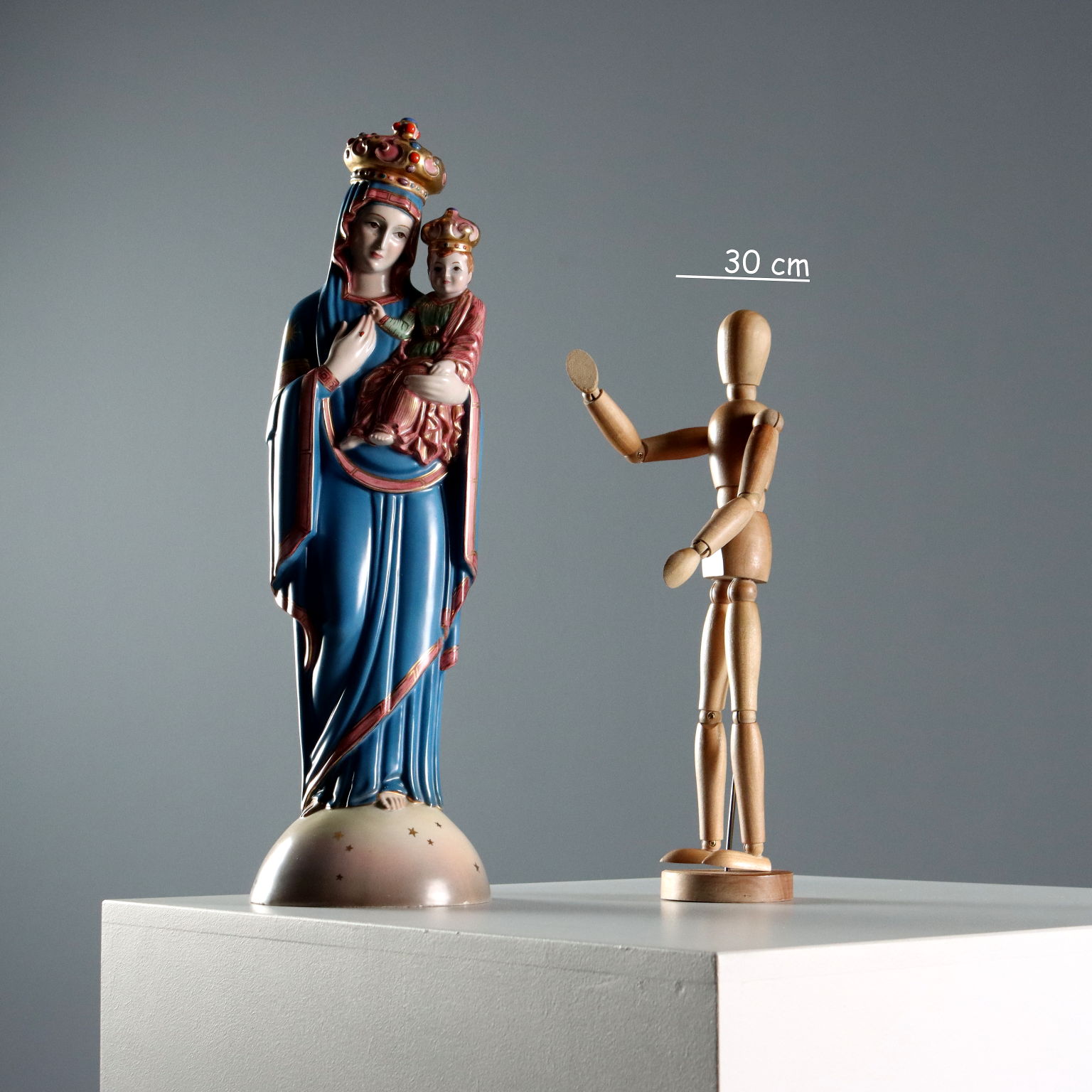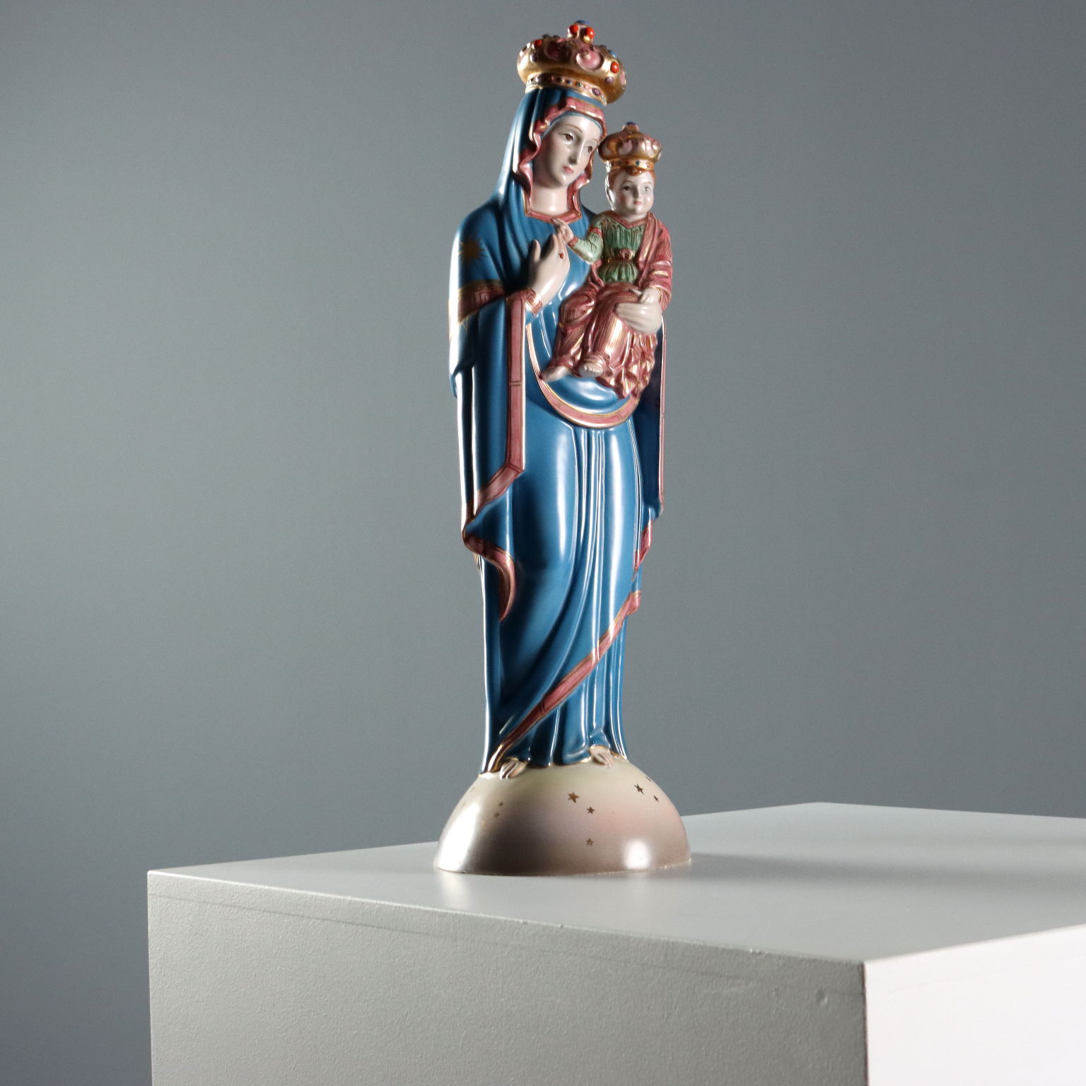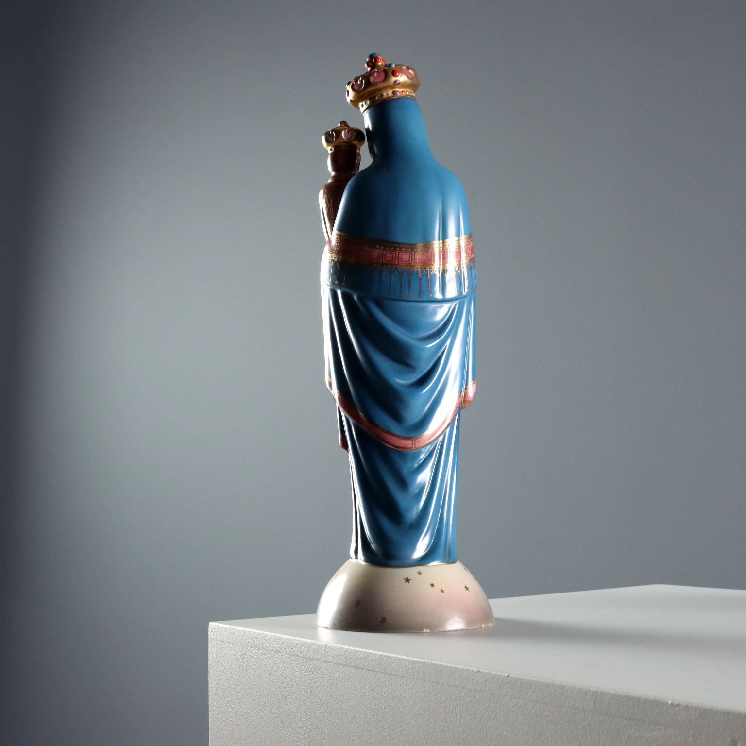 Statua raffigurante Madonna con Bambino. Sotto la base marchio della manifattura: "Giovanni Ronzan, Torino Italia".