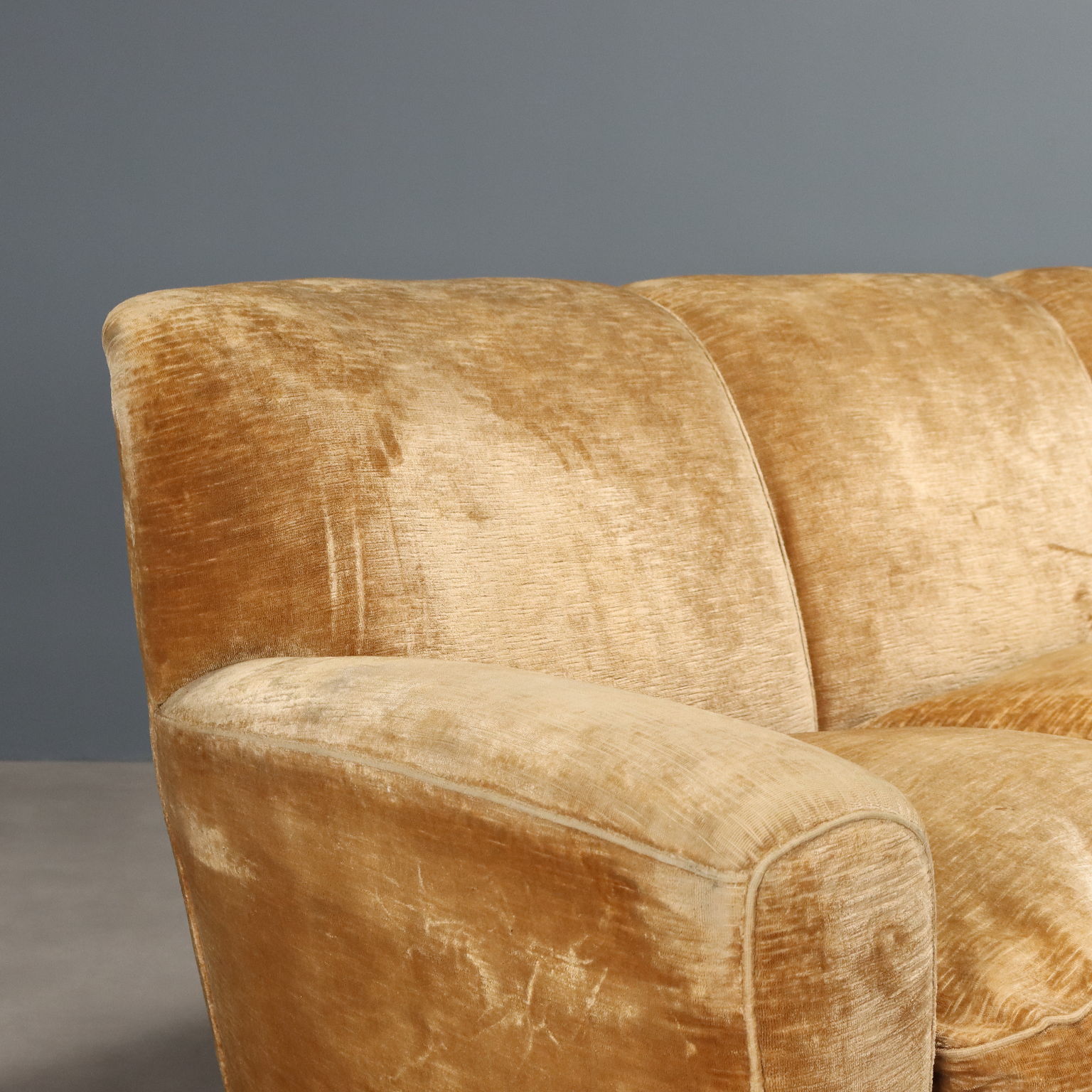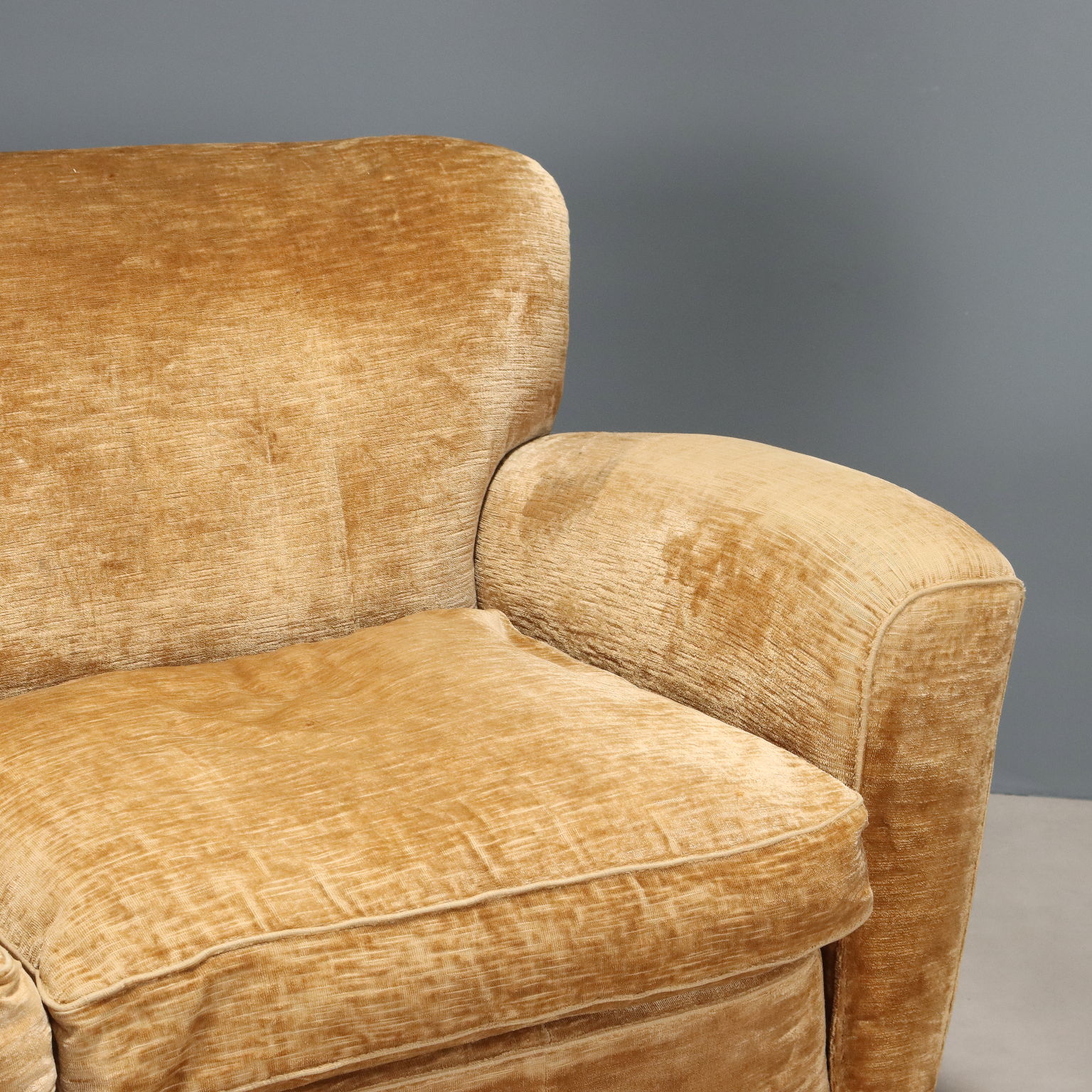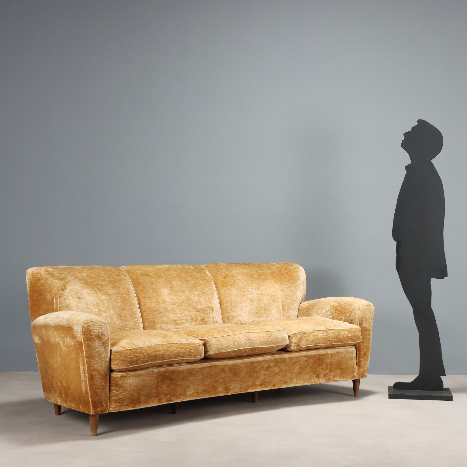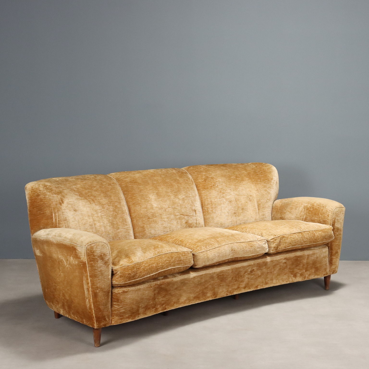 Divano vintage a tre posti con imbottitura a molle, cuscini in piuma, rivestimento in tessuto originale nei toni dell'ocra; piedini in legno. Seduta che si presta ad essere rinnovata nell'imbottitura e nella tappezzeria scegliendo tra i numerosi tessuti presenti nei nostri magazzini.