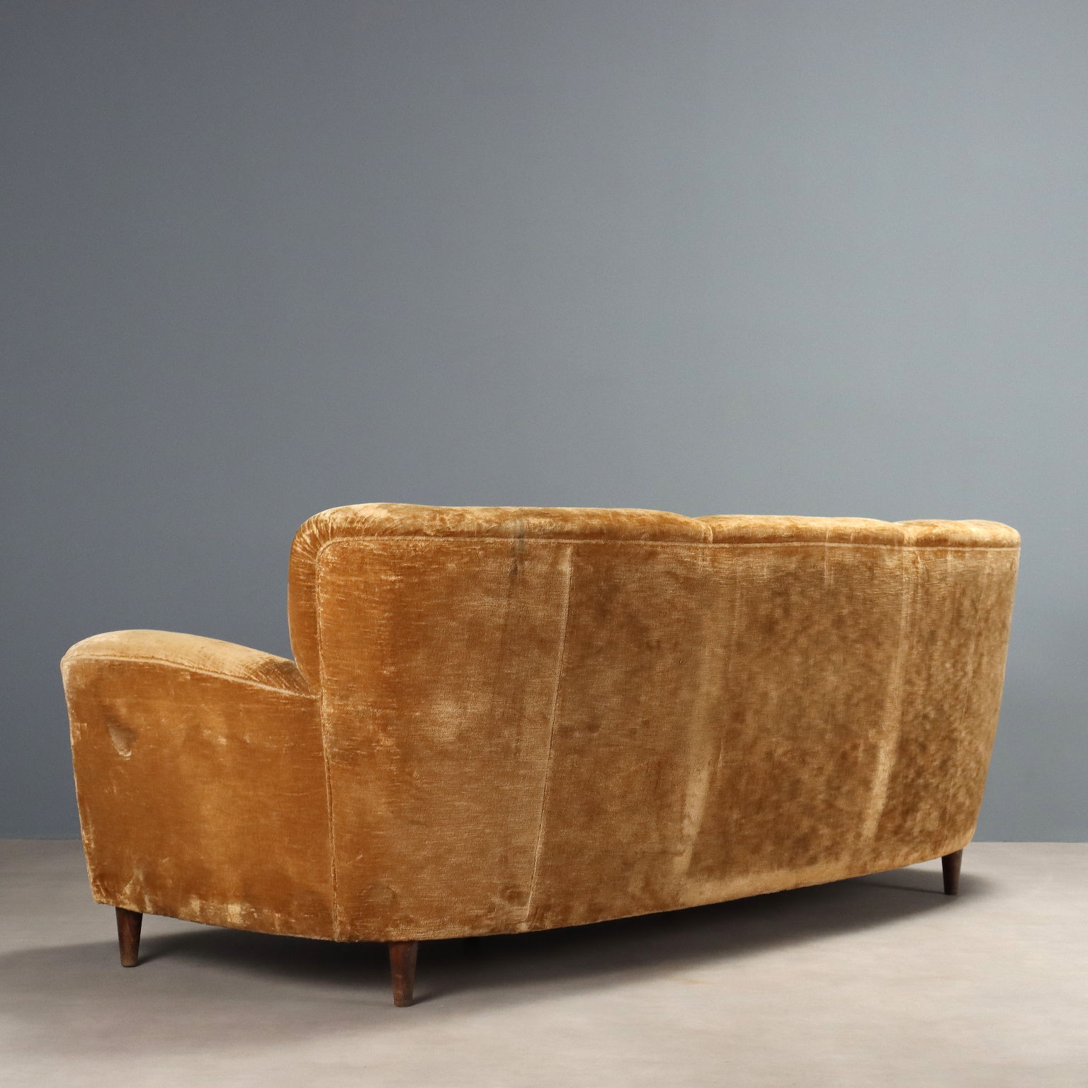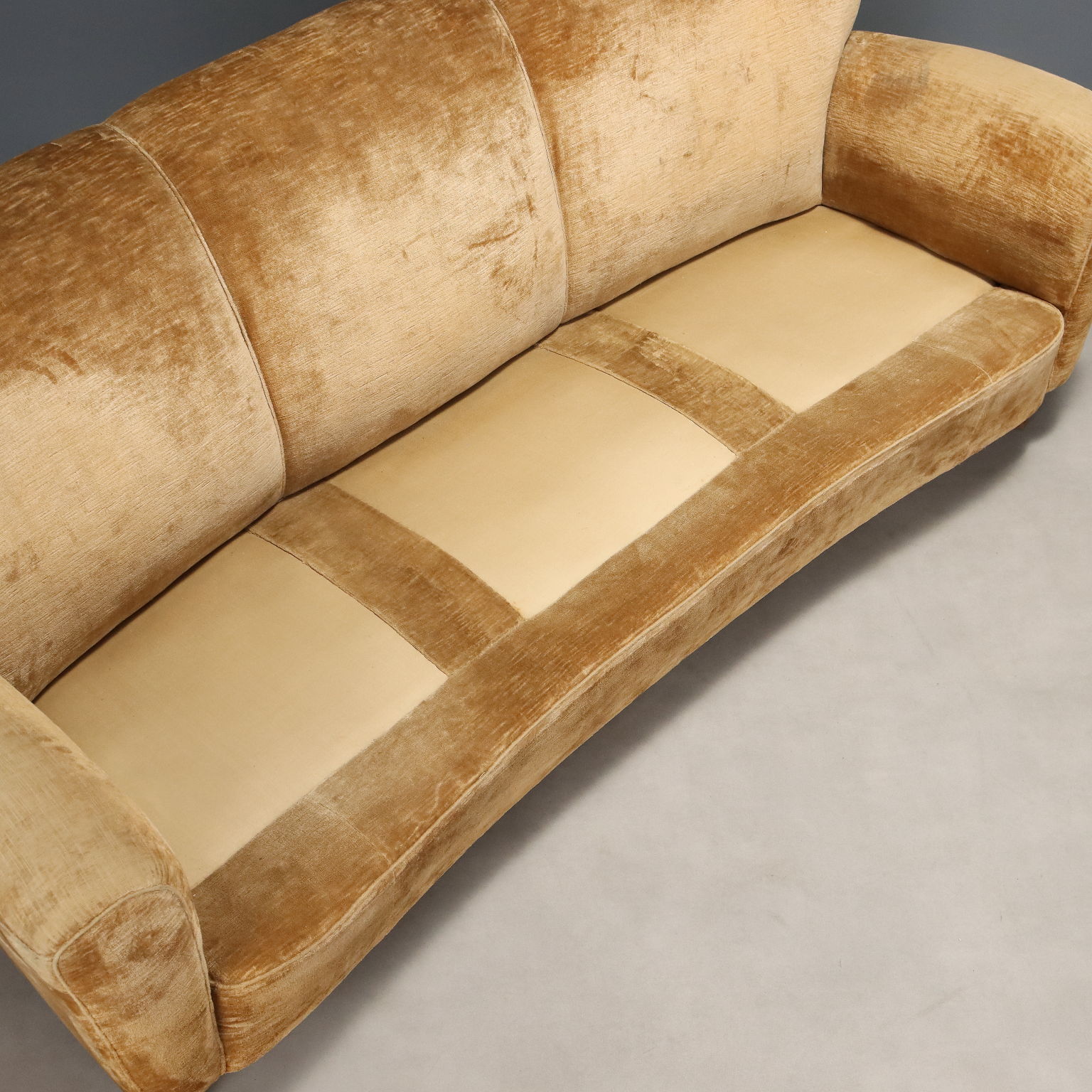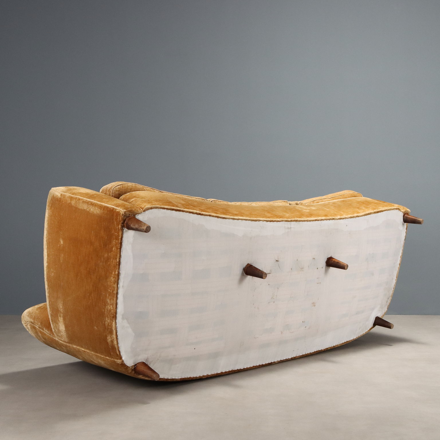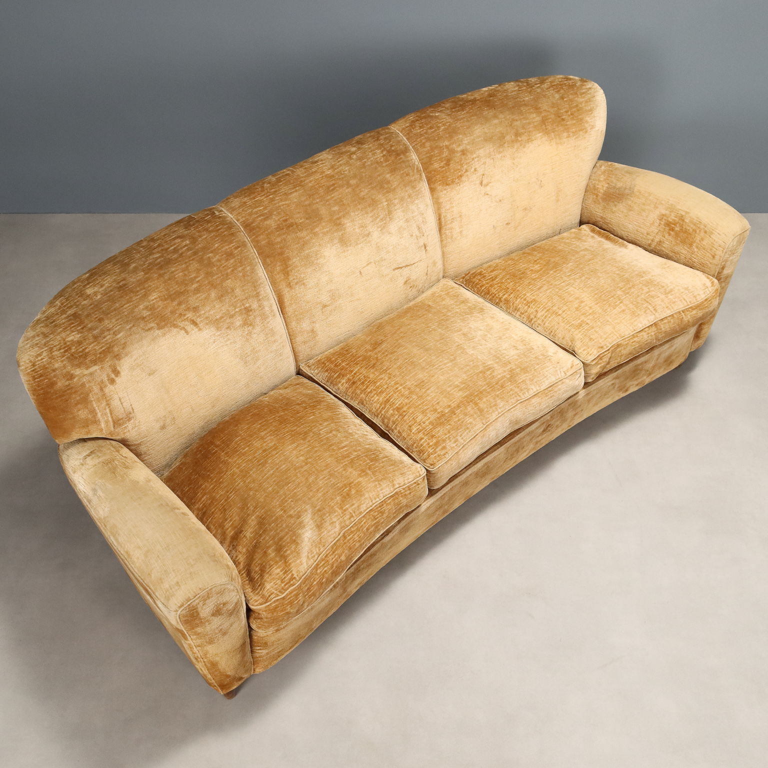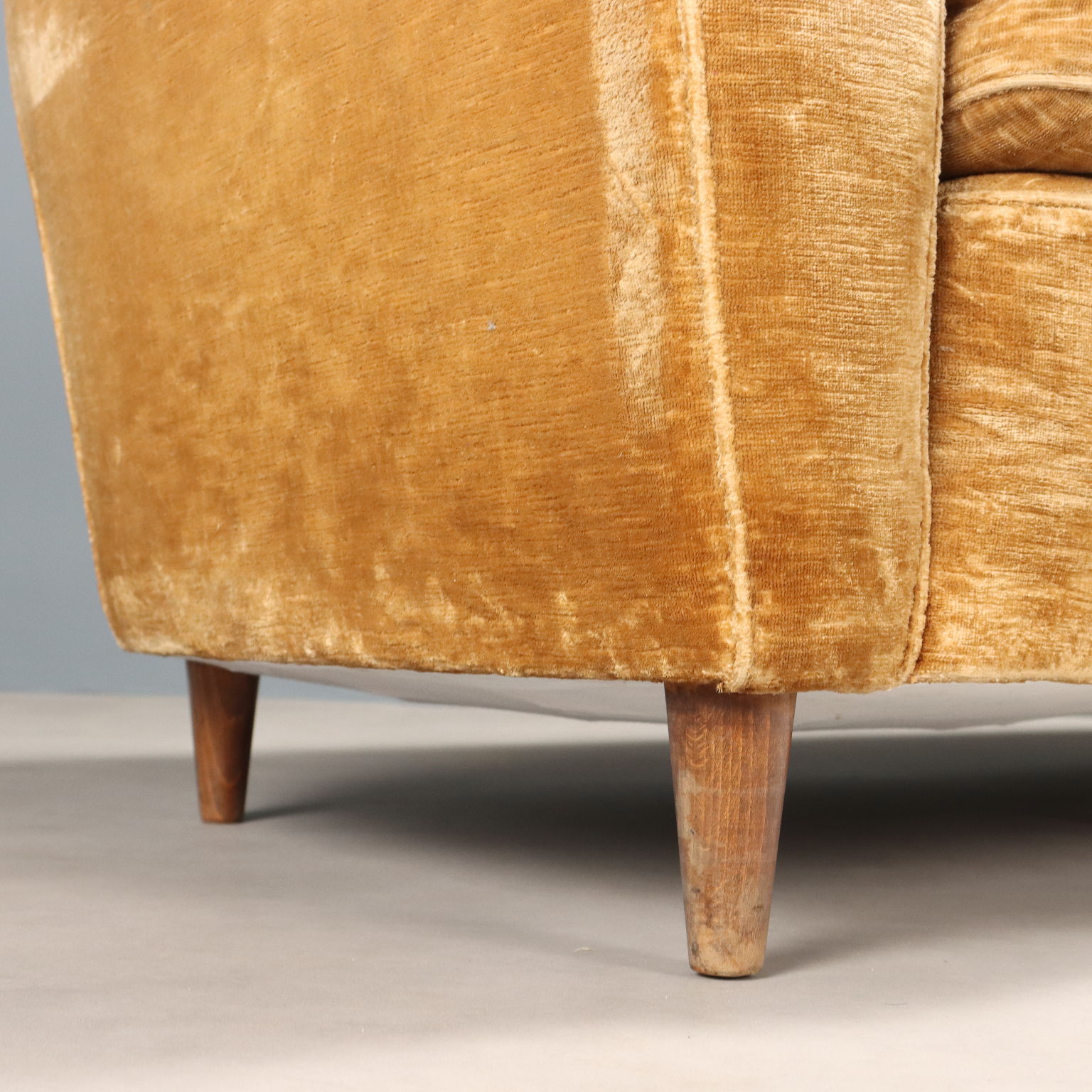 Divano vintage a tre posti con imbottitura a molle, cuscini in piuma, rivestimento in tessuto originale nei toni dell'ocra; piedini in legno. Seduta che si presta ad essere rinnovata nell'imbottitura e nella tappezzeria scegliendo tra i numerosi tessuti presenti nei nostri magazzini.