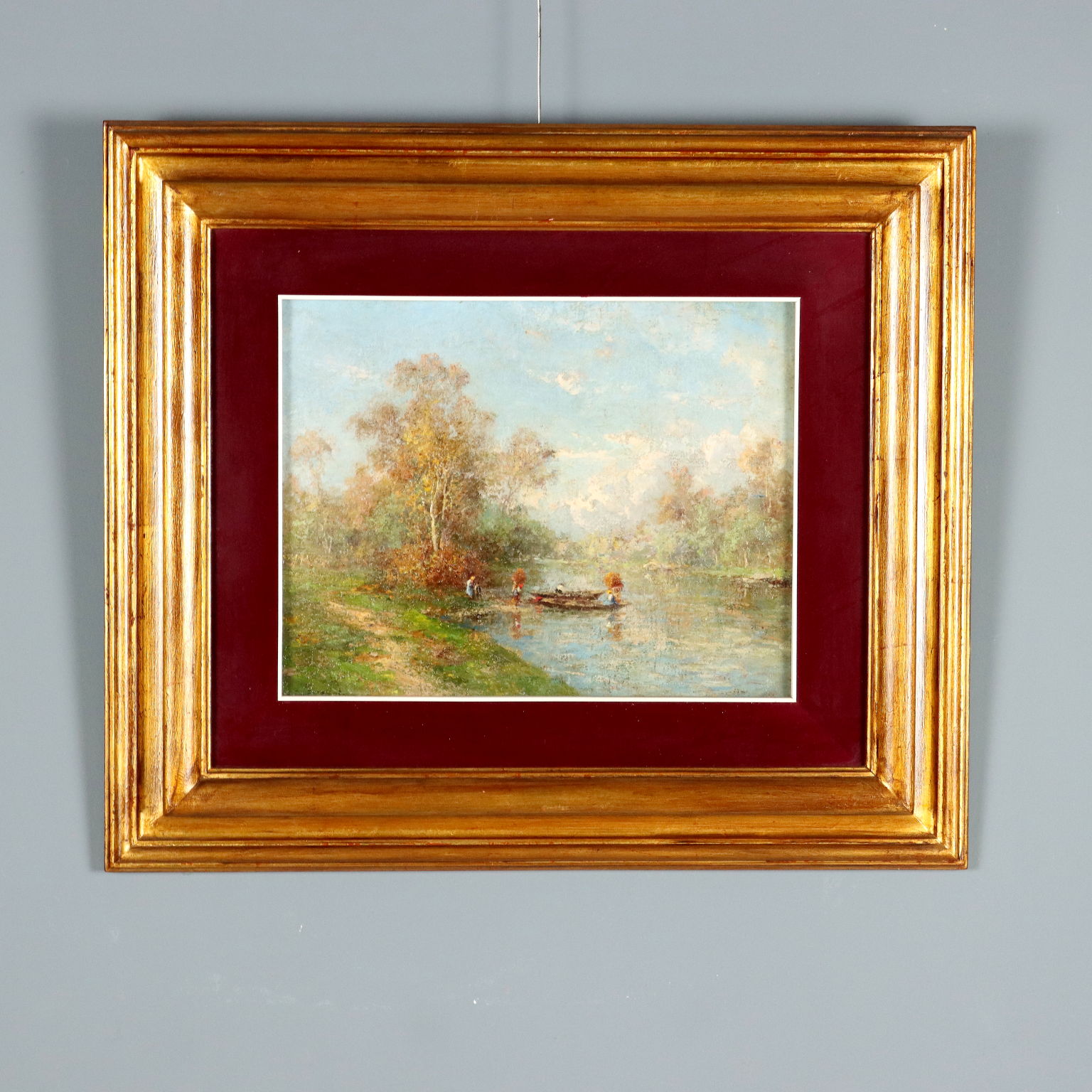 Dipinto di Ronaldo Casalini Baldelli - Paesaggio Fluviale con Barche e Figure
