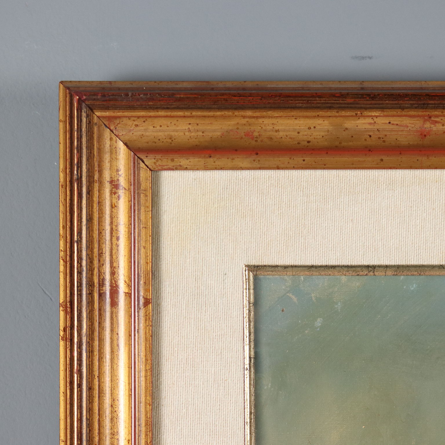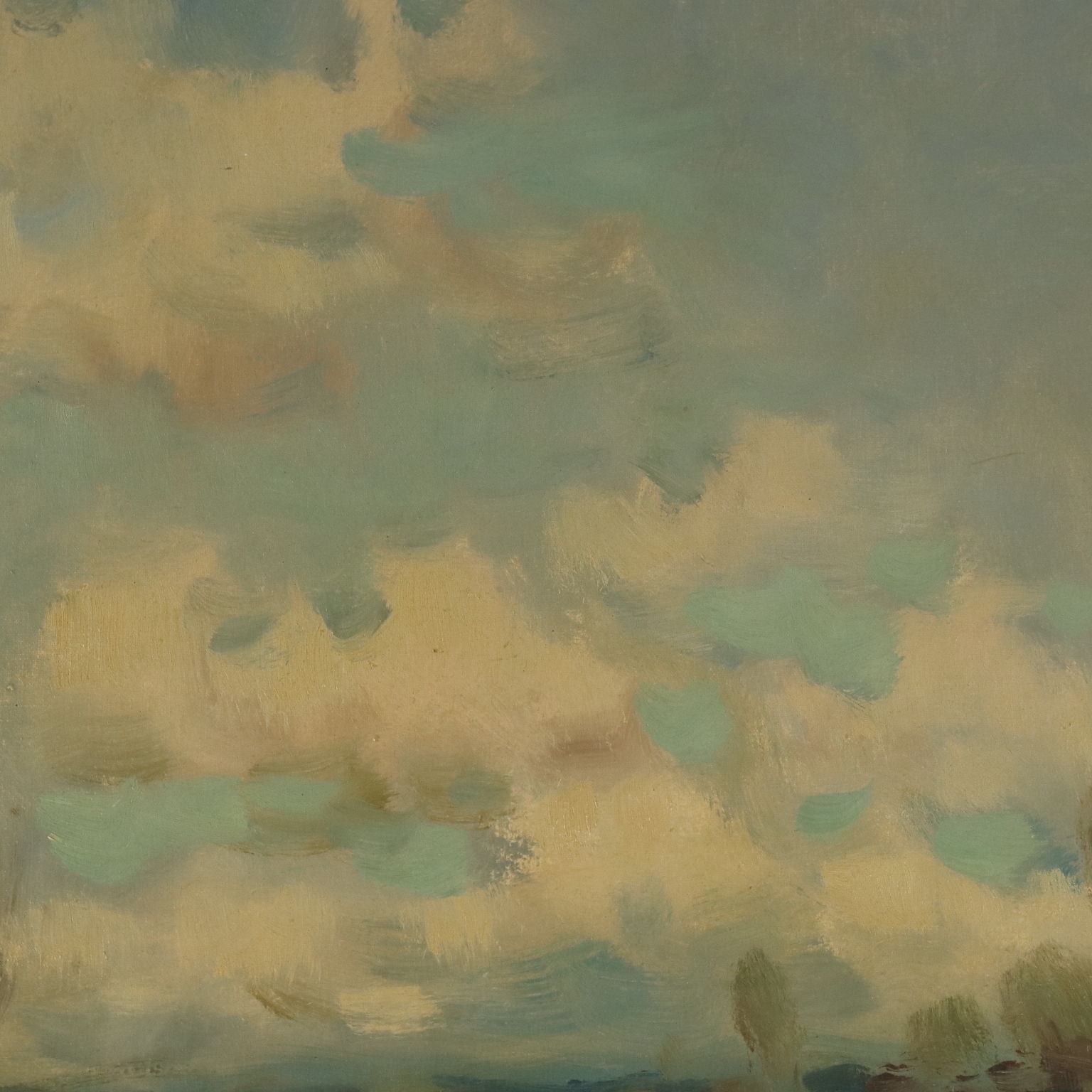 Olio su tela. Firmato in basso a destra. Ivan Karpoff, di origini russe ma cresciuto e affermatosi artisticamente in Italia, si fece apprezzare per la sua pittura orientata al verismo impressionistico italiano di fine '800; si dedicò prevalentemente ai paesaggi ed ai ritratti. In quest'opera propone uno scorcio di una campagna pianeggiante traversata da un ampio fiume; sul sentiero che lo costeggia camminano una donna con il suo bambino. In cornice.