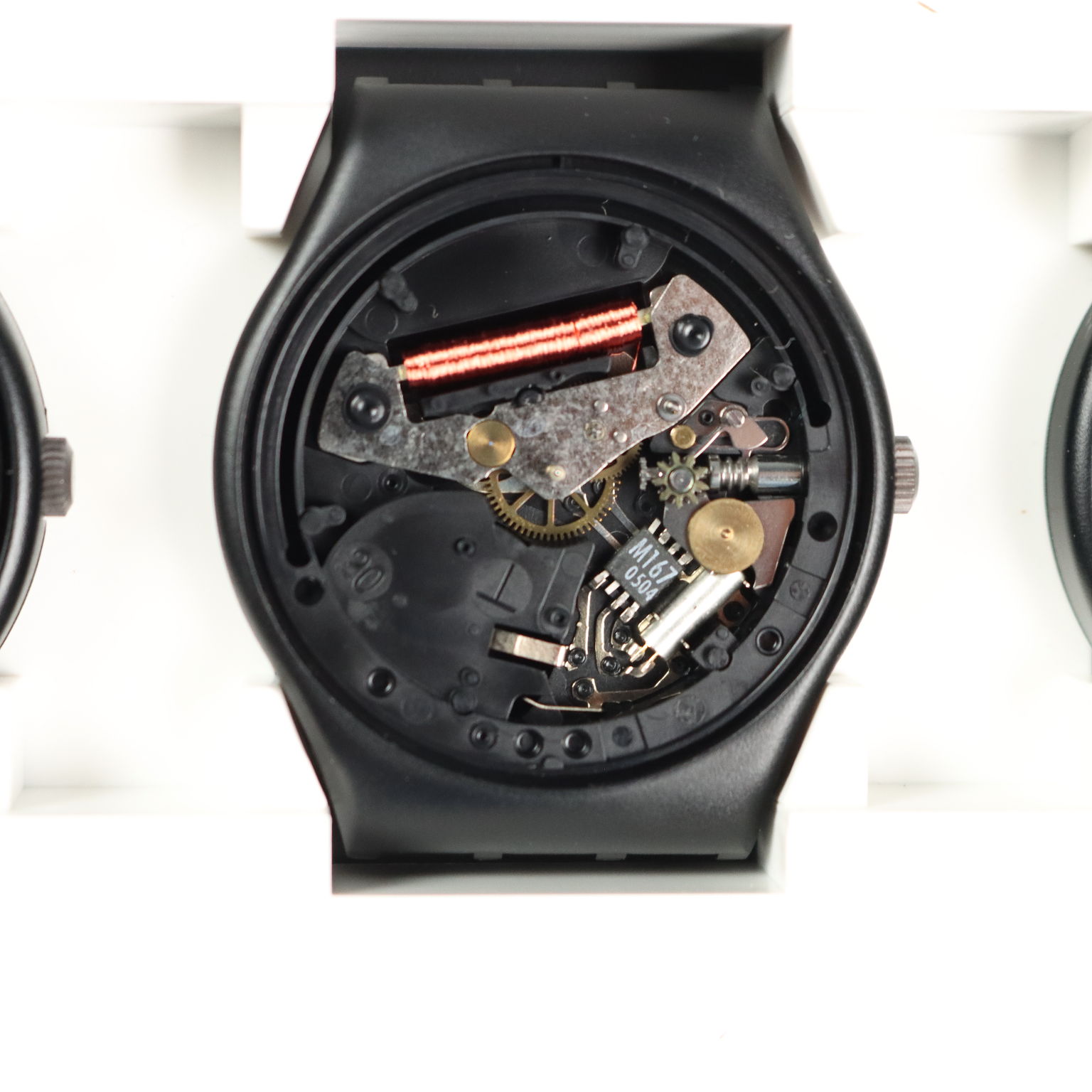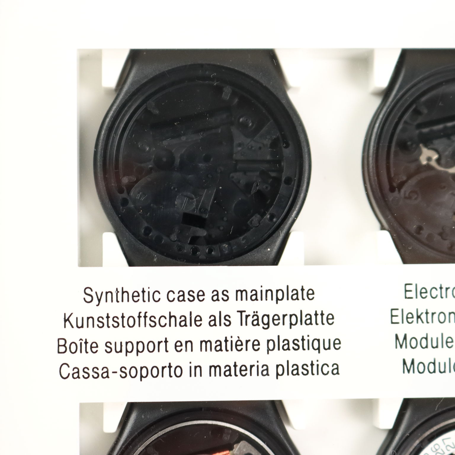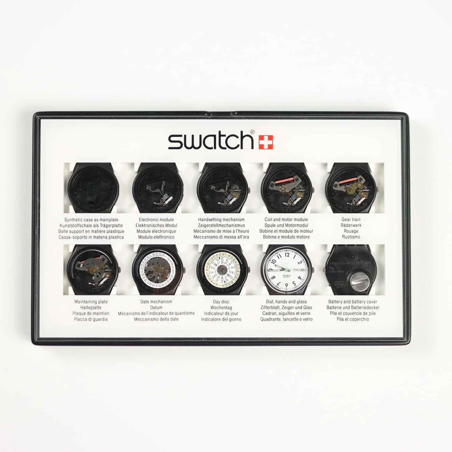Cofanetto espositivo rappresentante i 10 passaggi di costruzione dell'orologio Swatch.