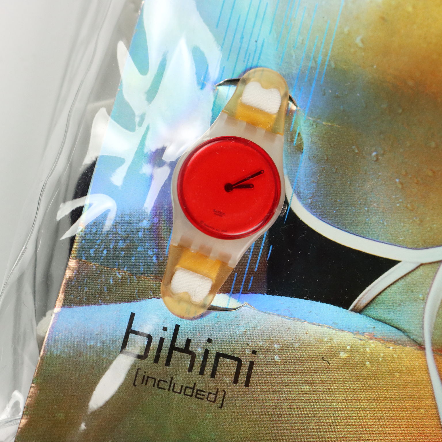 Gruppo di 4 orologi a tema "Accessori Moda". Polsino Swatch Cuff PMK117, Pop Swatch Foulard PMK119, Rainbow Bikini LW129, Unique Clip-on PMK117. Orologio Swatch nuovo, non usato e non indossato. Nella confezione originale. Orologio con movimento al quarzo