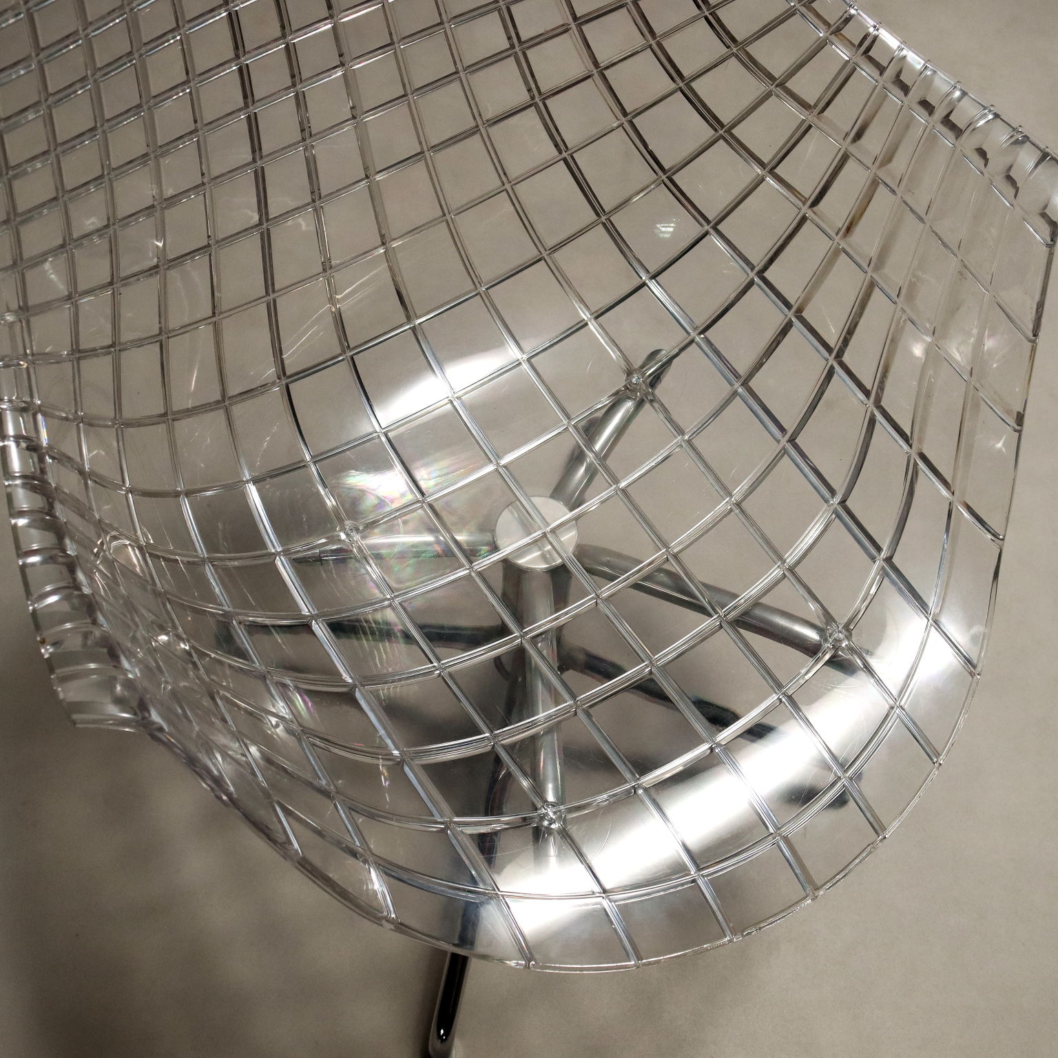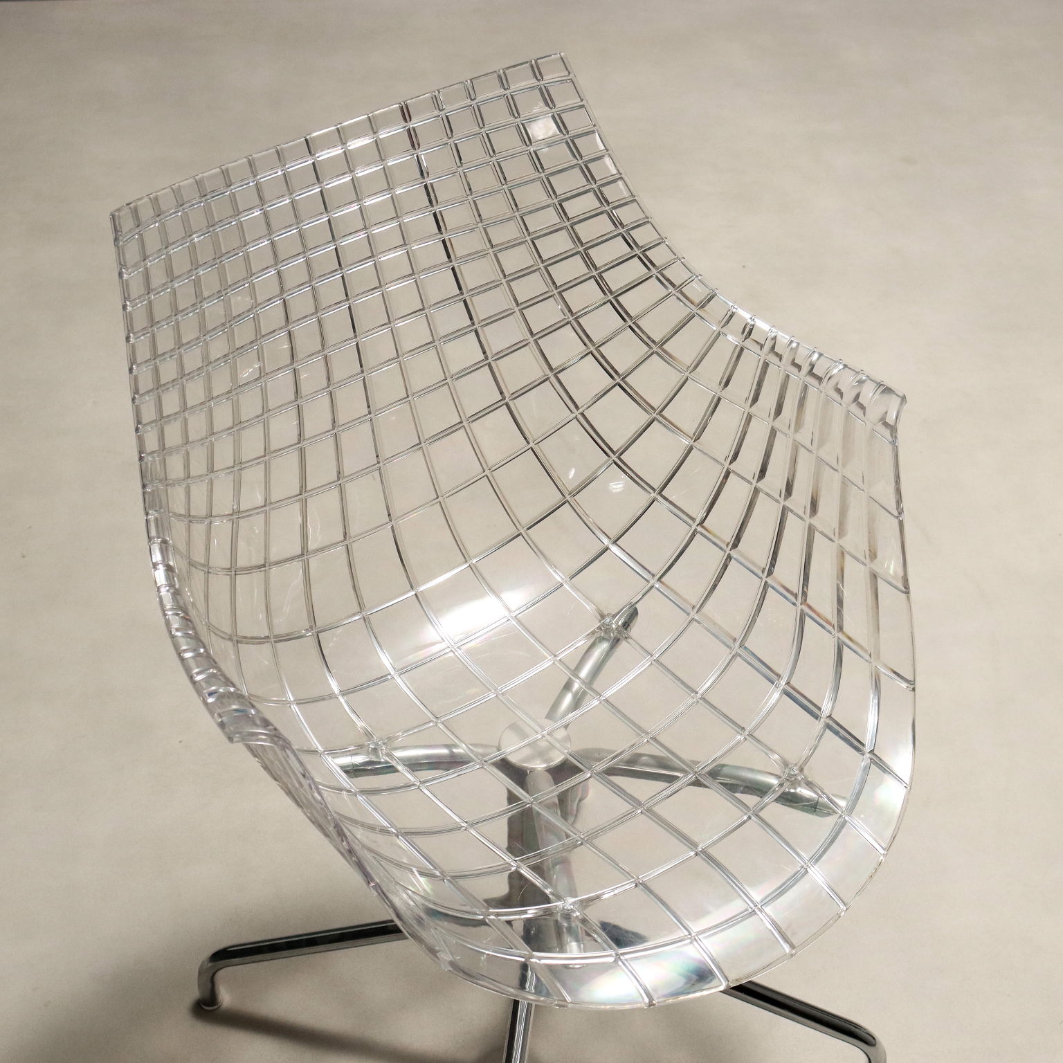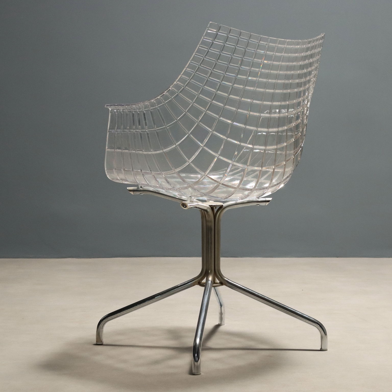 Descrizione Poltroncina con scocca in materiale plastico trasparente e gambe in acciaio cromato.