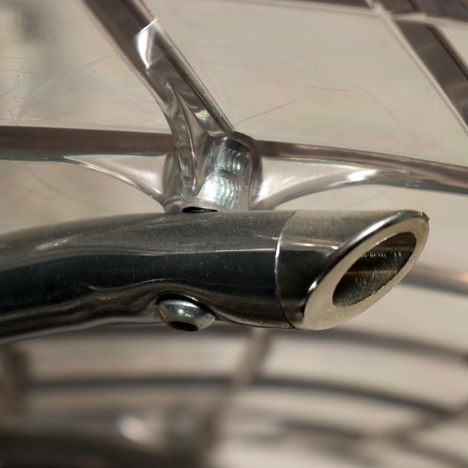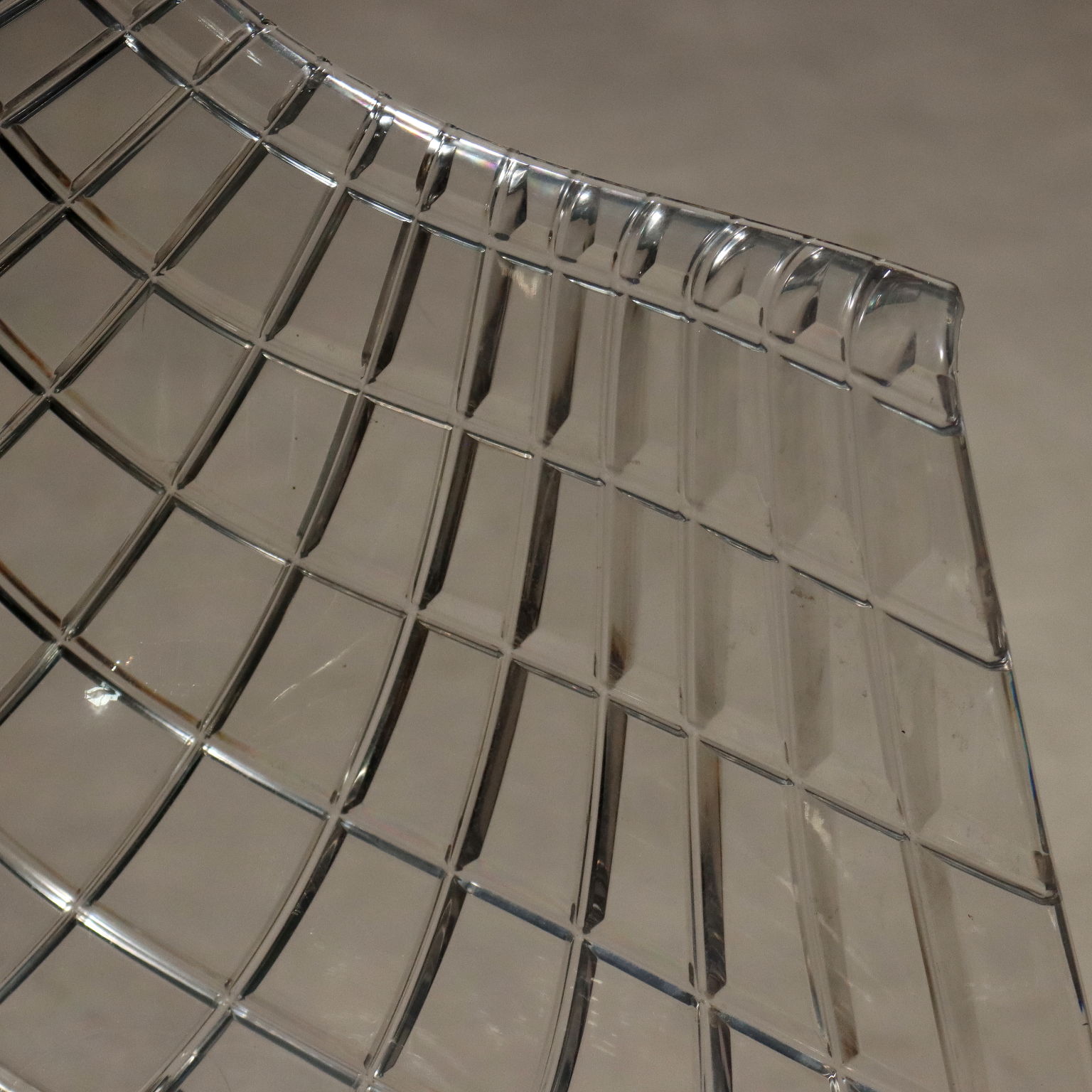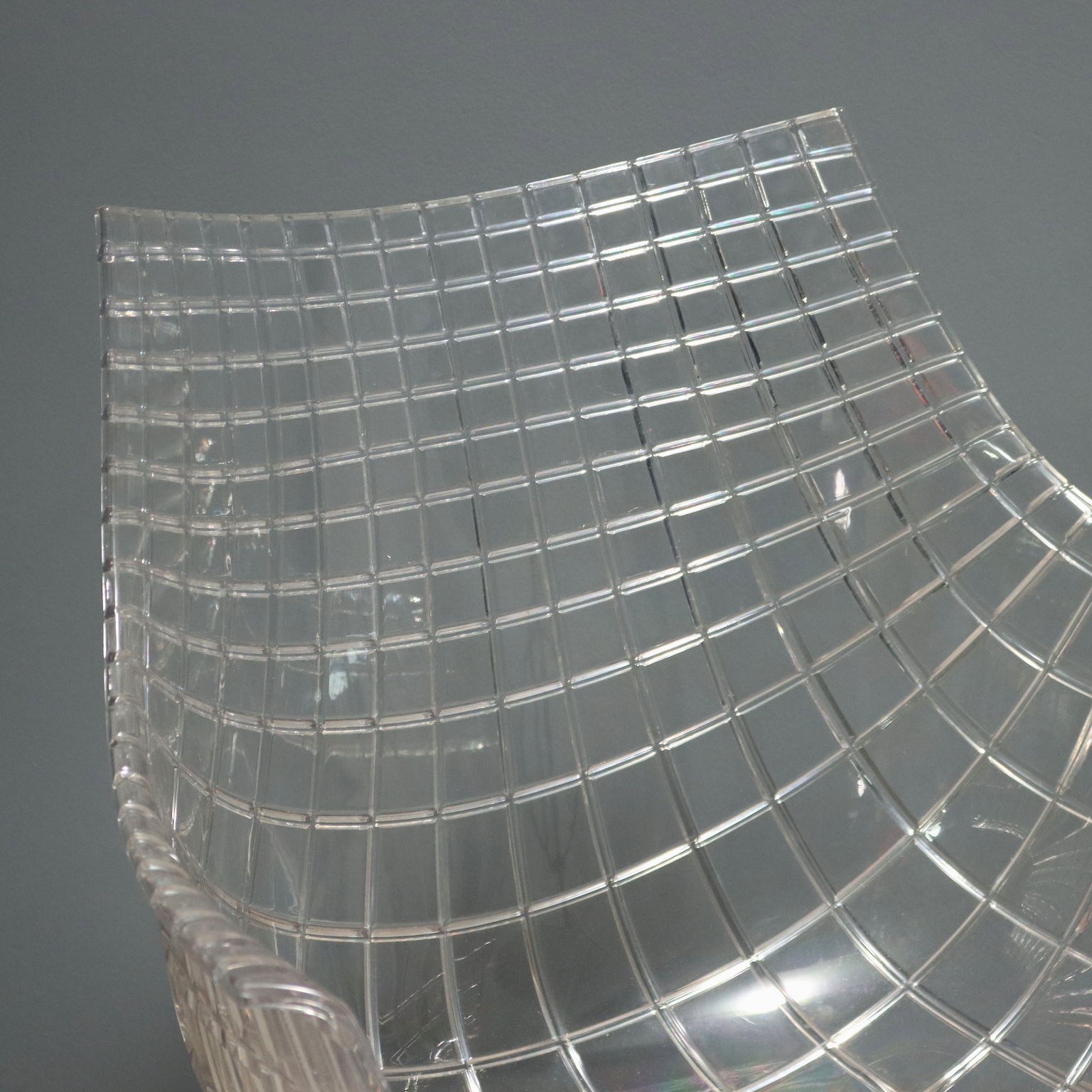 Descrizione Poltroncina con scocca in materiale plastico trasparente e gambe in acciaio cromato.