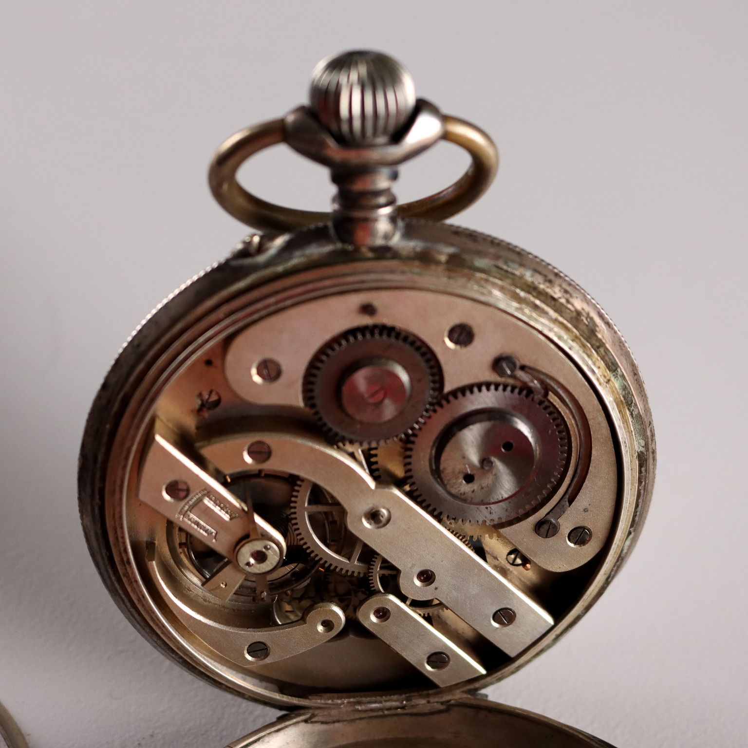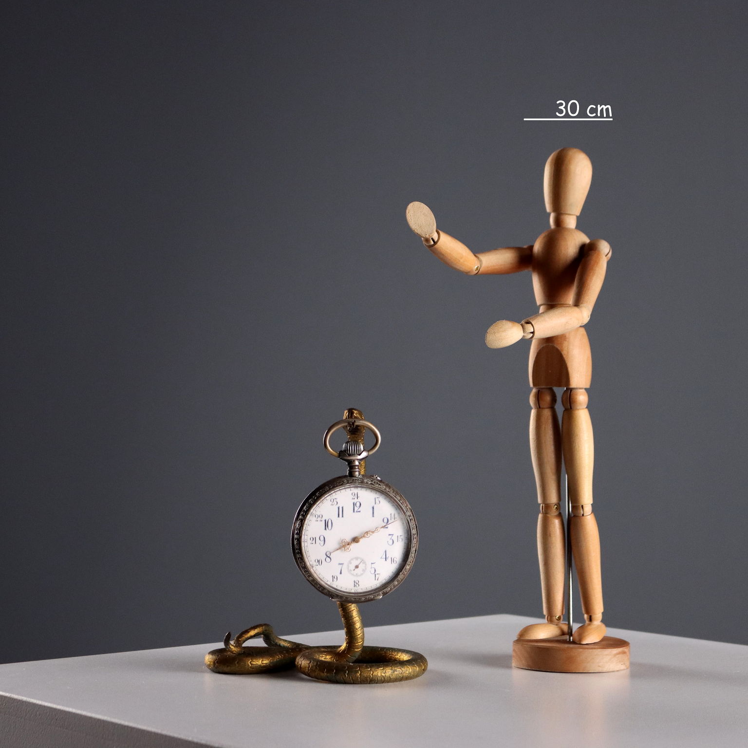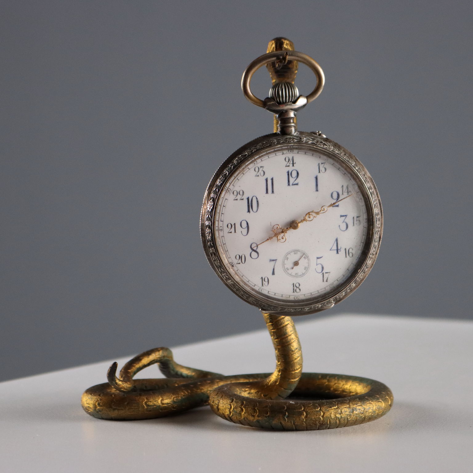Orologio a cipolla in argento con decoro raffigurante locomotore inciso dentro riserva. Quadrante in metallo smaltato con ore e minuti a numeri arabi. Lancette in bronzo dorato finemente traforate. Marchi della manifattura e dell'argento incussi sotto il coperchio. Marchio dell'argentiere J.W. non identificato. Supporto in bronzo a foggia di serpente.