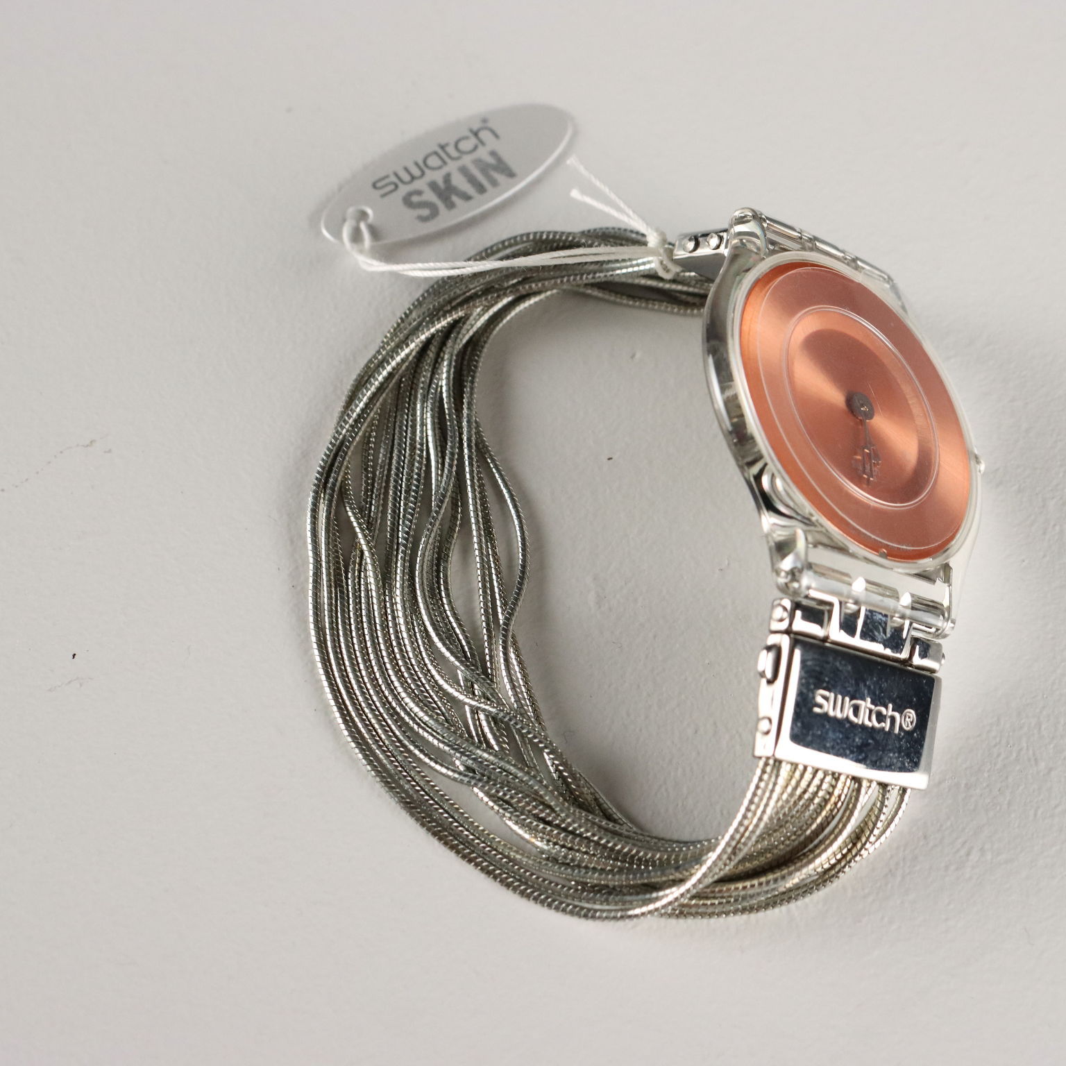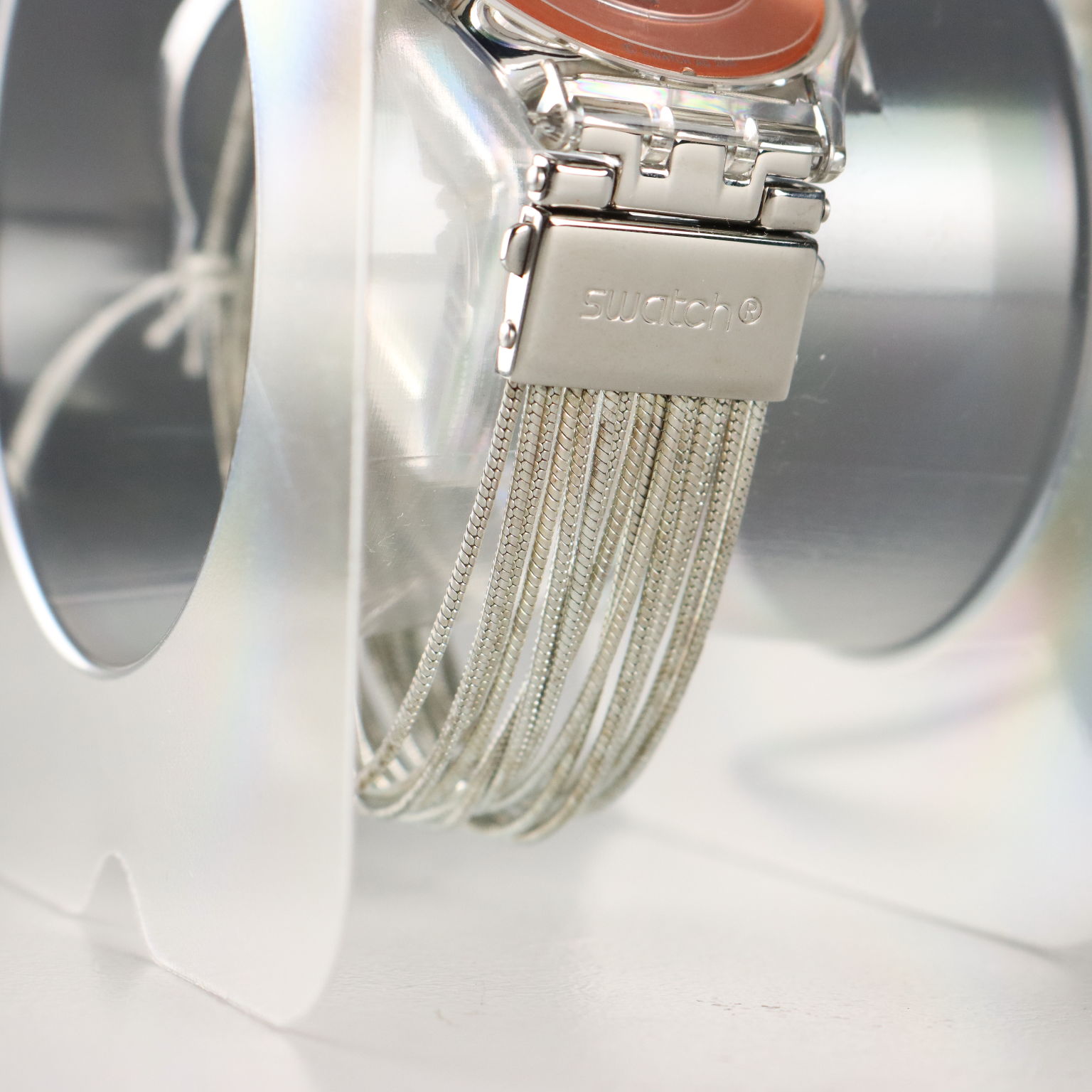 Swatch Skin SFK130 Silver Meshstream Blue e SFK132 Silver Meshstream Saumon. Il rarissimo Swatch Skin Silver Meshstream è sia un accessorio meraviglioso che un gioiello. Il quadrante azzurro (SFK130) o salmone (SFK132) presenta semplici lancette argentate ed è racchiuso in una cassa trasparente. L'elegante cinturino è composto da 15 catene a serpente in argento 925. Orologio Swatch nuovo, non usato e non indossato. Nella confezione originale. Orologio con movimento al quarzo, cinturino argento, cassa argento, quadrante blu/salmone, lancette argento. Misura cassa orologio 34mm.