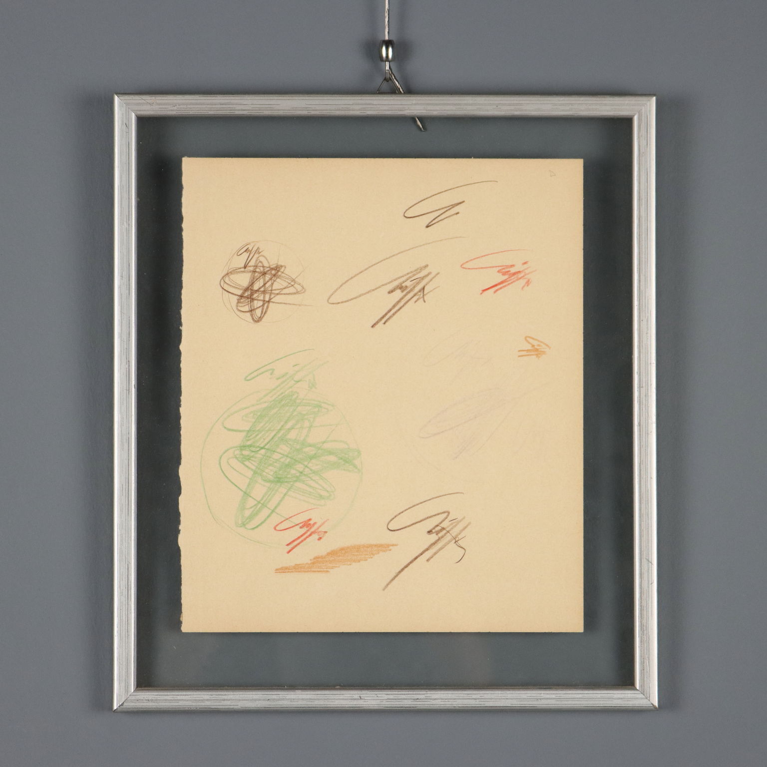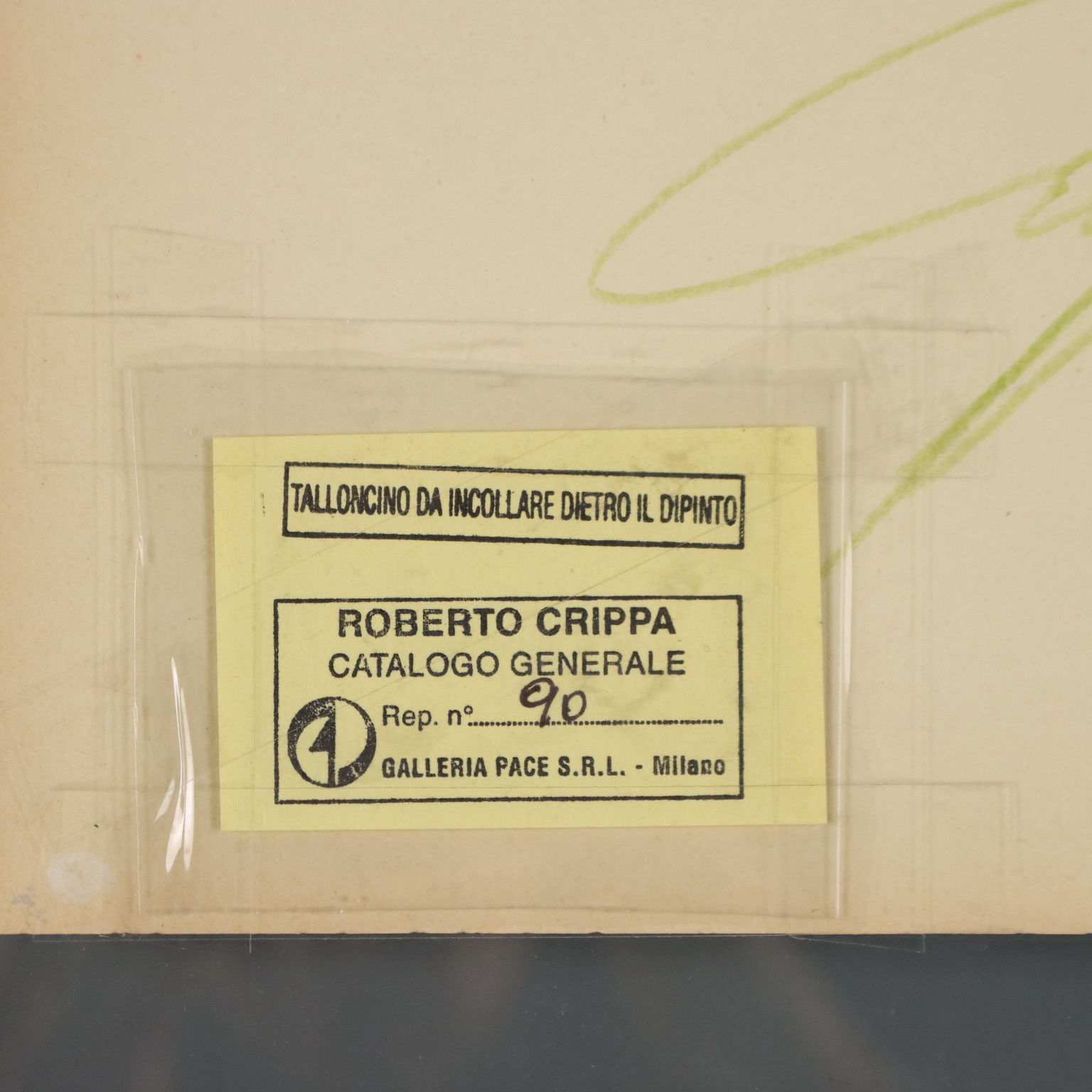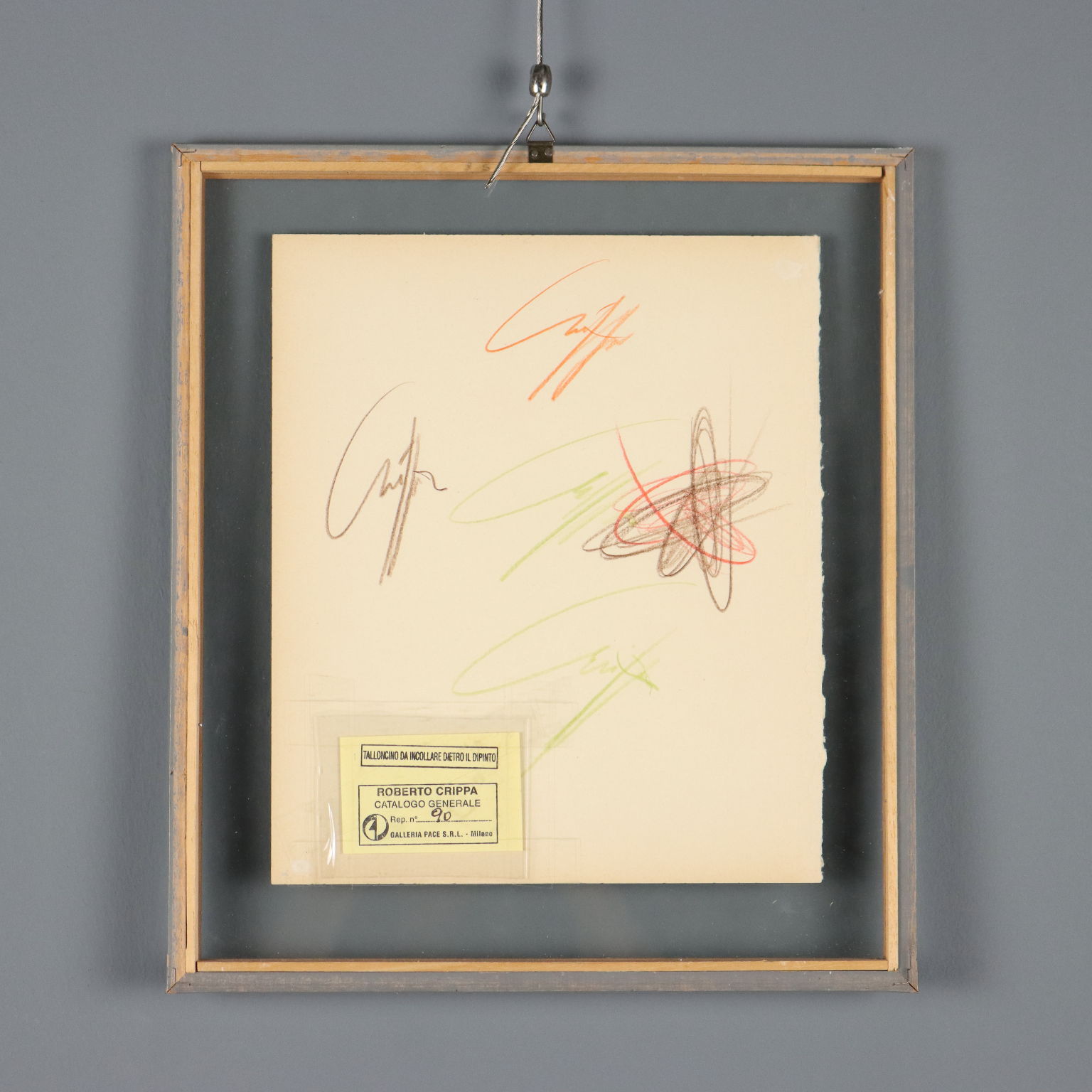Pastelli colorati su carta, disegni sia al fronte che al retro. Sul retro è presente talloncino del Catalogo Generale Roberto Crippa, con numero di catalogazione. L'opera è corredata da autentica su foto della Galleria Pace di Milano, firmata dall'artista e riportante i dati tecnici. Roberto Crippa fu un esponente dello Spazialismo italiano, di cui firmò il Terzo Manifesto redatto da Lucio Fontana nel 1950. Le sue opere sono caratterizzate da figure geometriche astratte, che a partire dal 1955 divennero polimateriche, cioè realizzate assemblando diversi materiali, anche molto diversi tra loro (ferro, bronzo, amianto, sughero, velina), uniti poi dal colore. Fin dall'inizio degli anni cinquanta Crippa iniziò la sua serie di dipinti detti Spirali, di carattere geometrico e astratto: con il gesto geometrico quasi-circolare (ma mai perfettamente tondo) Crippa creava degli spazi involuti, da cui si generavano raggi che idealmente si proiettavano fuori dalla bidimensionalità della tela. Opera in cornice.