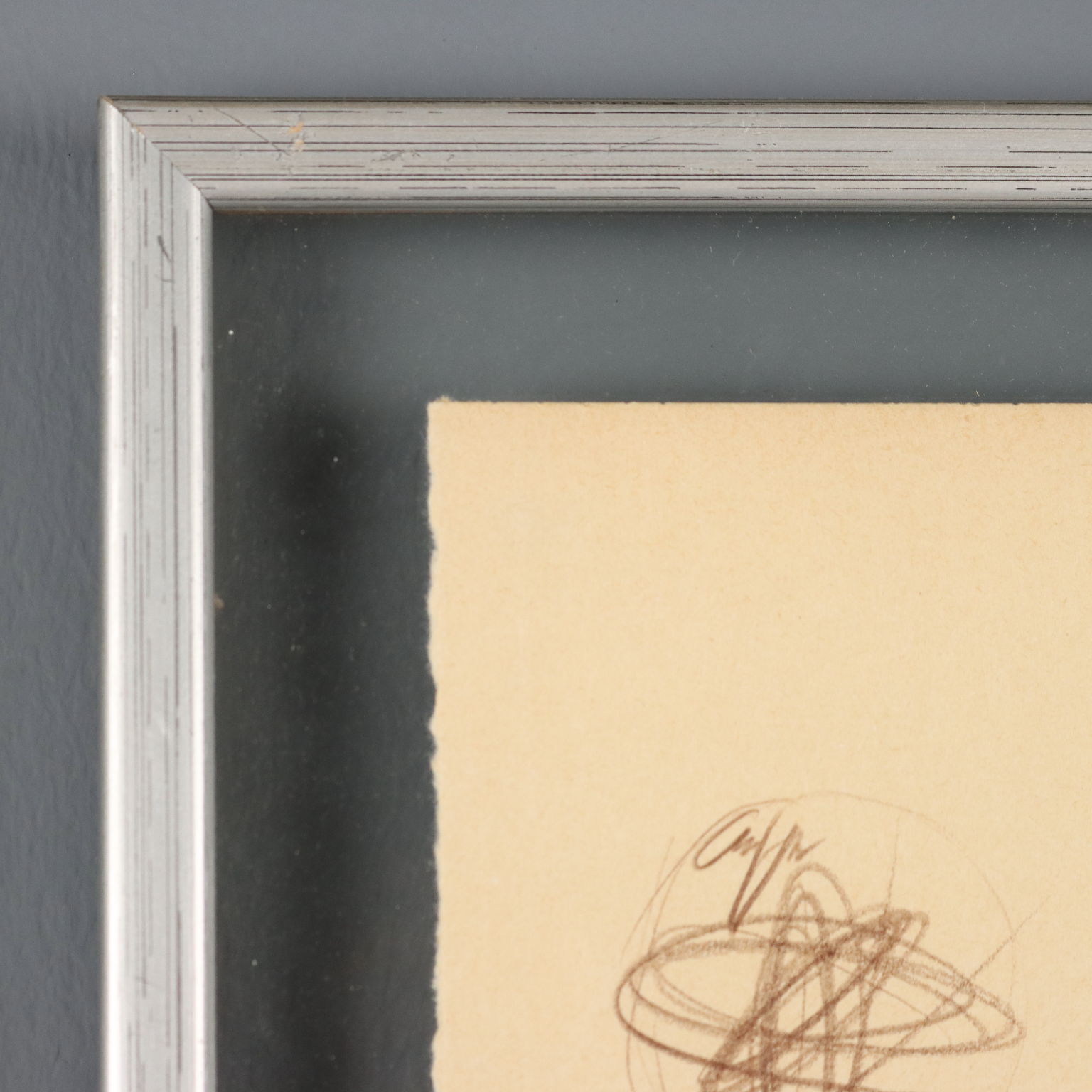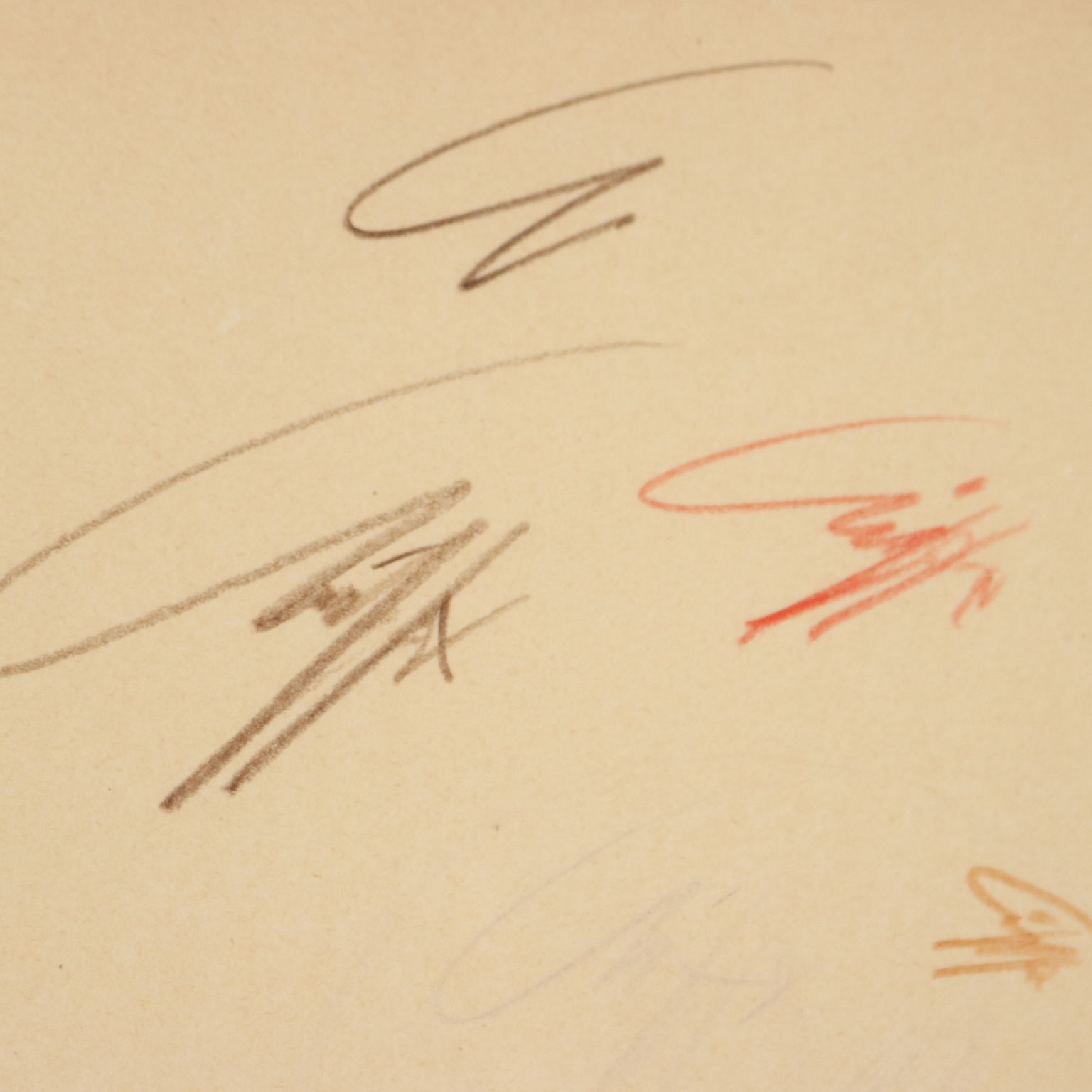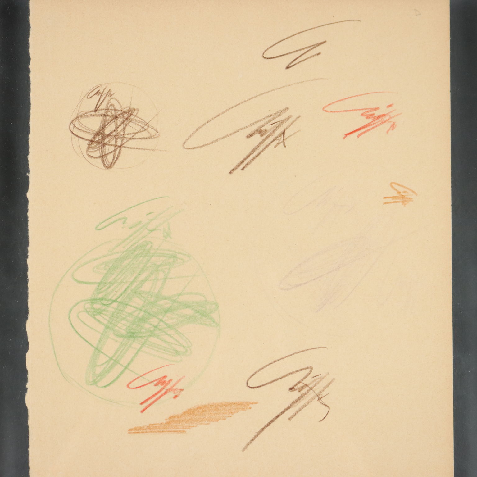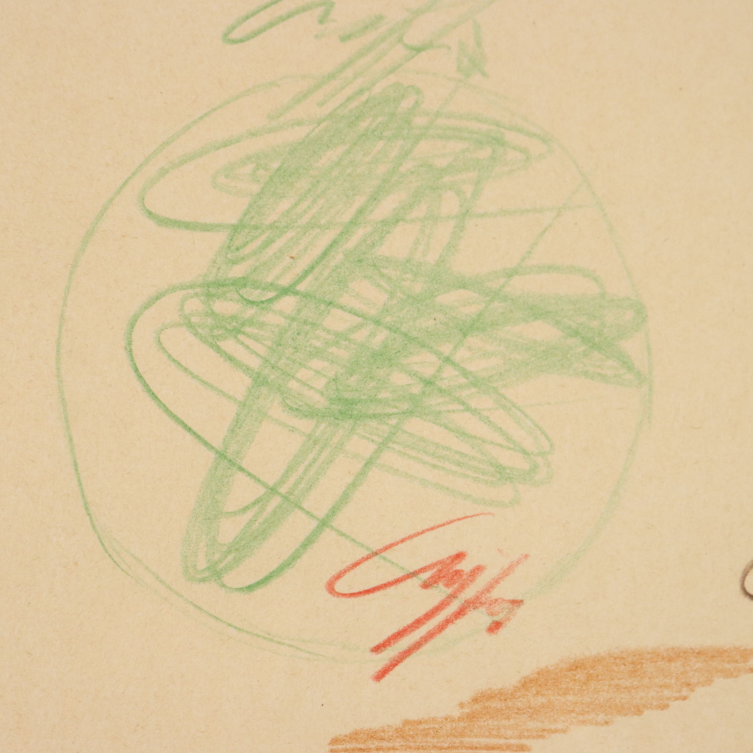 Pastelli colorati su carta, disegni sia al fronte che al retro. Sul retro è presente talloncino del Catalogo Generale Roberto Crippa, con numero di catalogazione. L'opera è corredata da autentica su foto della Galleria Pace di Milano, firmata dall'artista e riportante i dati tecnici. Roberto Crippa fu un esponente dello Spazialismo italiano, di cui firmò il Terzo Manifesto redatto da Lucio Fontana nel 1950. Le sue opere sono caratterizzate da figure geometriche astratte, che a partire dal 1955 divennero polimateriche, cioè realizzate assemblando diversi materiali, anche molto diversi tra loro (ferro, bronzo, amianto, sughero, velina), uniti poi dal colore. Fin dall'inizio degli anni cinquanta Crippa iniziò la sua serie di dipinti detti Spirali, di carattere geometrico e astratto: con il gesto geometrico quasi-circolare (ma mai perfettamente tondo) Crippa creava degli spazi involuti, da cui si generavano raggi che idealmente si proiettavano fuori dalla bidimensionalità della tela. Opera in cornice.