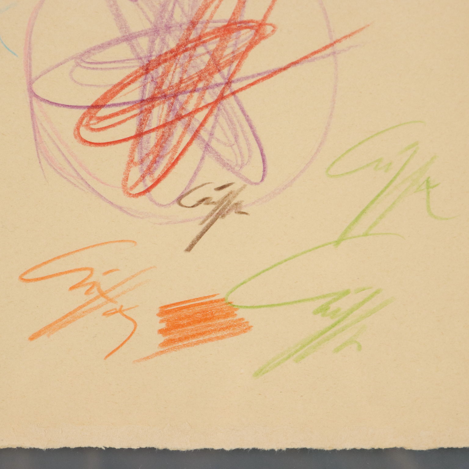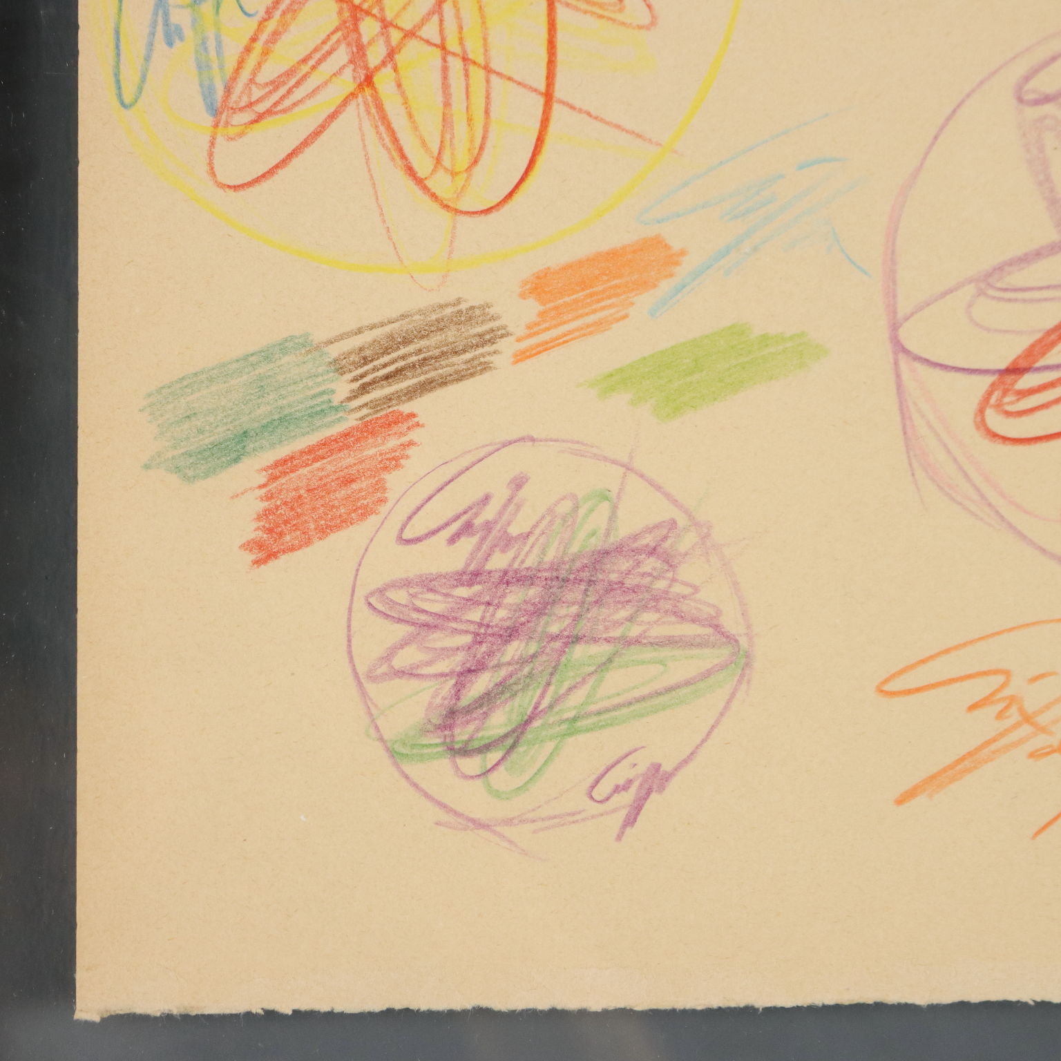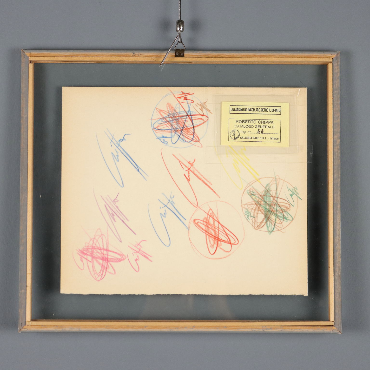 Pastelli colorati su carta, disegni sia al fronte che al retro. Sul retro è presente talloncino del Catalogo Generale Roberto Crippa, con numero di catalogazione. L'opera è corredata da autentica su foto della Galleria Pace di Milano, firmata dall'artista e riportante i dati tecnici. Roberto Crippa fu un esponente dello Spazialismo italiano, di cui firmò il Terzo Manifesto redatto da Lucio Fontana nel 1950. Le sue opere sono caratterizzate da figure geometriche astratte, che a partire dal 1955 divennero polimateriche, cioè realizzate assemblando diversi materiali, anche molto diversi tra loro (ferro, bronzo, amianto, sughero, velina), uniti poi dal colore. Fin dall'inizio degli anni cinquanta Crippa iniziò la sua serie di dipinti detti Spirali, di carattere geometrico e astratto: con il gesto geometrico quasi-circolare (ma mai perfettamente tondo) Crippa creava degli spazi involuti, da cui si generavano raggi che idealmente si proiettavano fuori dalla bidimensionalità della tela. Opera in cornice.