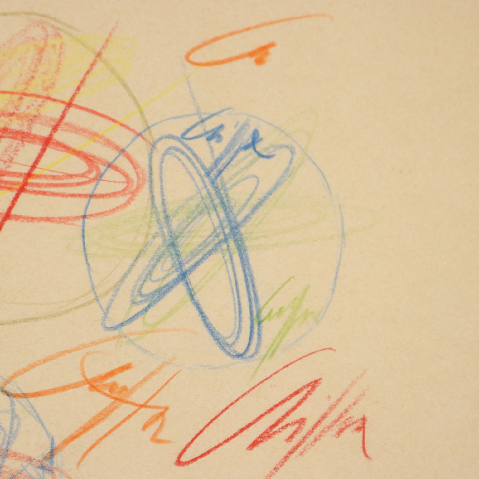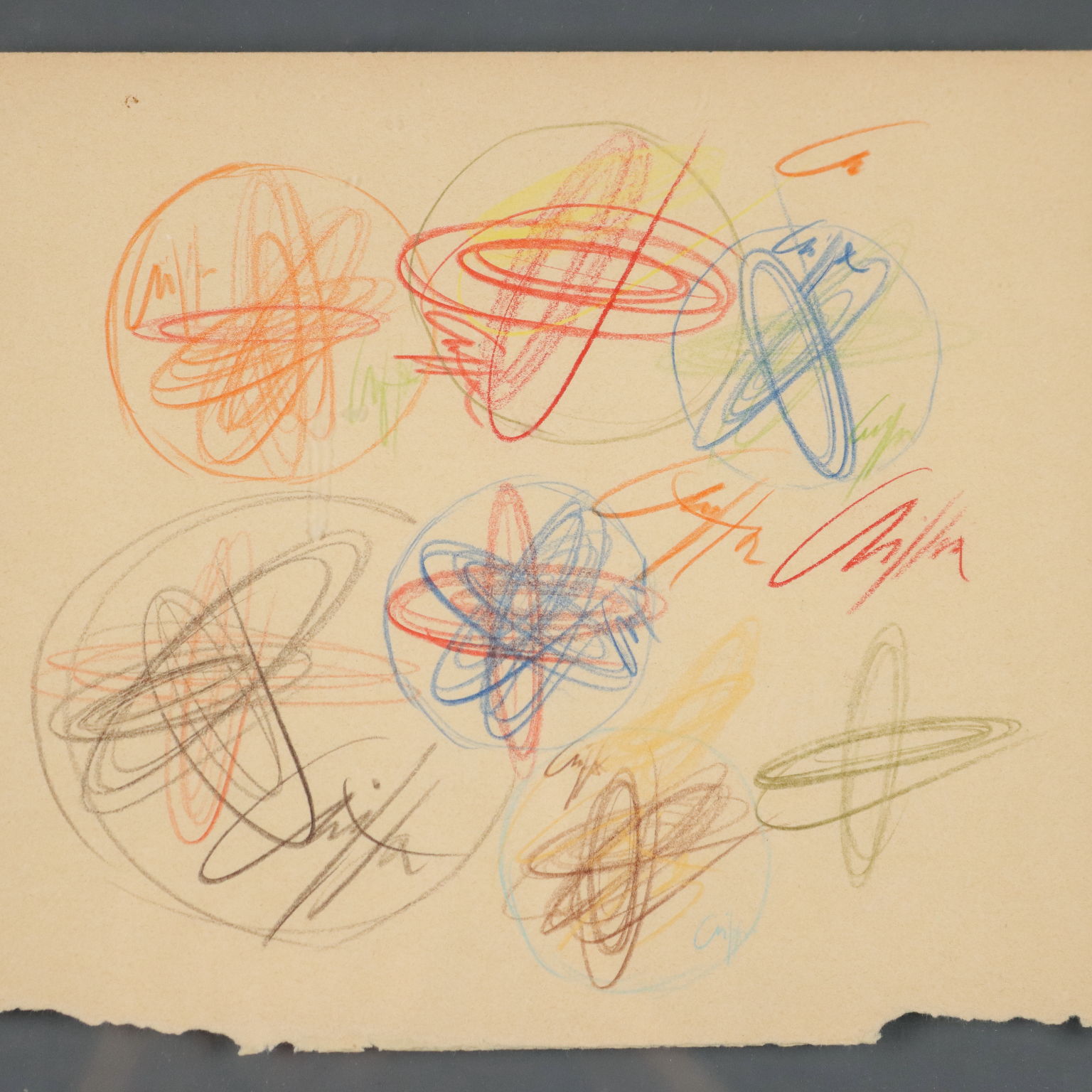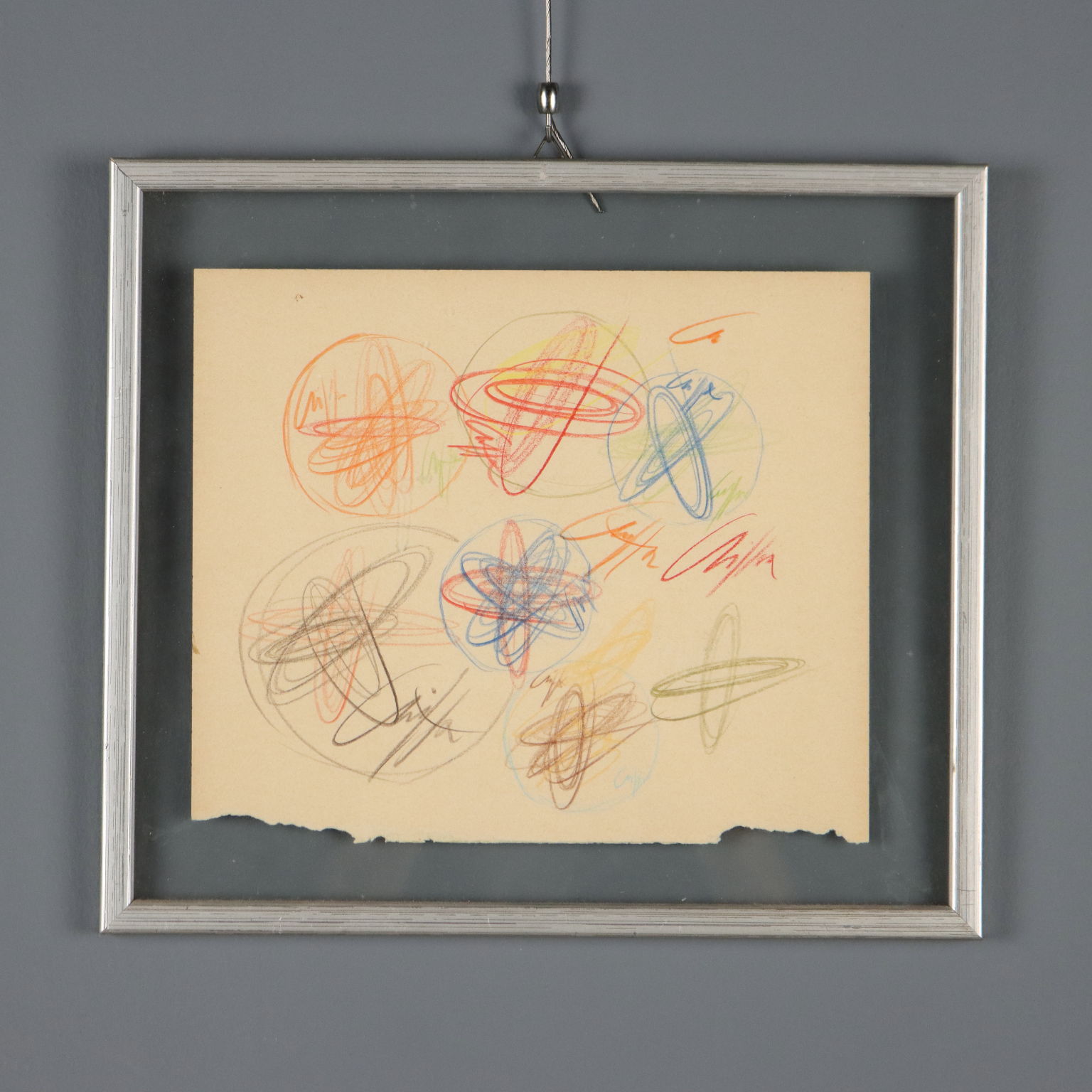 Pastelli colorati su carta, disegni sia al fronte che al retro. Sul retro è presente talloncino del Catalogo Generale Roberto Crippa, con numero di catalogazione. L'opera è corredata da autentica su foto della Galleria Pace di Milano, firmata dall'artista e riportante i dati tecnici. Roberto Crippa fu un esponente dello Spazialismo italiano, di cui firmò il Terzo Manifesto redatto da Lucio Fontana nel 1950. Le sue opere sono caratterizzate da figure geometriche astratte, che a partire dal 1955 divennero polimateriche, cioè realizzate assemblando diversi materiali, anche molto diversi tra loro (ferro, bronzo, amianto, sughero, velina), uniti poi dal colore. Fin dall'inizio degli anni cinquanta Crippa iniziò la sua serie di dipinti detti Spirali, di carattere geometrico e astratto: con il gesto geometrico quasi-circolare (ma mai perfettamente tondo) Crippa creava degli spazi involuti, da cui si generavano raggi che idealmente si proiettavano fuori dalla bidimensionalità della tela. Opera in cornice.
