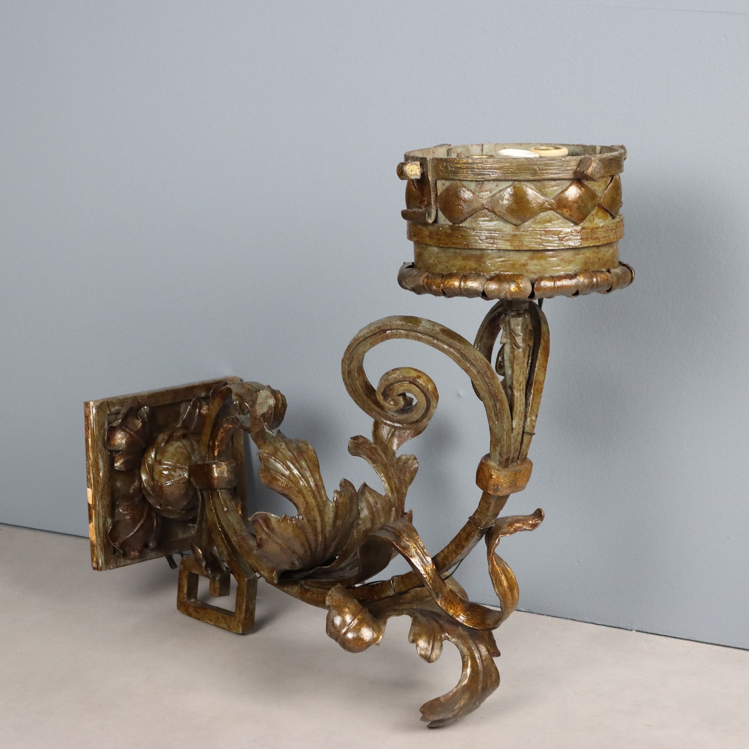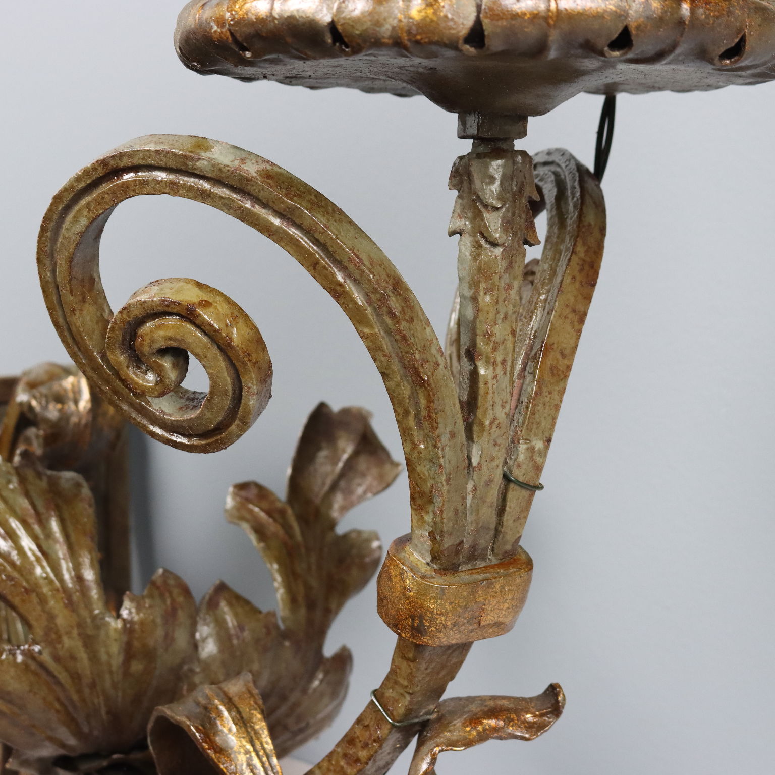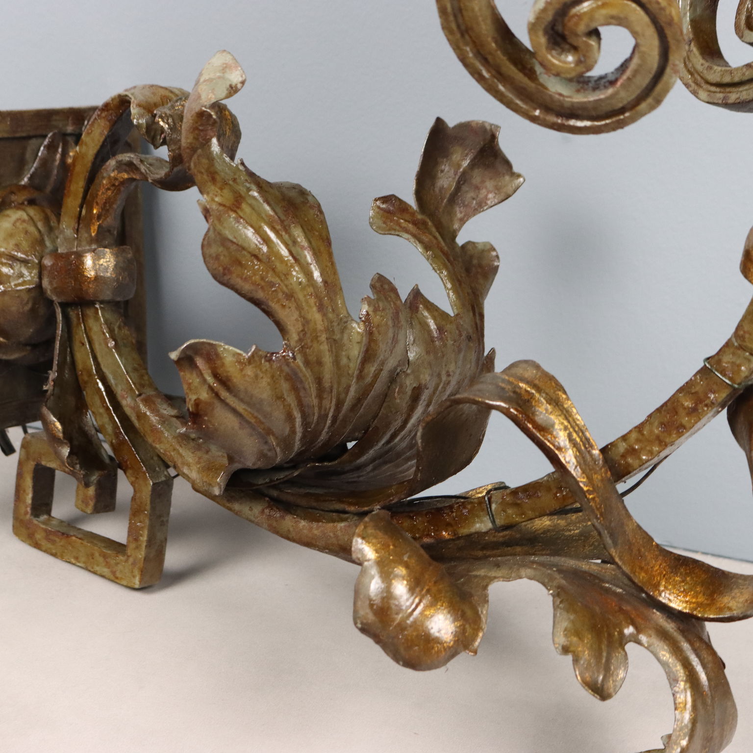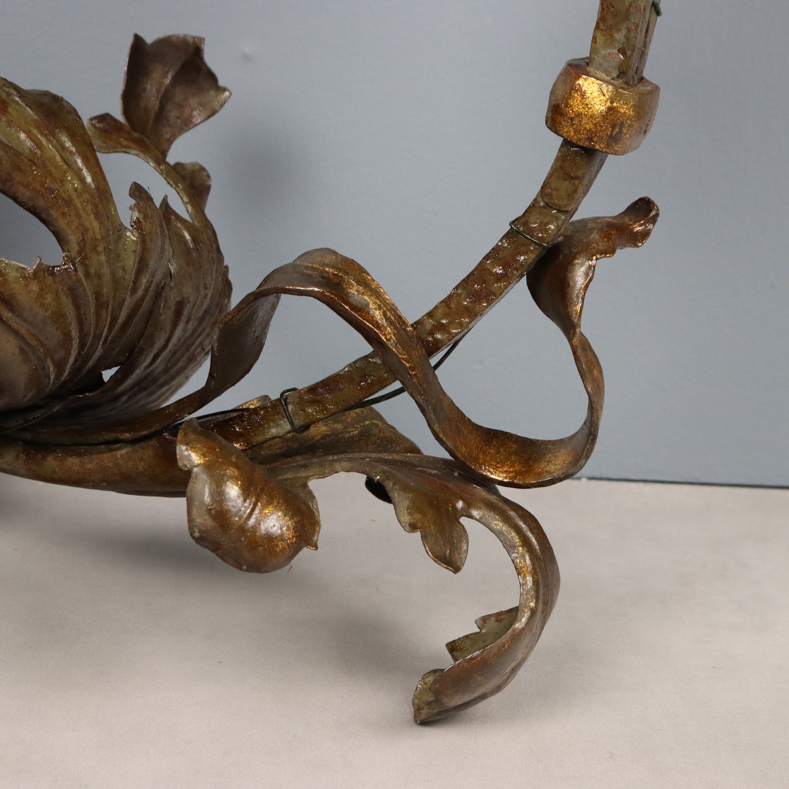 Lanterna in ferro e lamierino verniciati e dorati. Ferro lavorato a volute e riccioli, Lamierino lavorato a sbalzo a foglie ricurve. Vetro mancante. Italia, inizio XX Secolo.