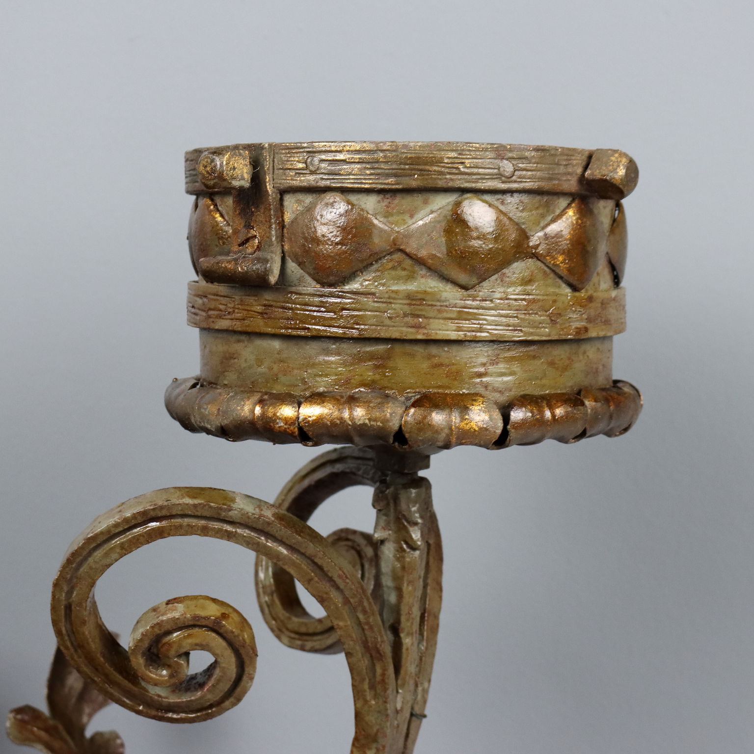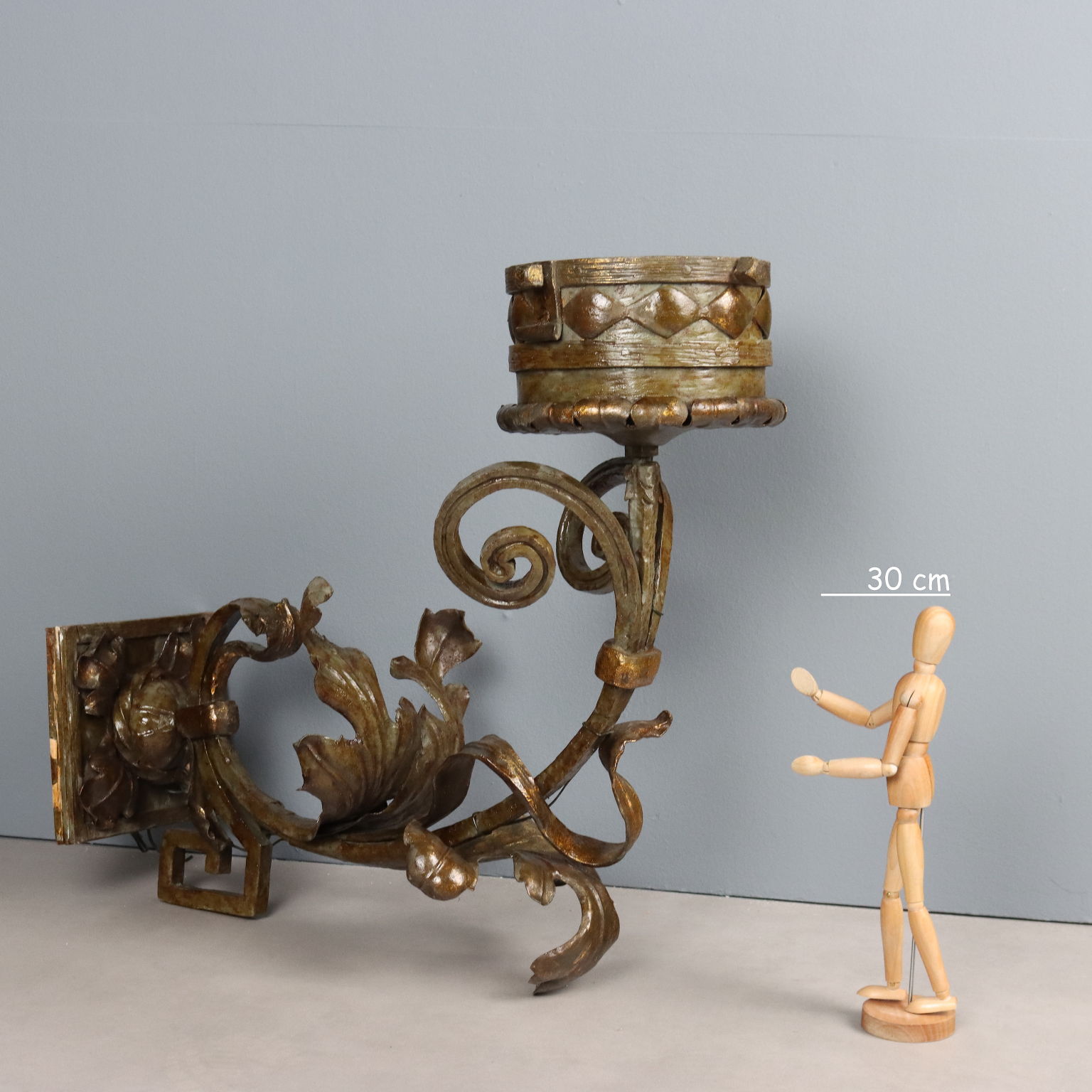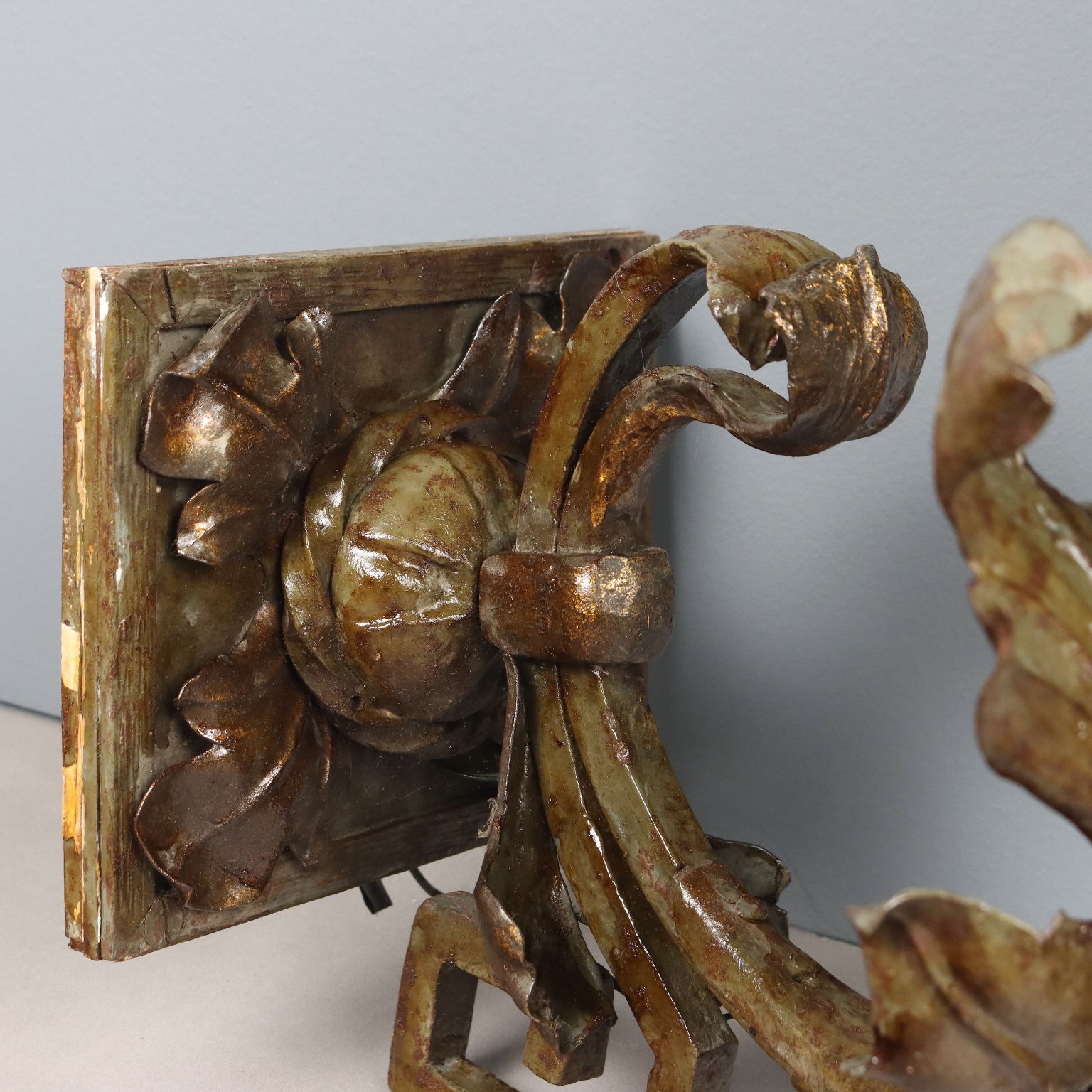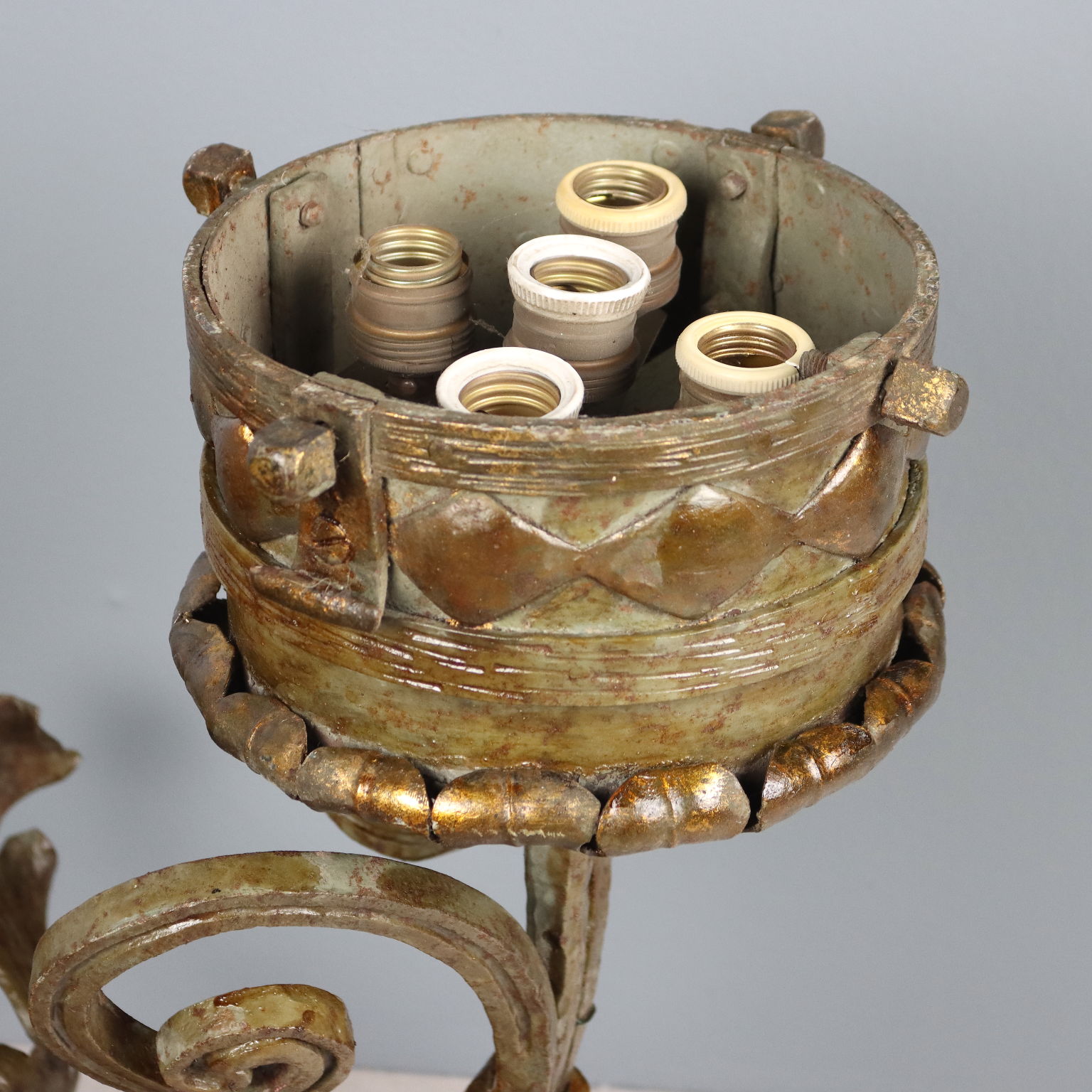Lanterna in ferro e lamierino verniciati e dorati. Ferro lavorato a volute e riccioli, Lamierino lavorato a sbalzo a foglie ricurve. Vetro mancante. Italia, inizio XX Secolo.