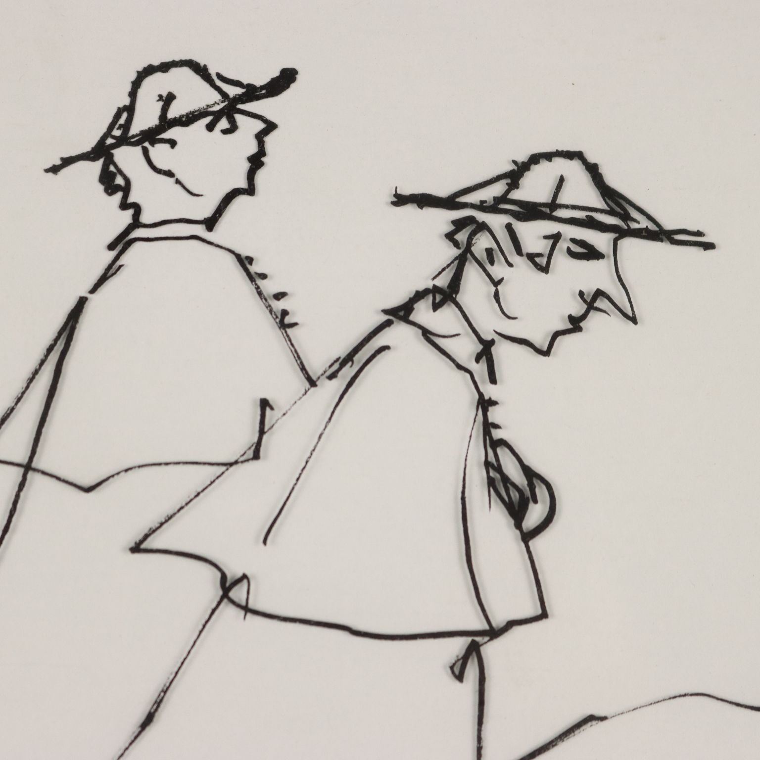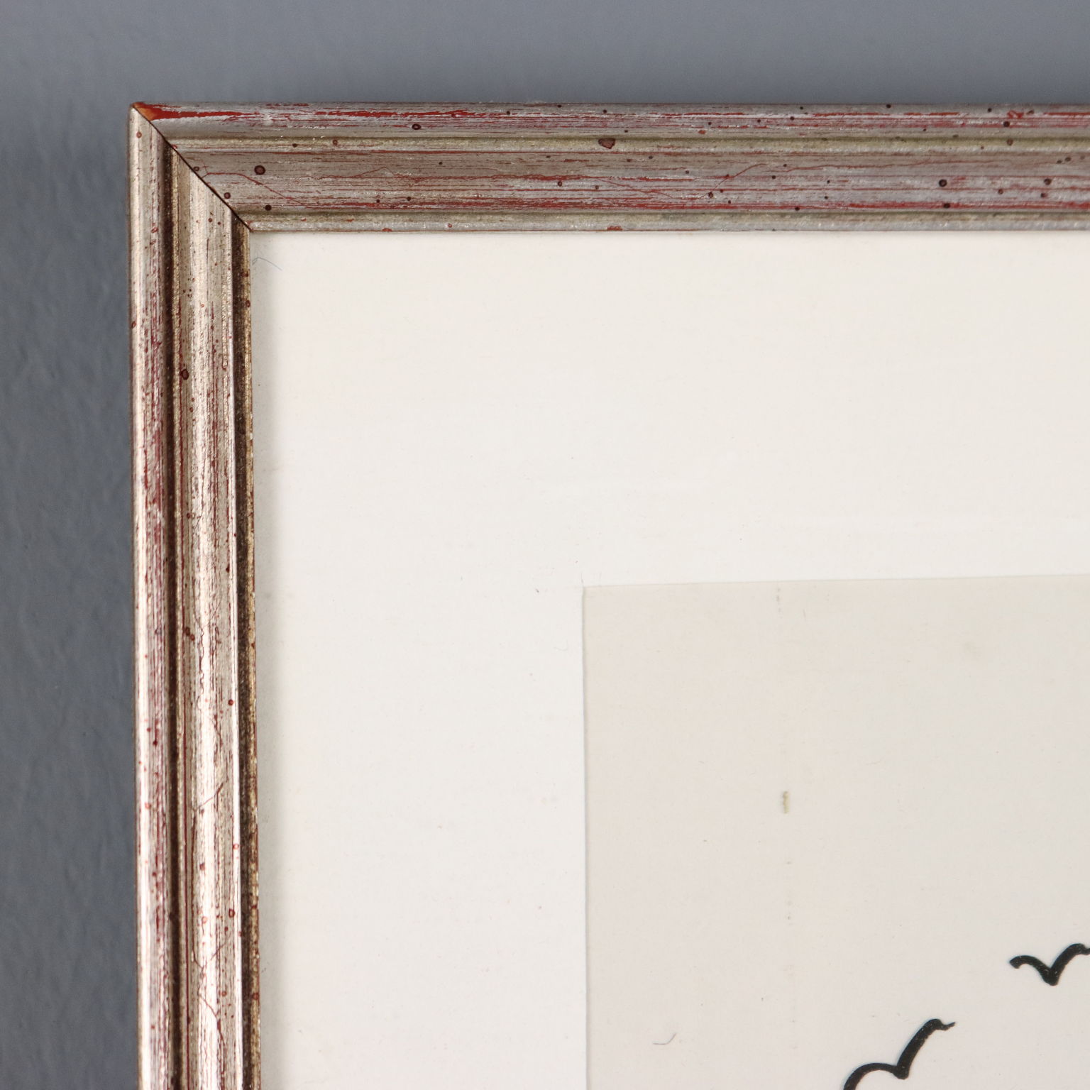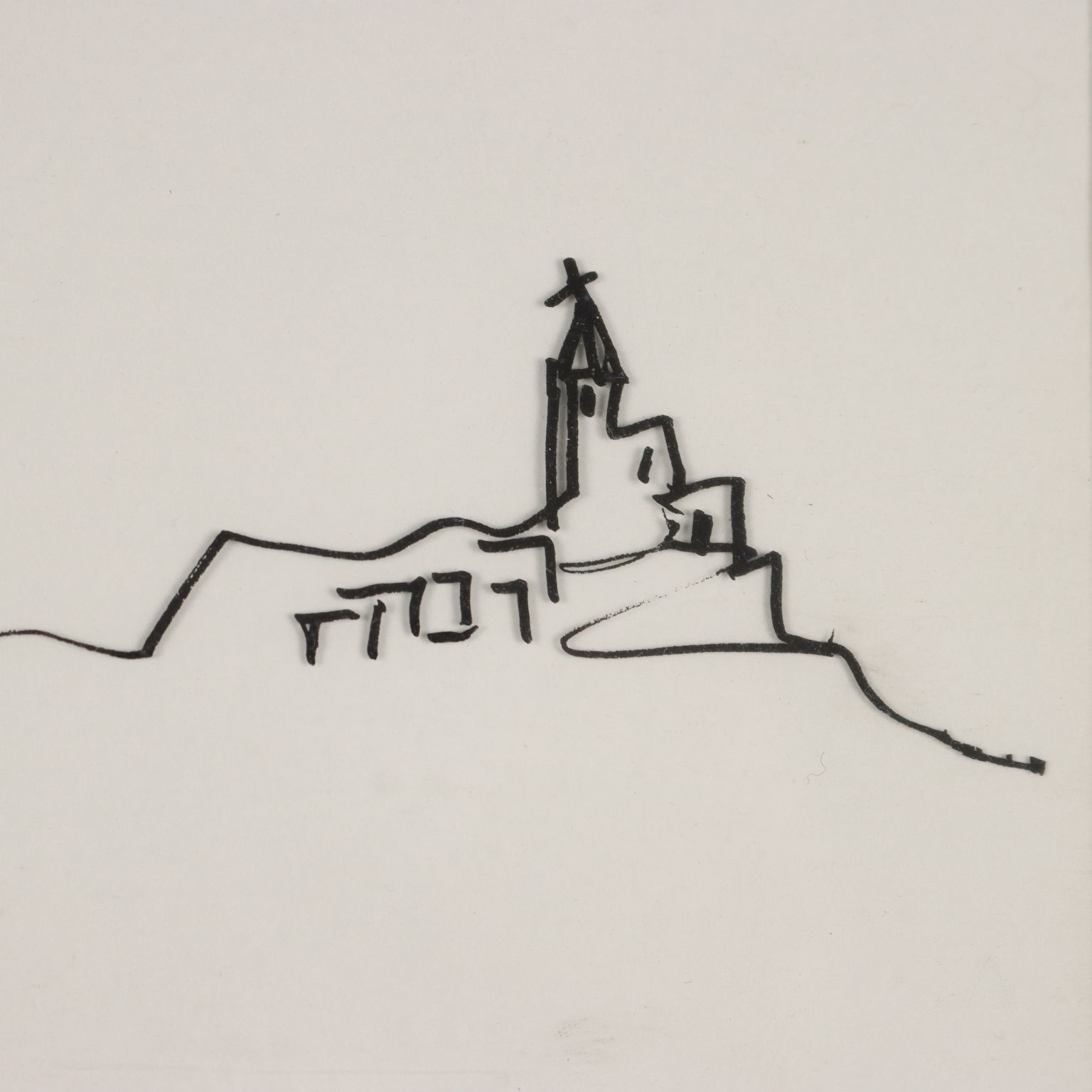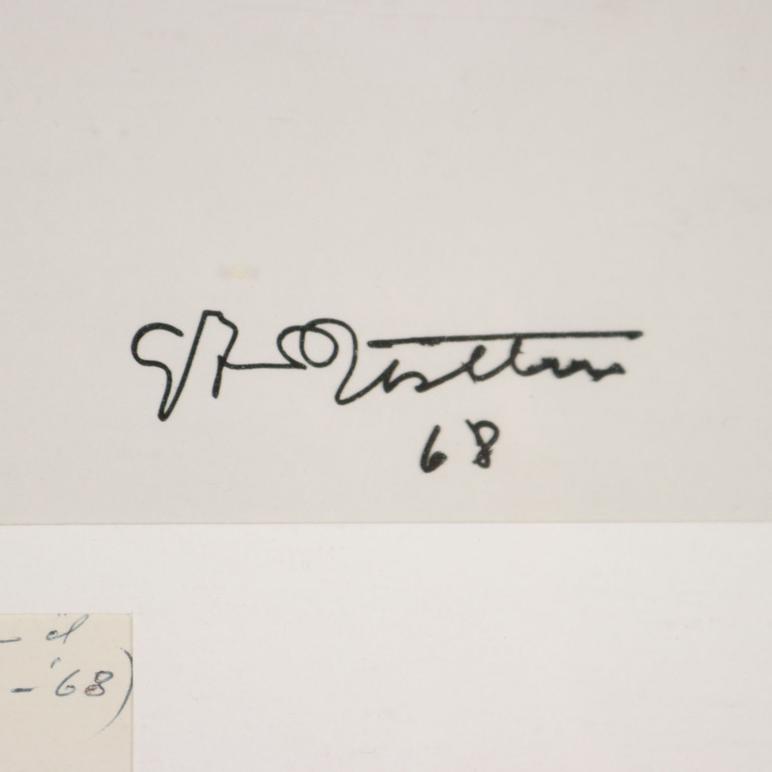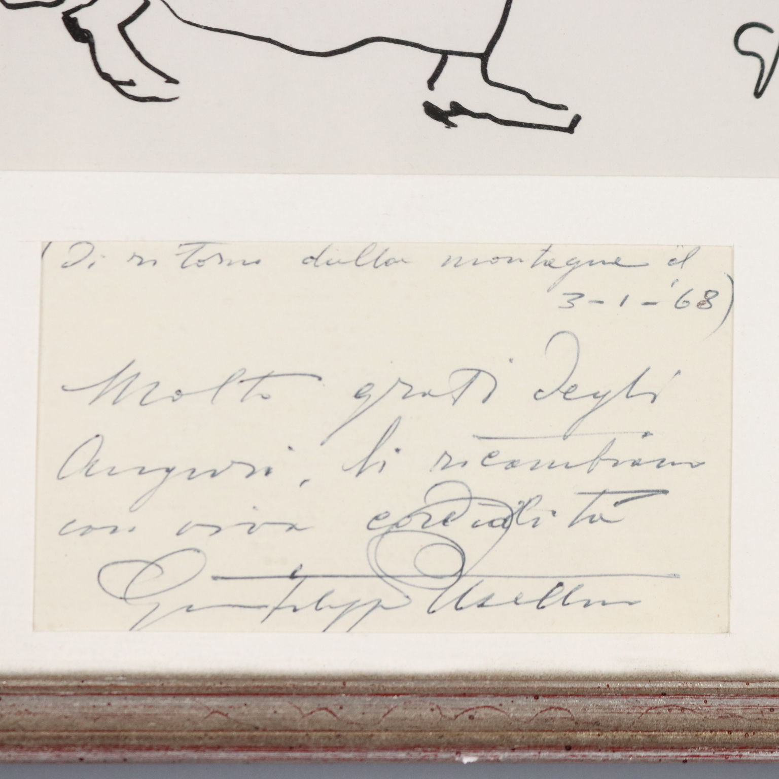 Pennarello su carta. Firmato e datato in basso a destra. Sotto il disegno è aggiunta un biglietto auguri dell'artista, da lui autografato. Chiamato "il pittore dei sogni", Gianfilippo Usellini racconta con la sua arte episodi della vita quotidiana e soprattutto ricordi dell' infanzia, caratterizzati da semplicità cromatica e formale, ma resi con un linguaggio ironico, sospeso, che pur guardando all'arte del Quattrocento, si traduce in atmosfere magiche, sospese, surreali, fiabesche. I suoi temi preferiti sono sempre stati “biblioteche, portici, cortili, suore, preti, bambini, cardinali, giudici, sirene, cani, gatti, innamorati”…tutto e tutti, diceva lui stesso, perché “sono l'immagine dell'uomo d'oggi”. In cornice.