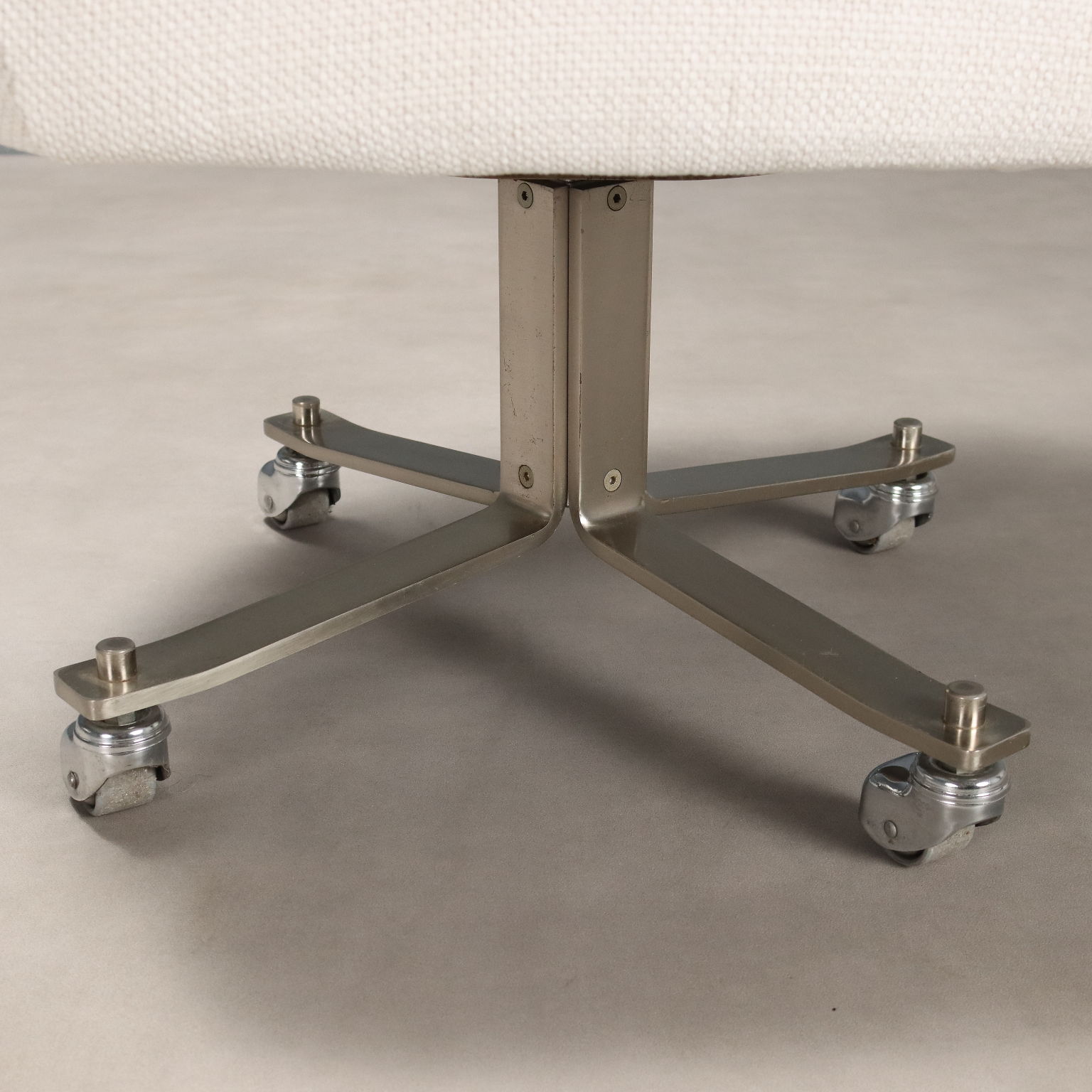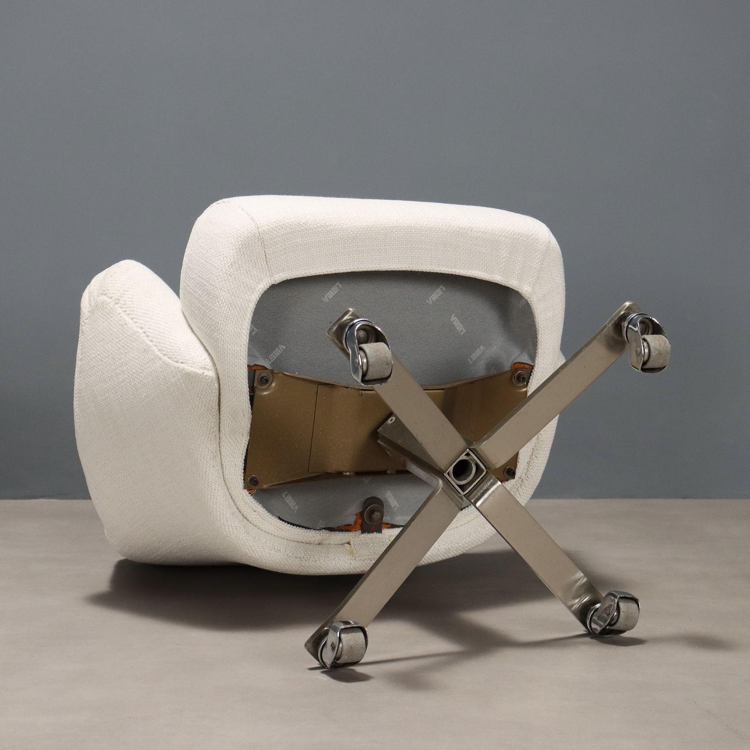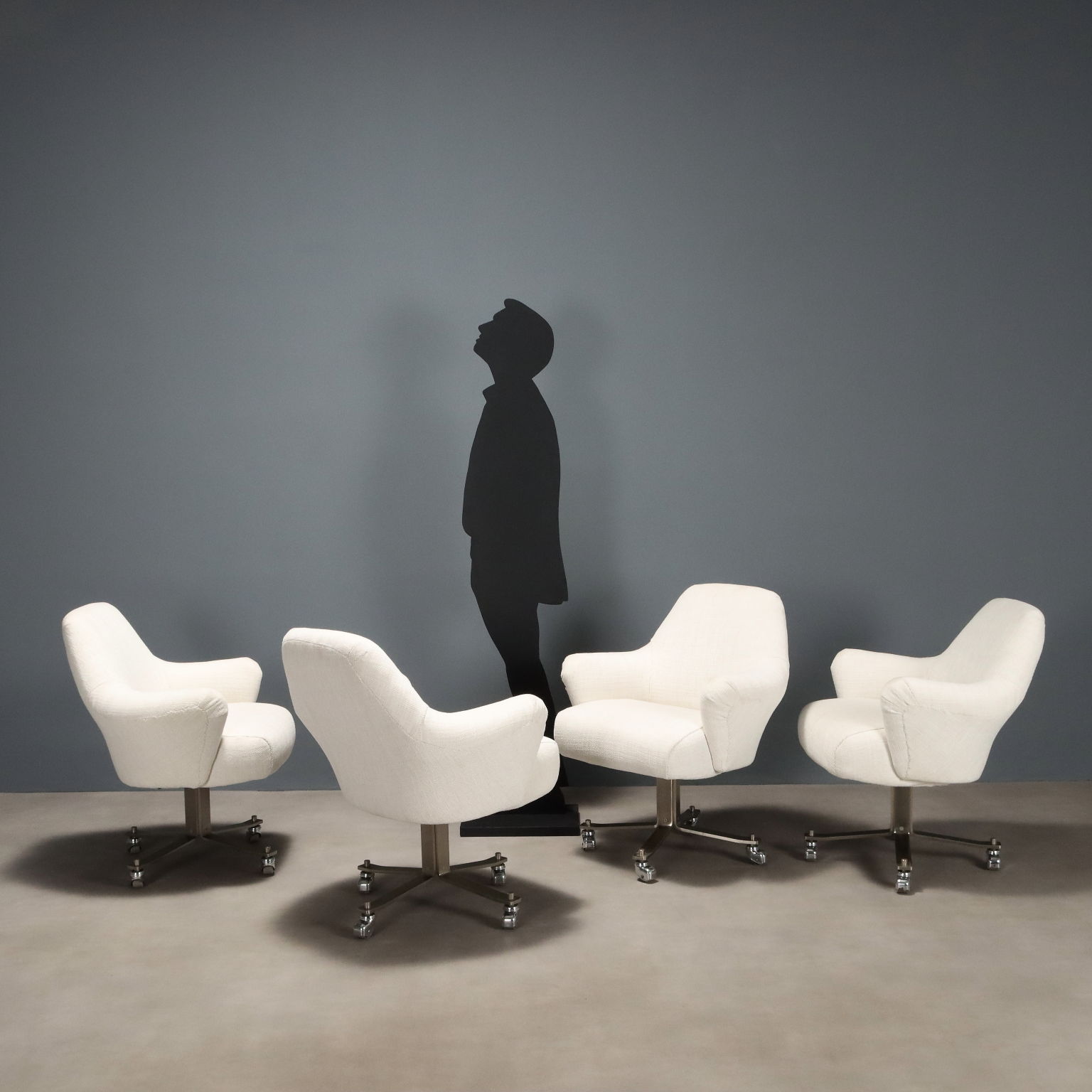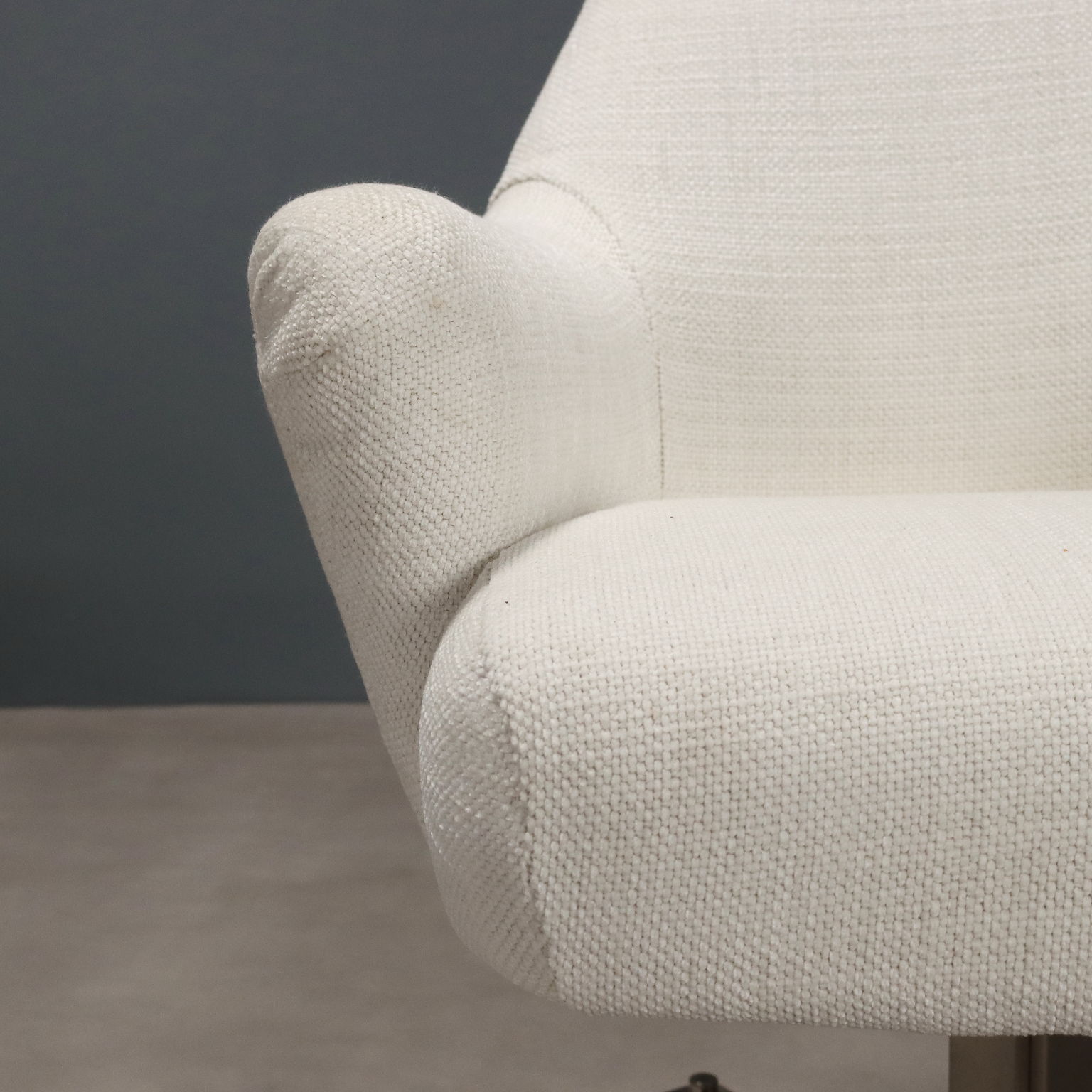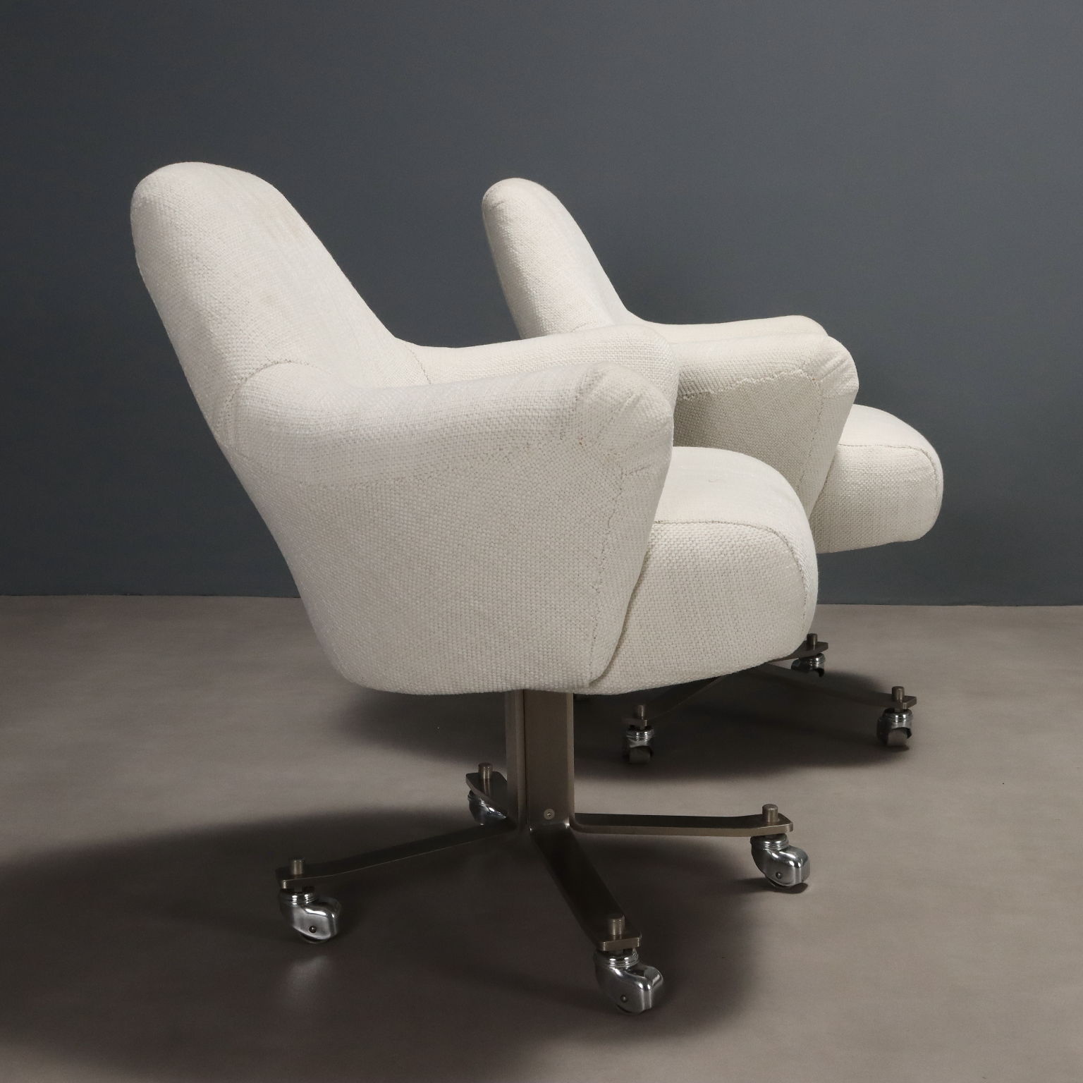 Set di poltrone con base a quattro razze in metallo con rotelle, imbottitura in espanso e rivestimento in tessuto bianco. Sedute che si prestano ad essere rinnovate nella tappezzeria scegliendo tra i numerosi tessuti disponibili nei nostri laboratori.