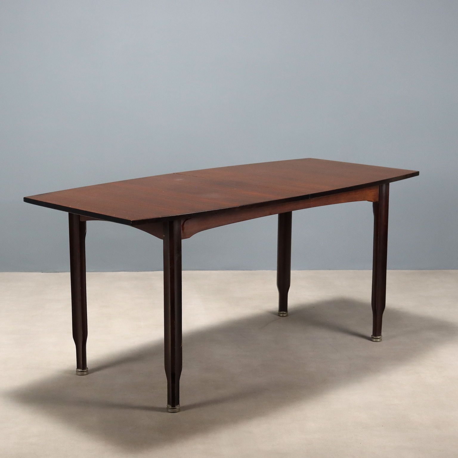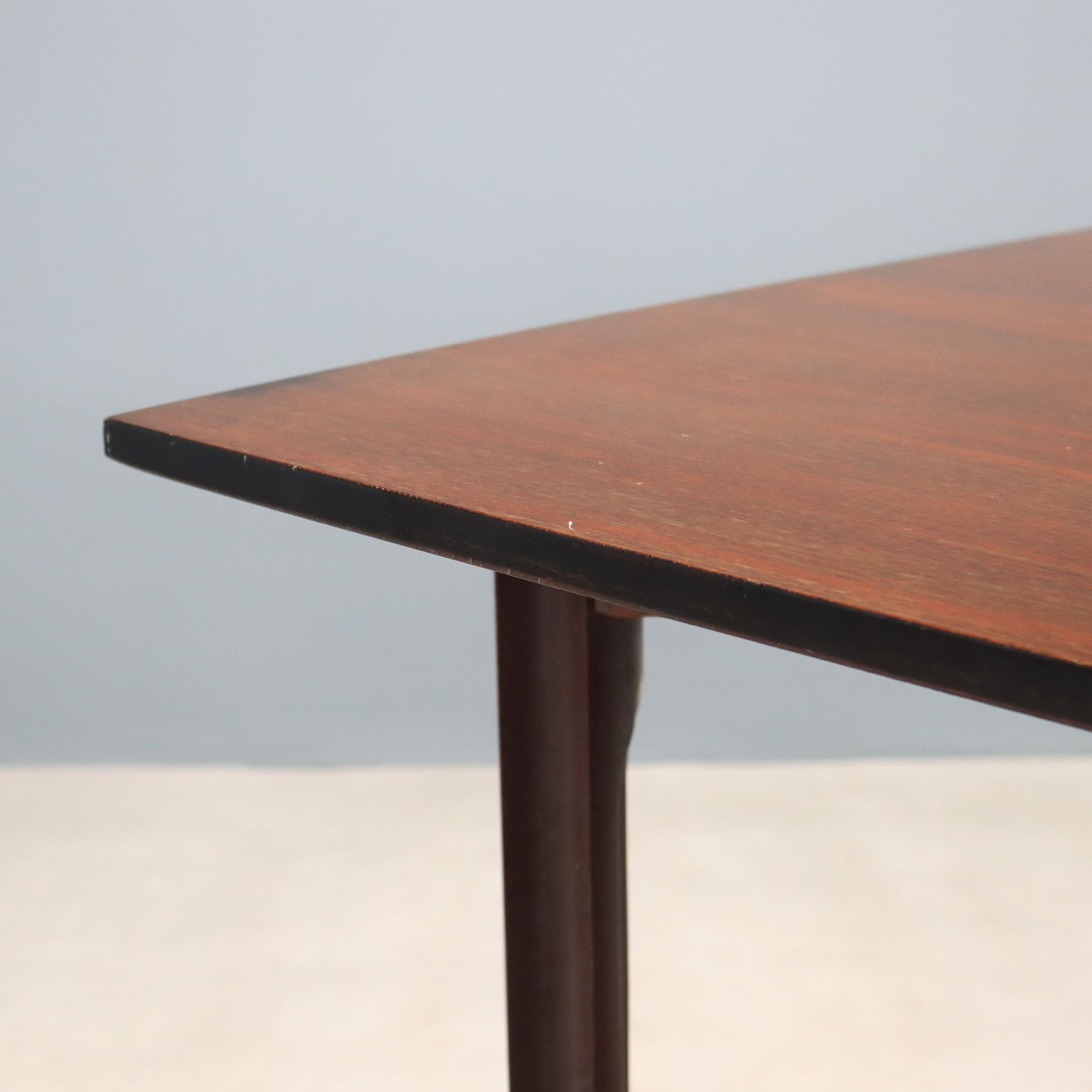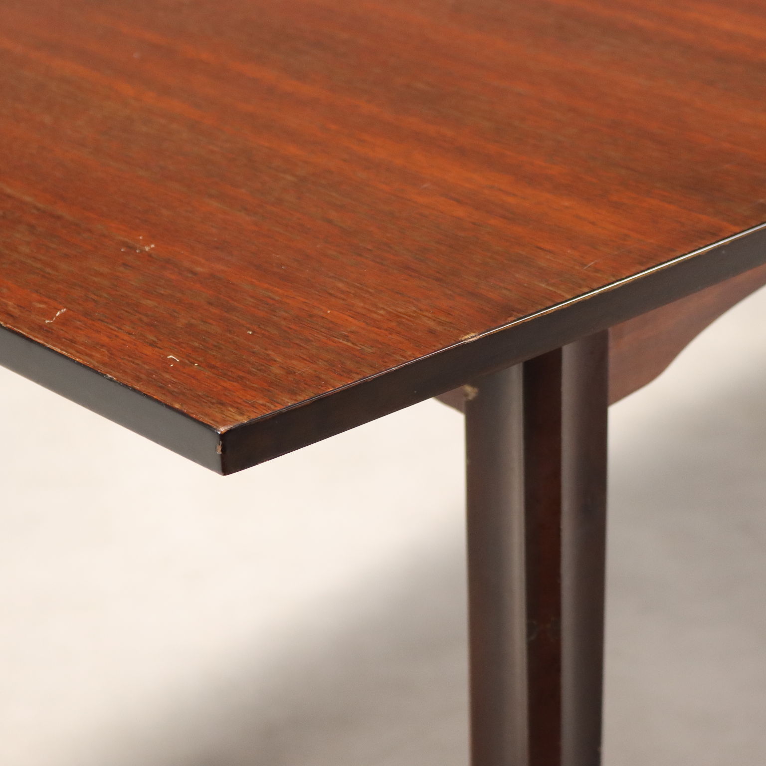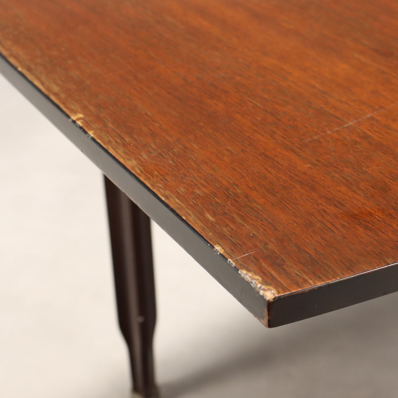 Tavolo da pranzo vintage con piano rettangolare e gambe con impiallacciatura in legno esotico, terminali in legno.
