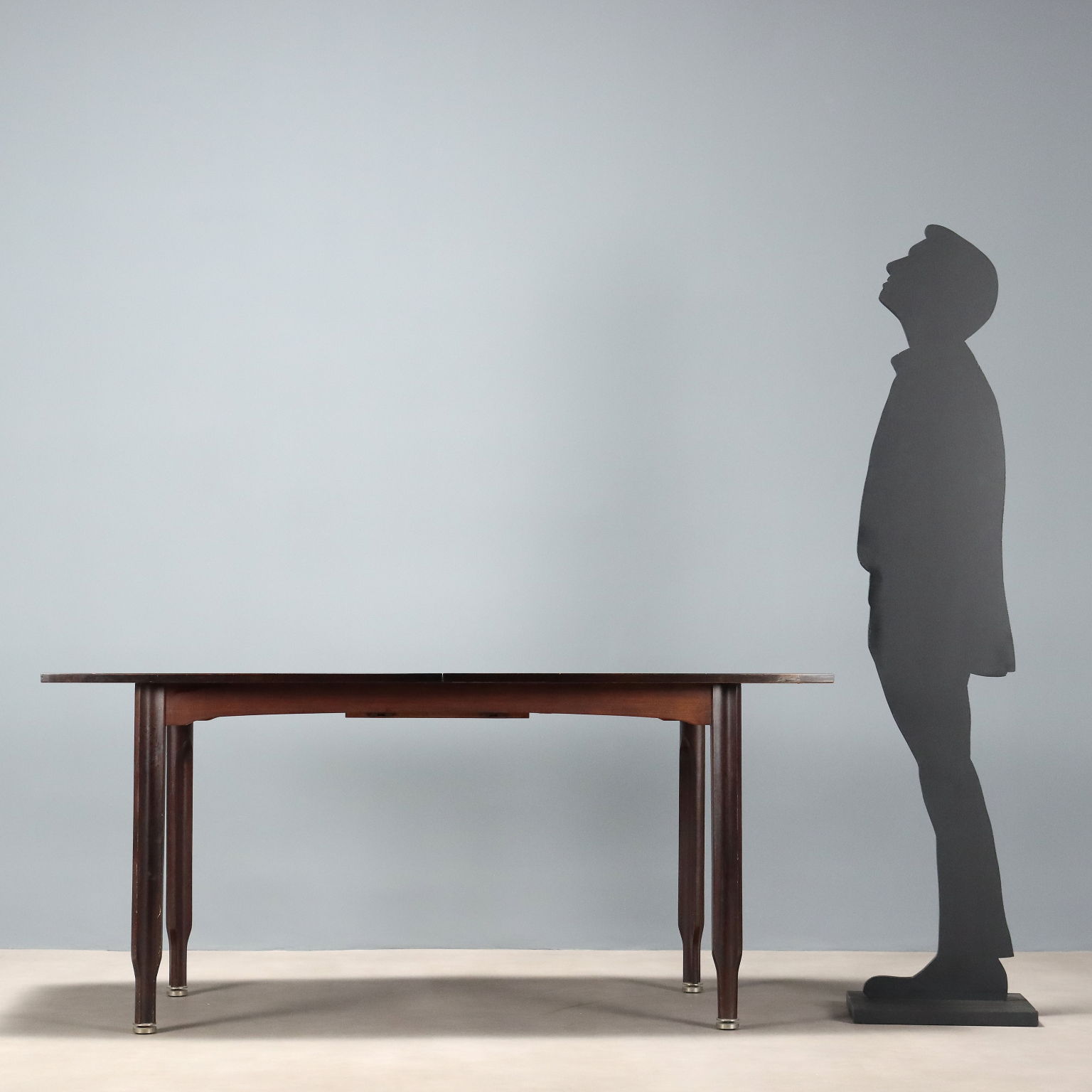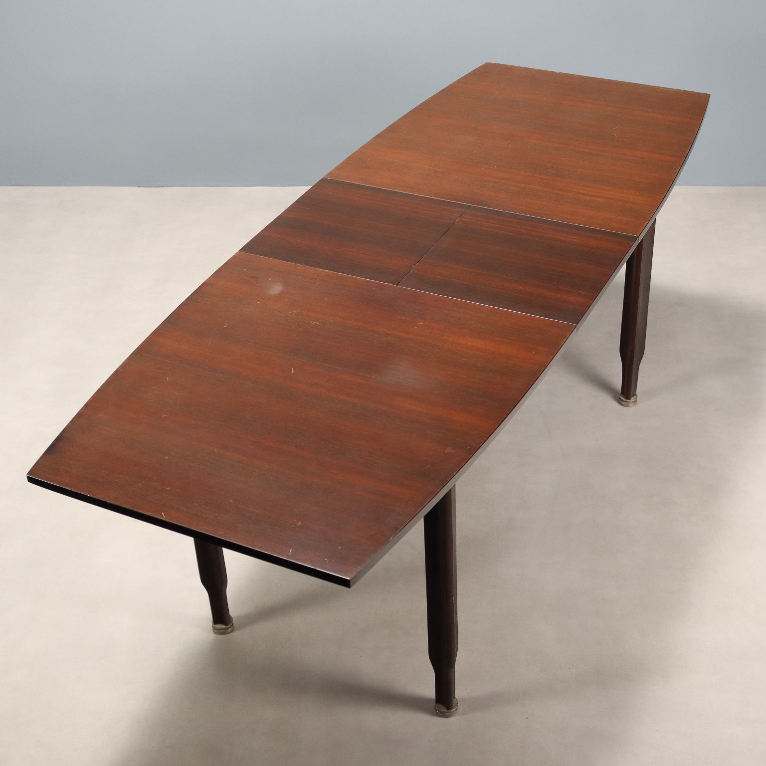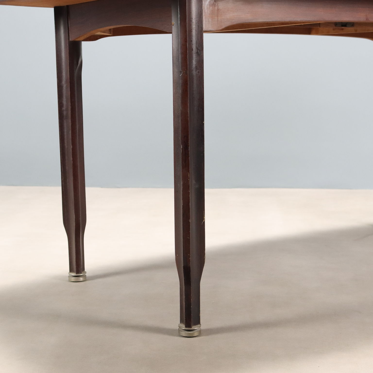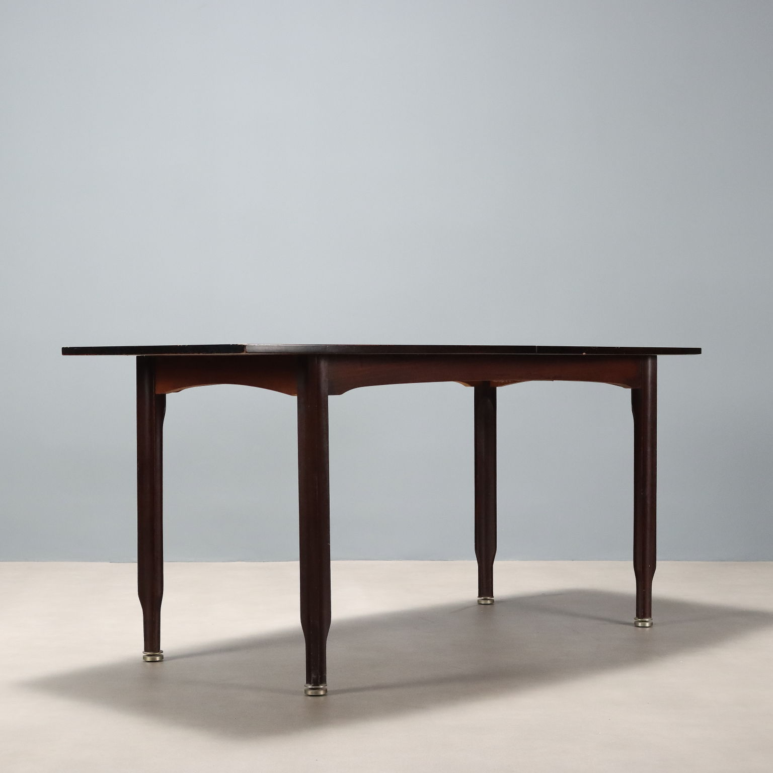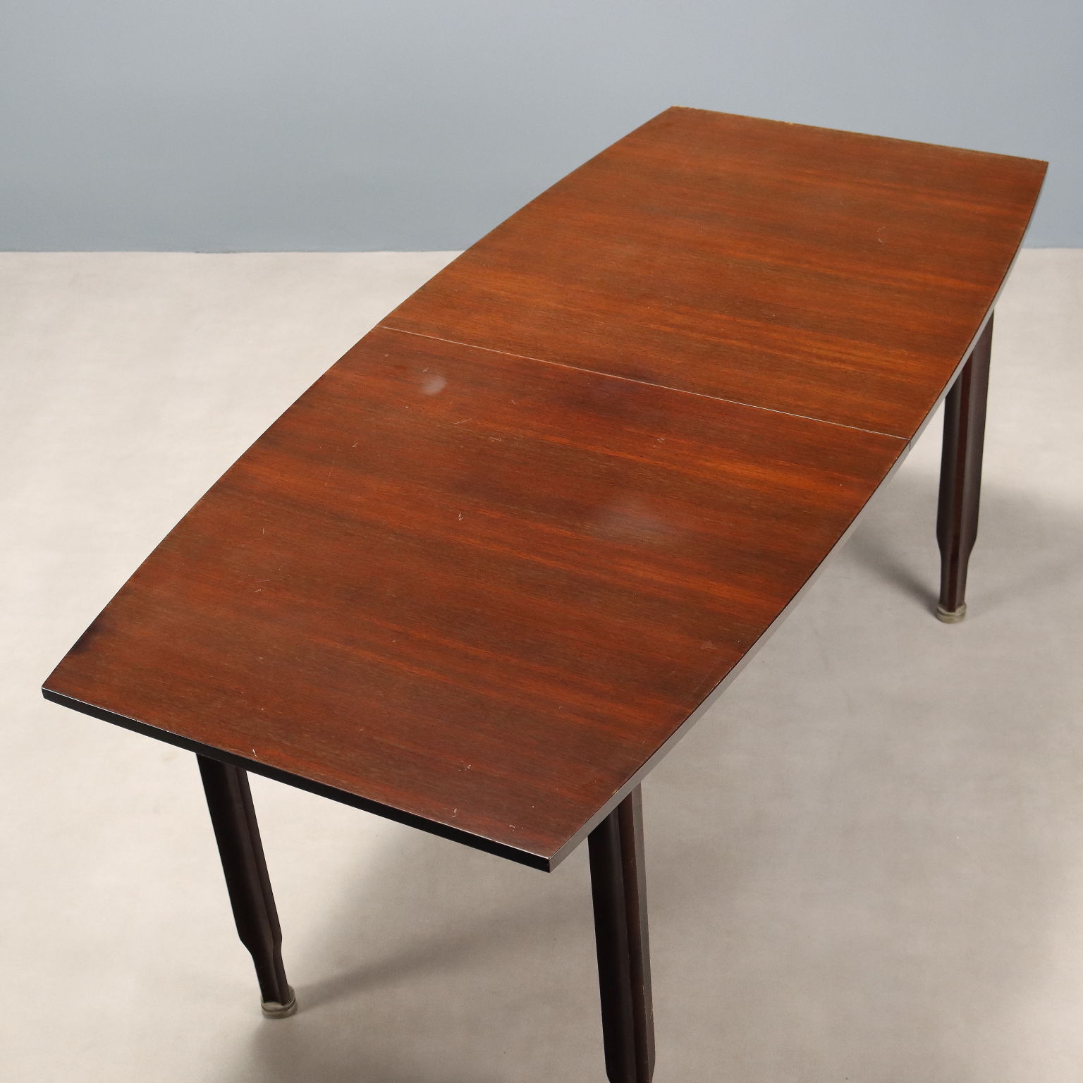 Tavolo da pranzo vintage con piano rettangolare e gambe con impiallacciatura in legno esotico, terminali in legno.