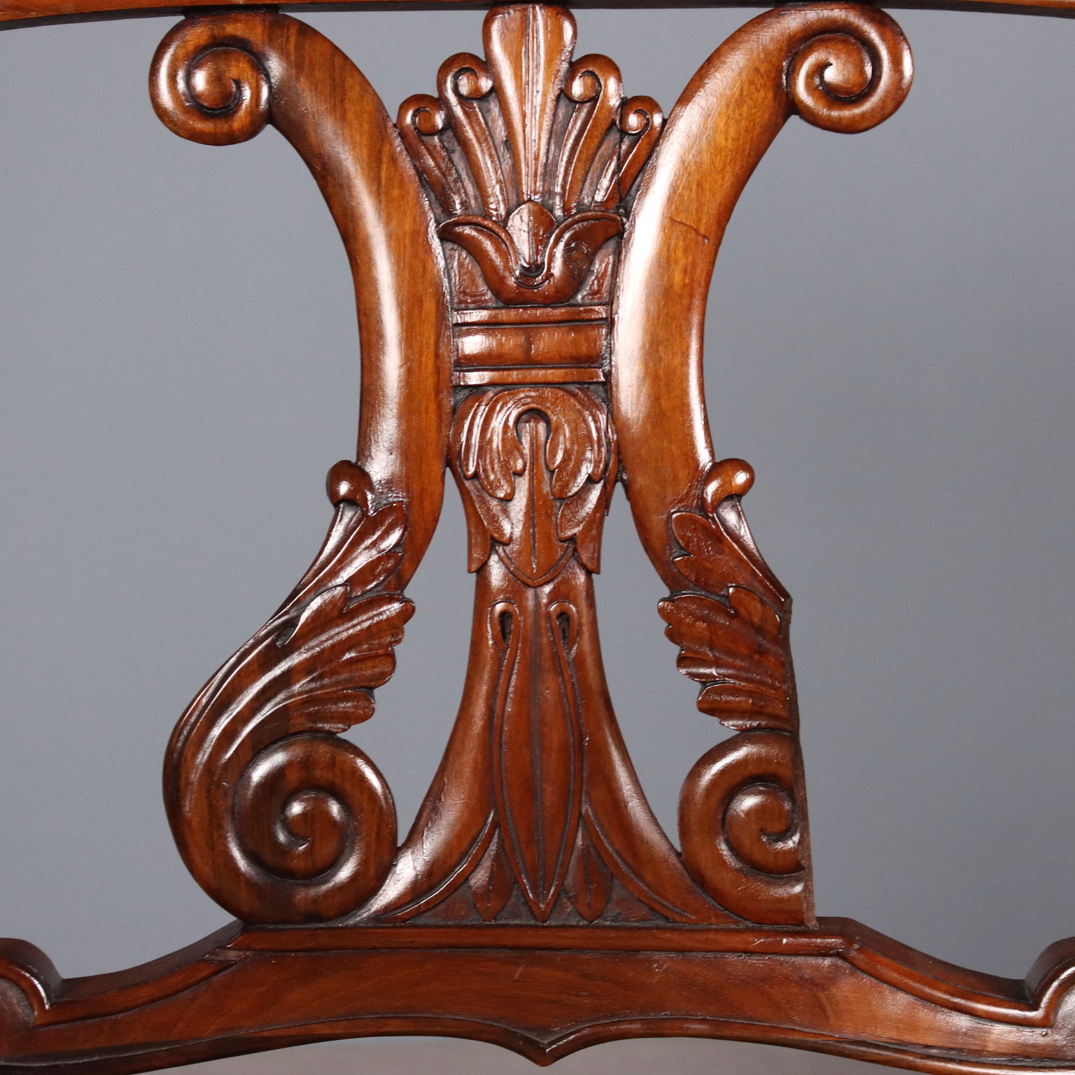 Coppia di poltrone Luigi Filippo in mogano. Schienale a giorno con cartella centrale intagliata a soggetti fogliacei e volute, braccioli intagliati, mossi, culminanti a ricciolo. Gambe anteriori tornite e posteriori a sciabola. Mancanza in una delle due cartelle, seduta imbottita rimovibile. Francia, secondo quarto XIX Secolo.