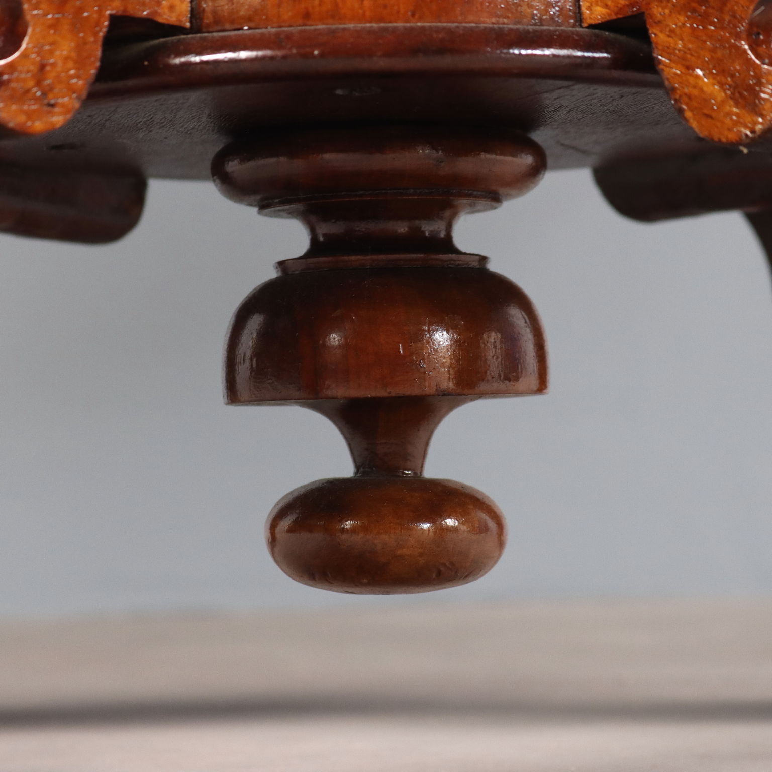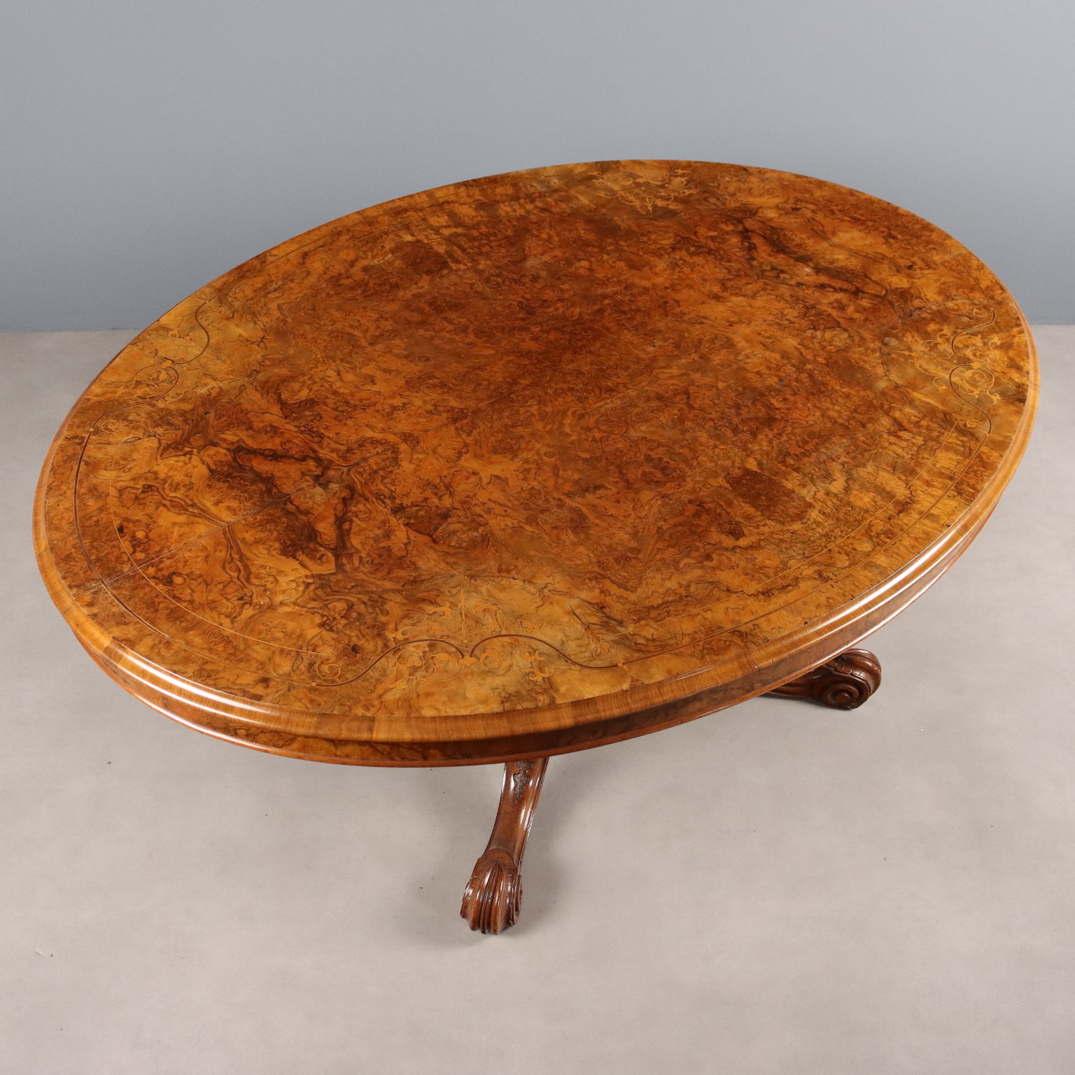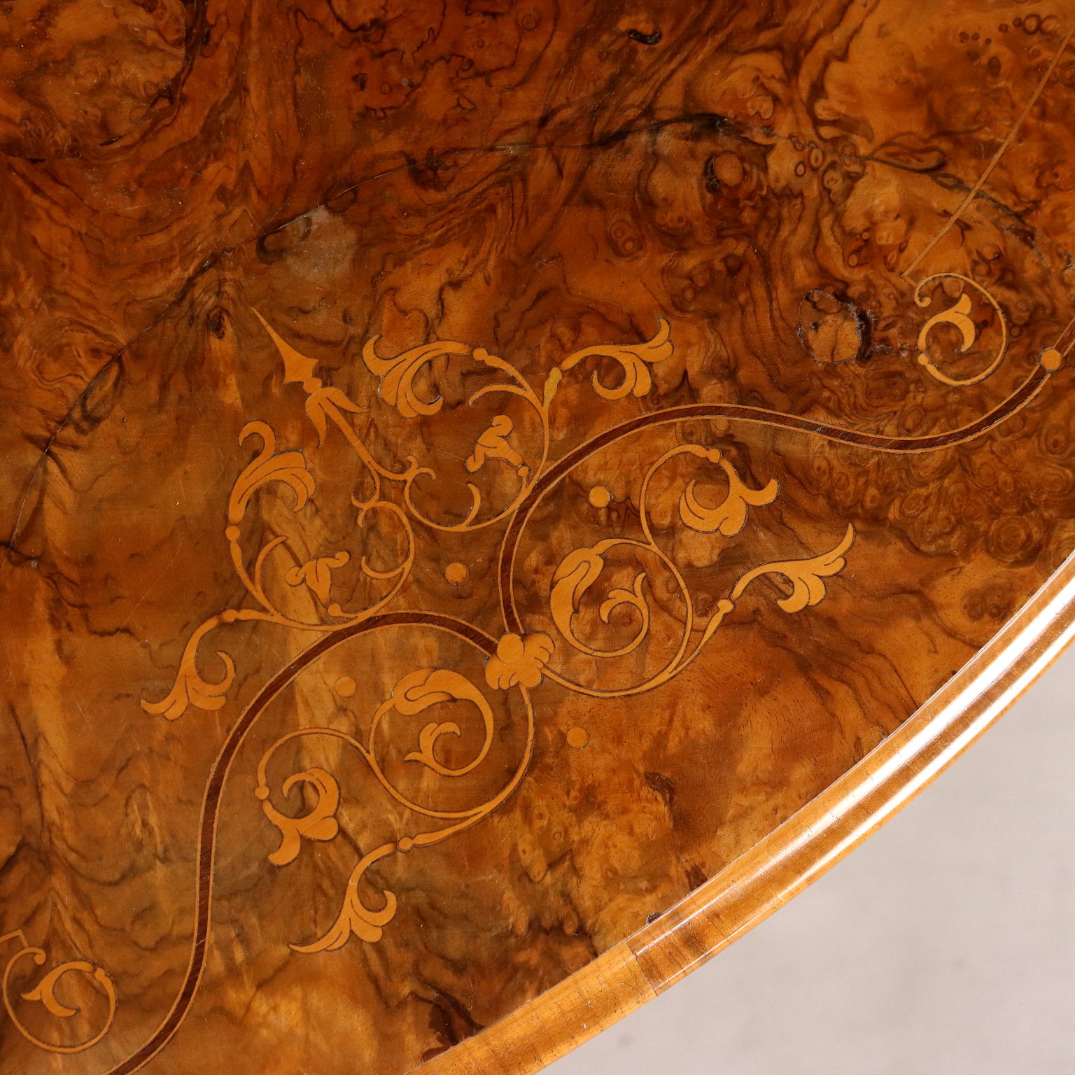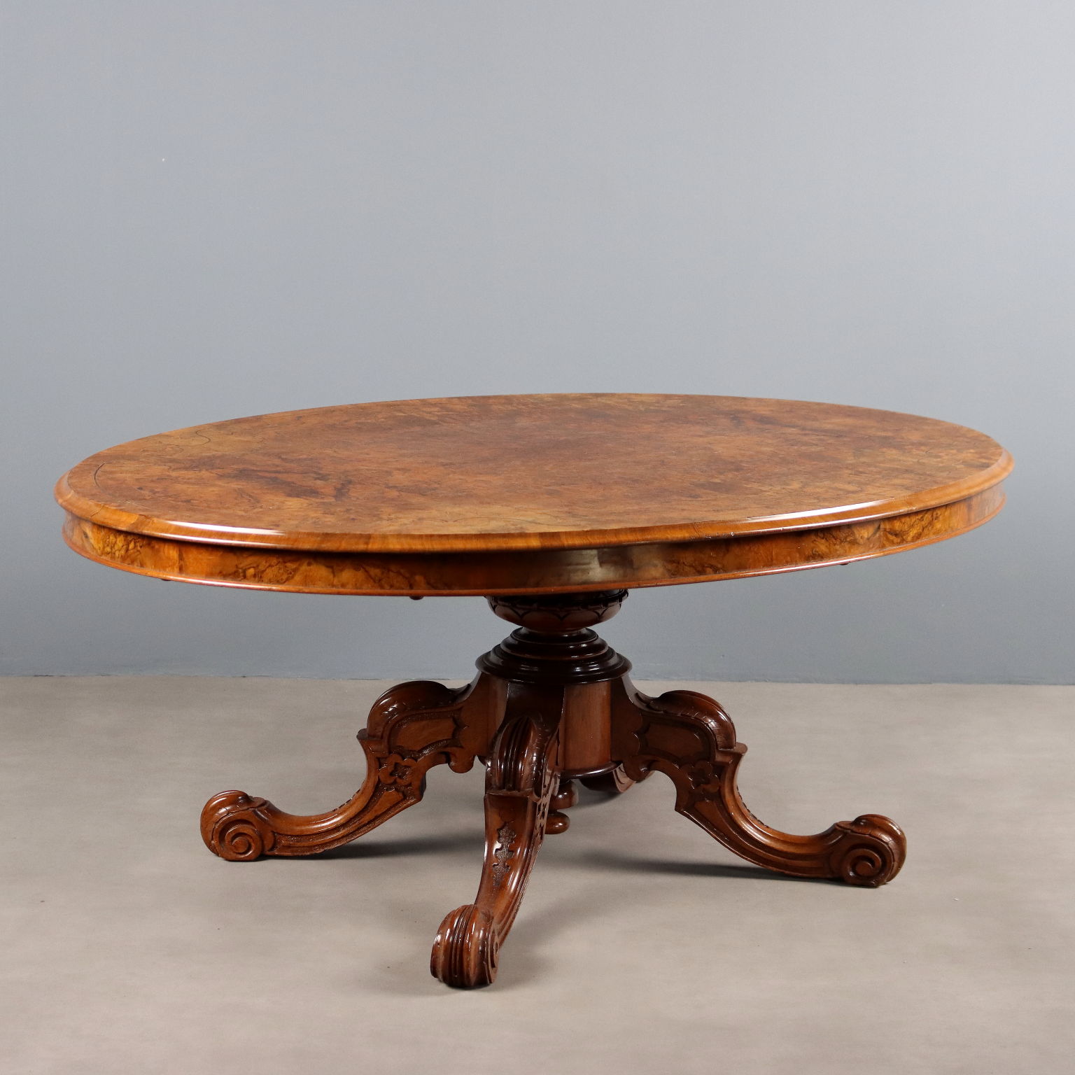Tavolino da centro in noce e radica di noce. Piano ellittico con filettature e intarsi in acero e noce. Gamba centrale tornita poggiante su quattro piedi mossi e intagliati. Italia, fine XIX Secolo.
