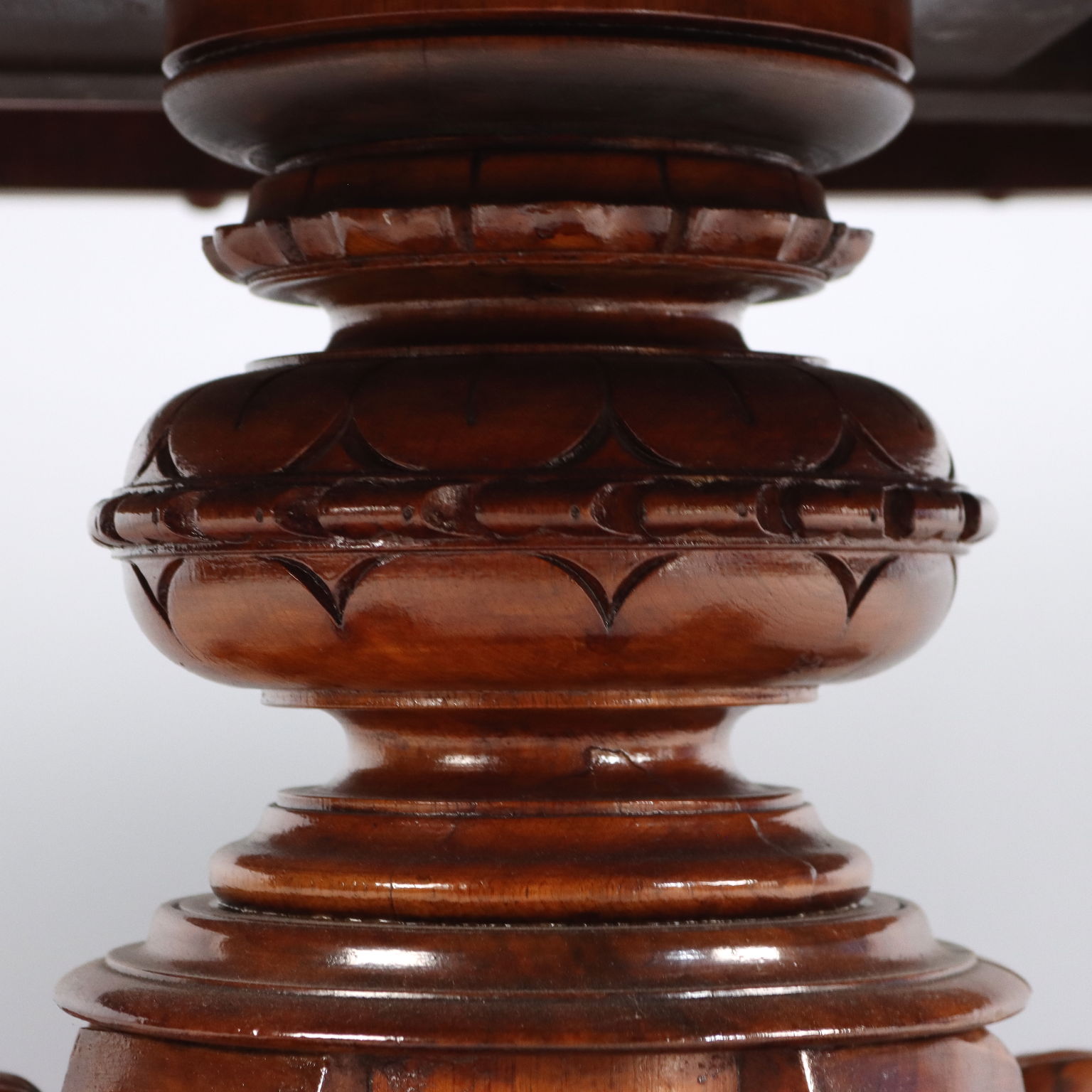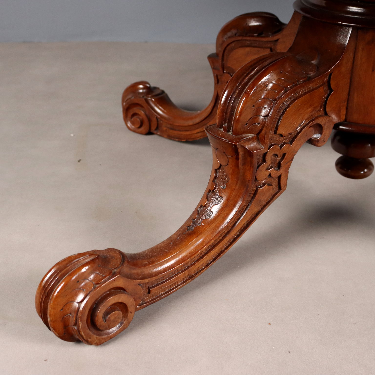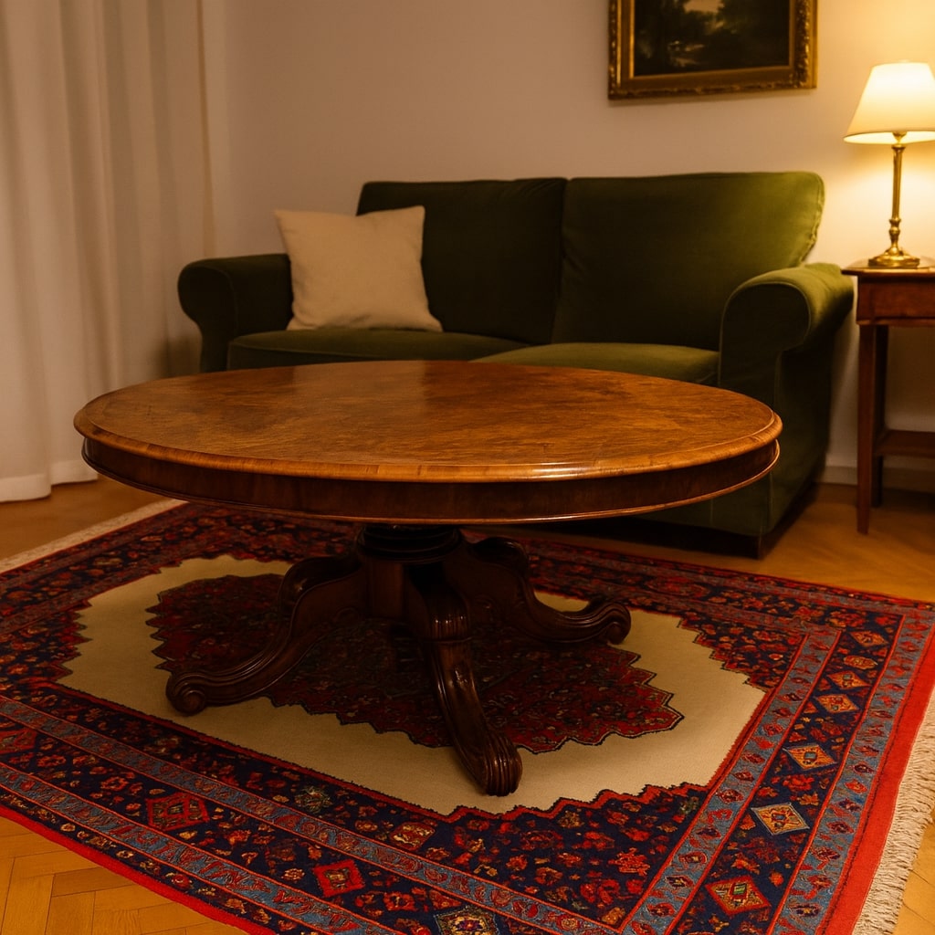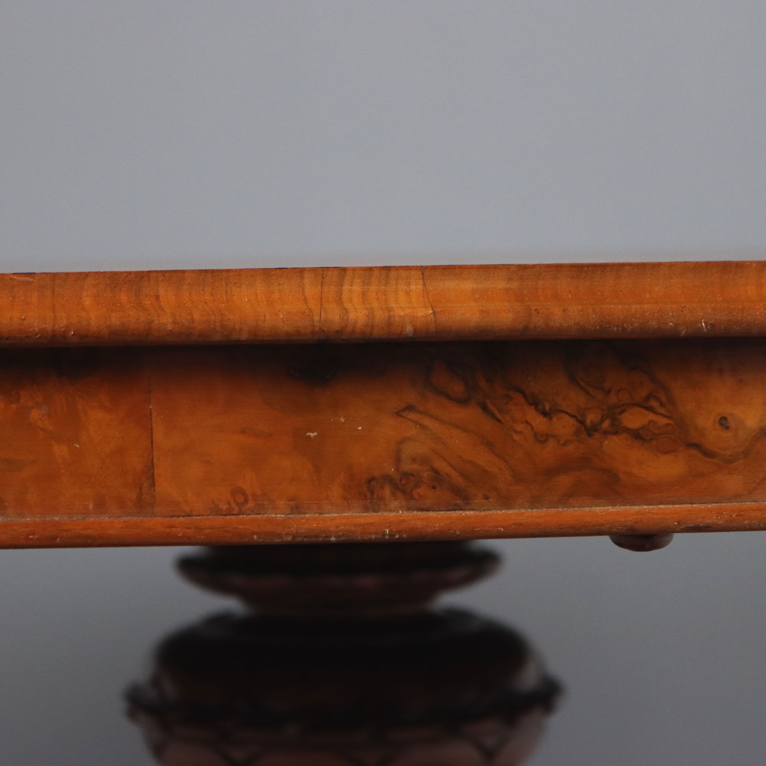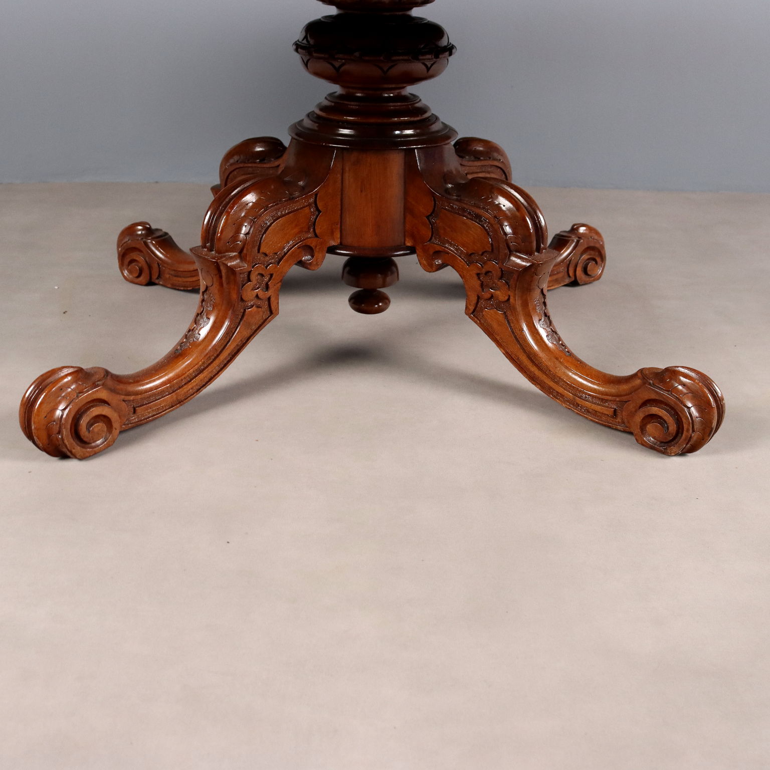 Tavolino da centro in noce e radica di noce. Piano ellittico con filettature e intarsi in acero e noce. Gamba centrale tornita poggiante su quattro piedi mossi e intagliati. Italia, fine XIX Secolo.