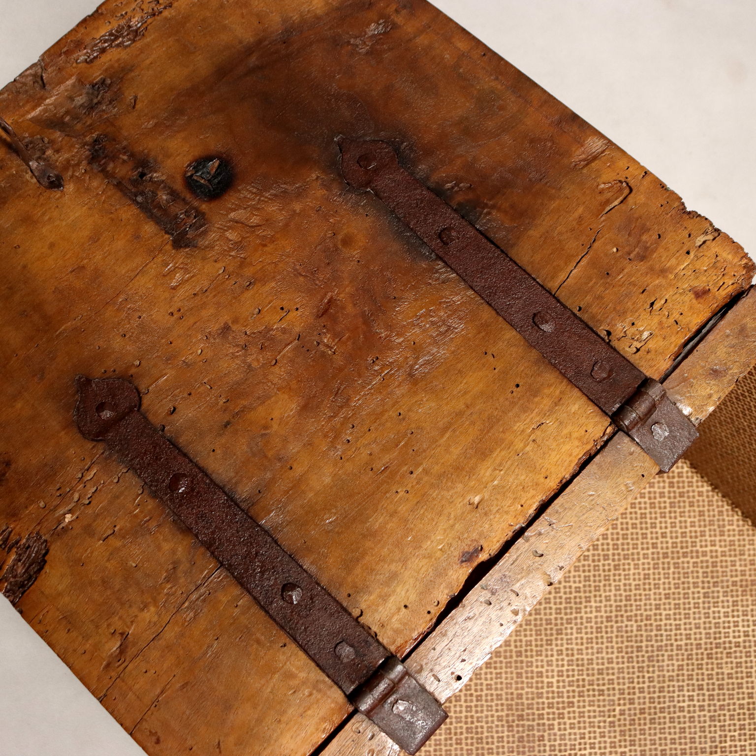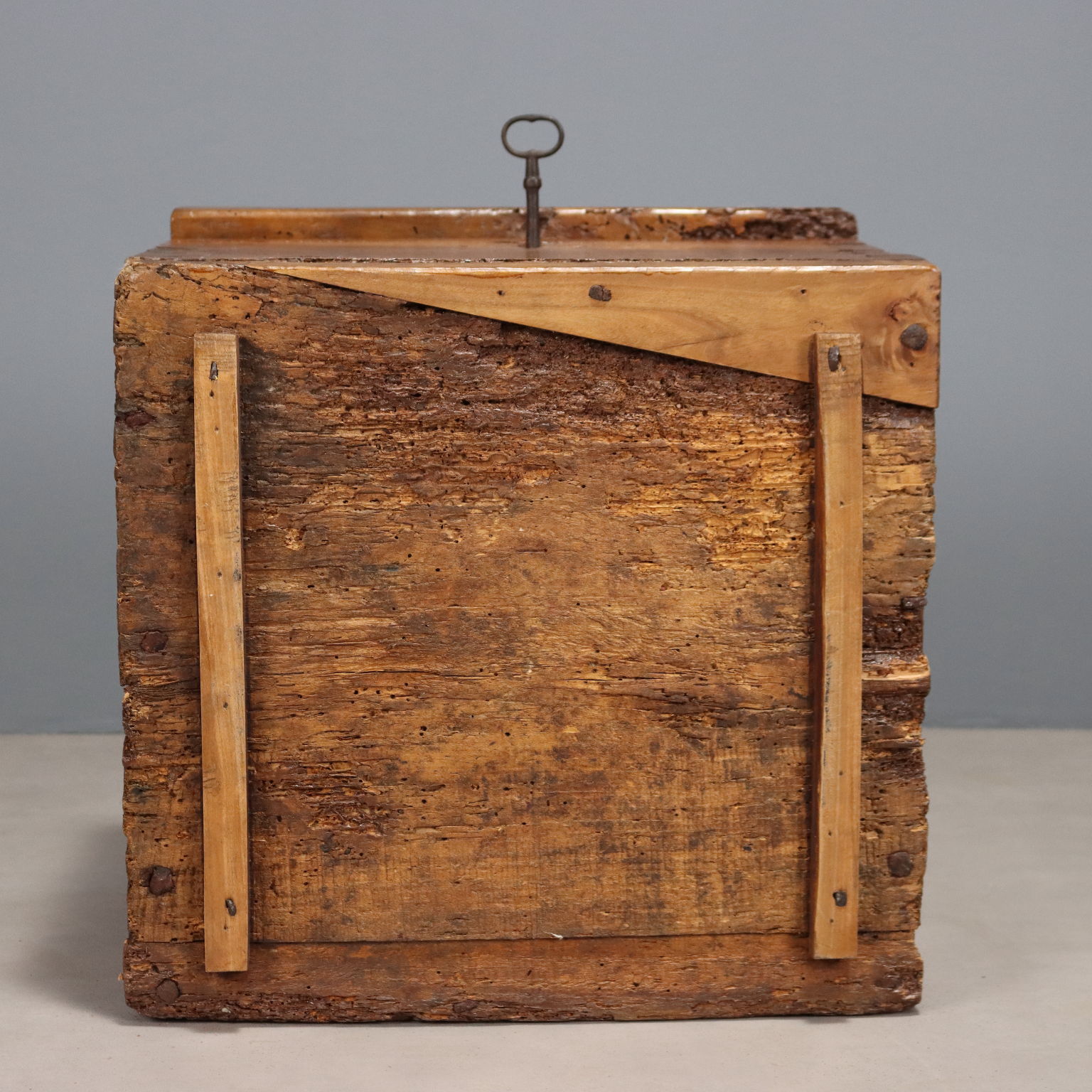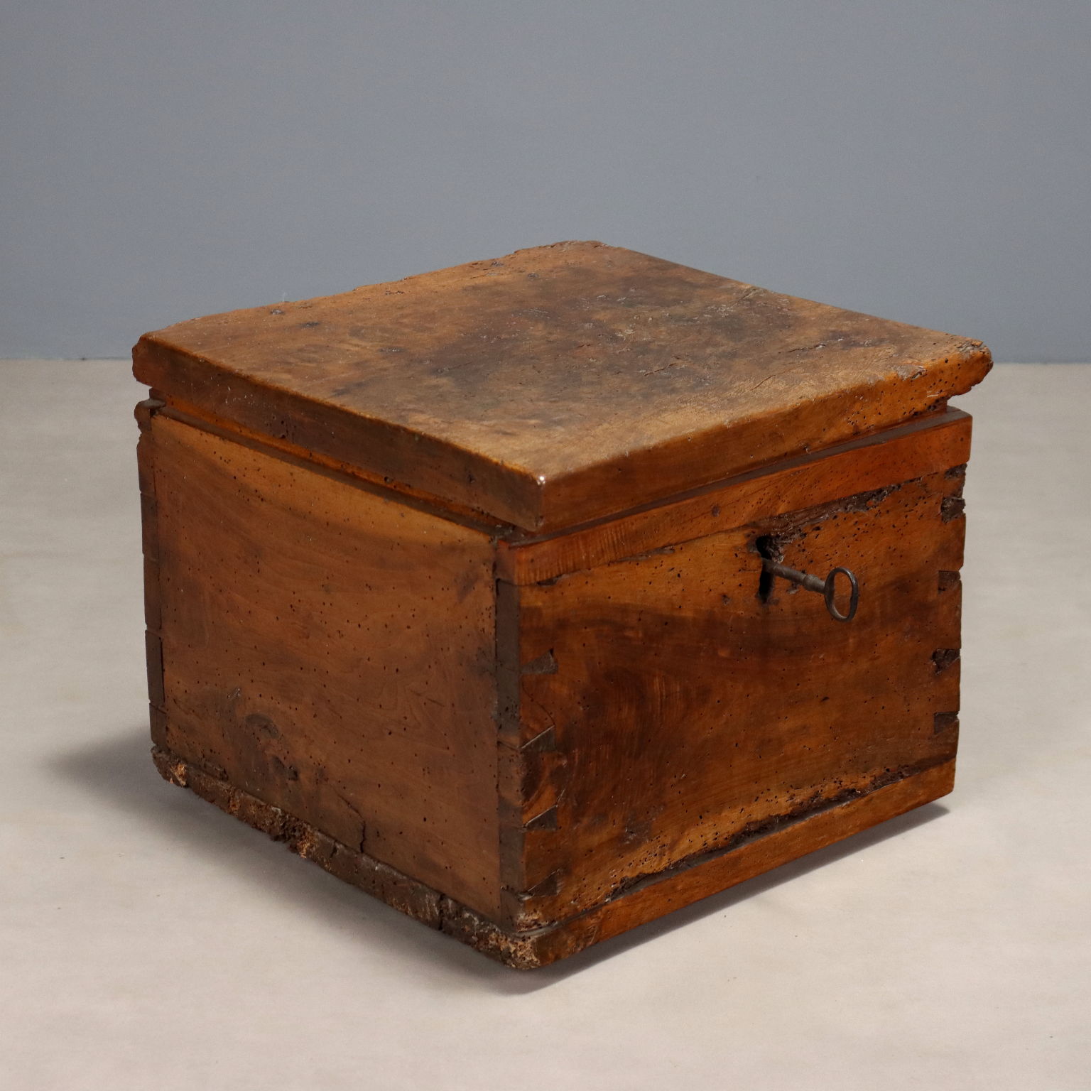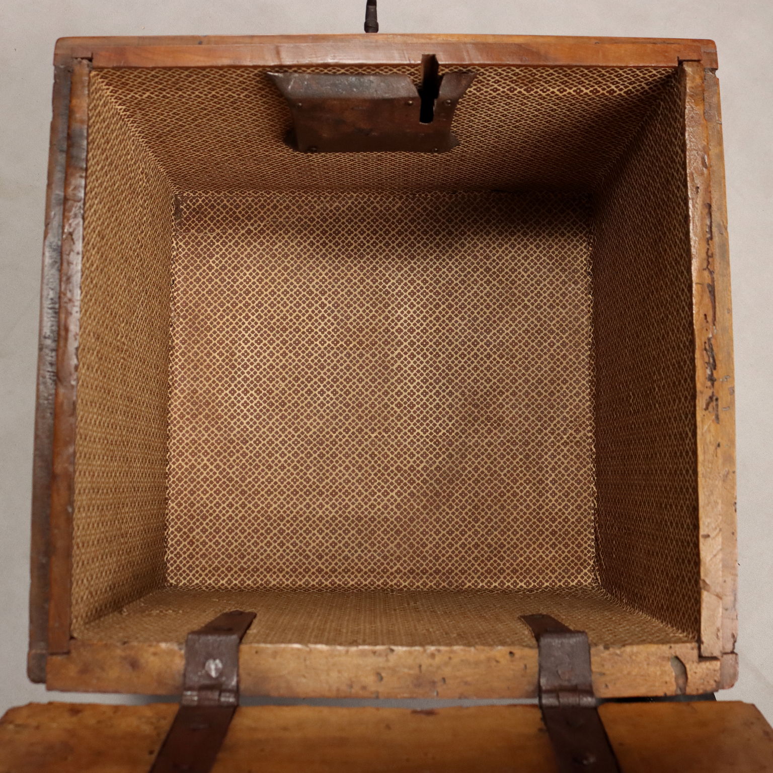 Baule in noce in legni antichi, ricavato da cassapanca settecentesca. Serratura e cerniere coeve. Italia, XX Secolo.