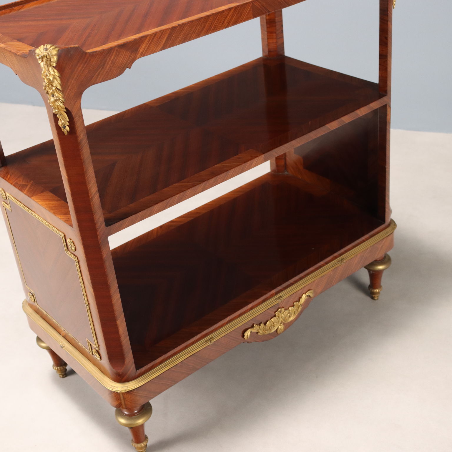 Etagere Vittoriano lastronato in bois de violette e mogano, riccamente adornato da applicazioni in bronzo cesellato e dorato. Piedi tronco conici culminanti con bicchierini in bronzo. Inghilterra, fine XIX Secolo.