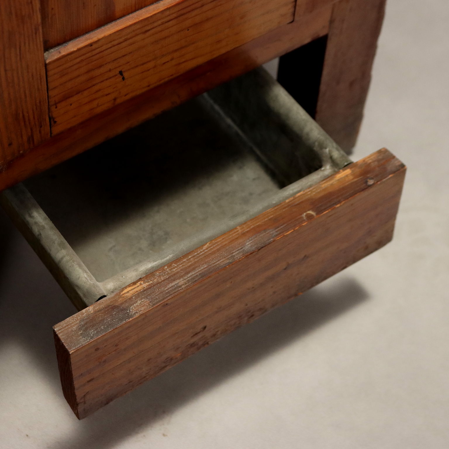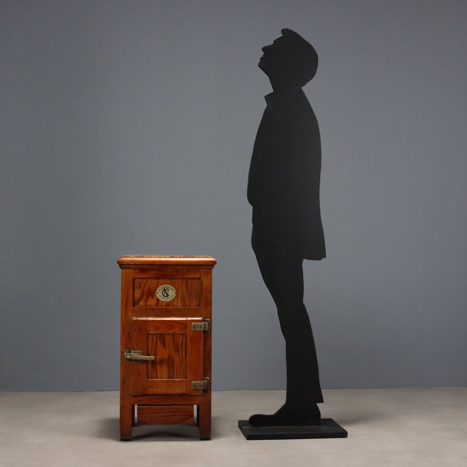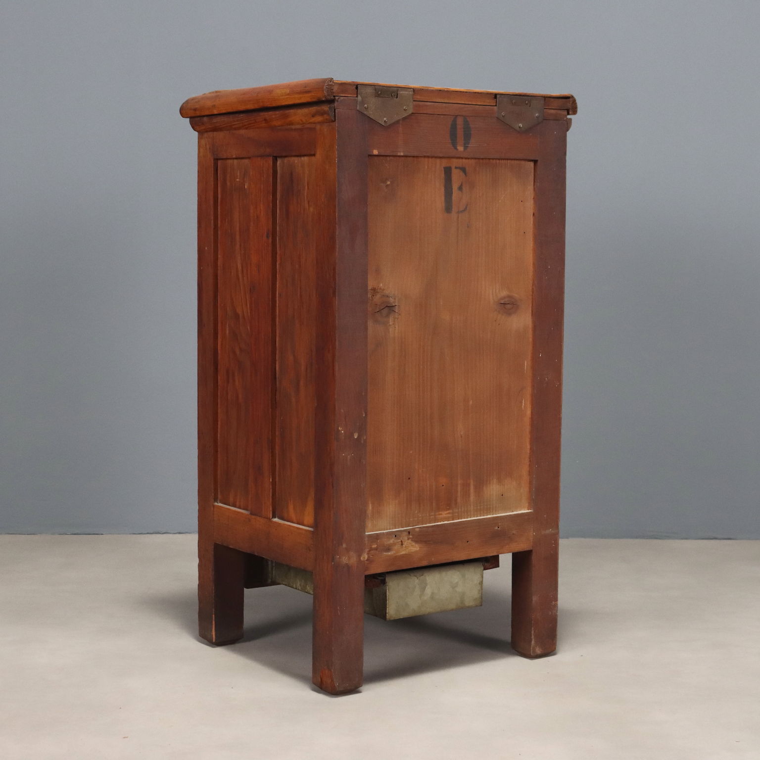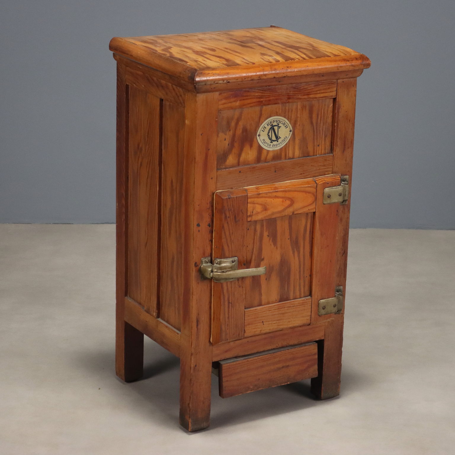 Piccola ghiacciaia in larice “LE REFRIGER”. Piano superiore a ribalta, anta centrale e cassettino di raccolta sottostante. Italia, fine XIX Secolo.
